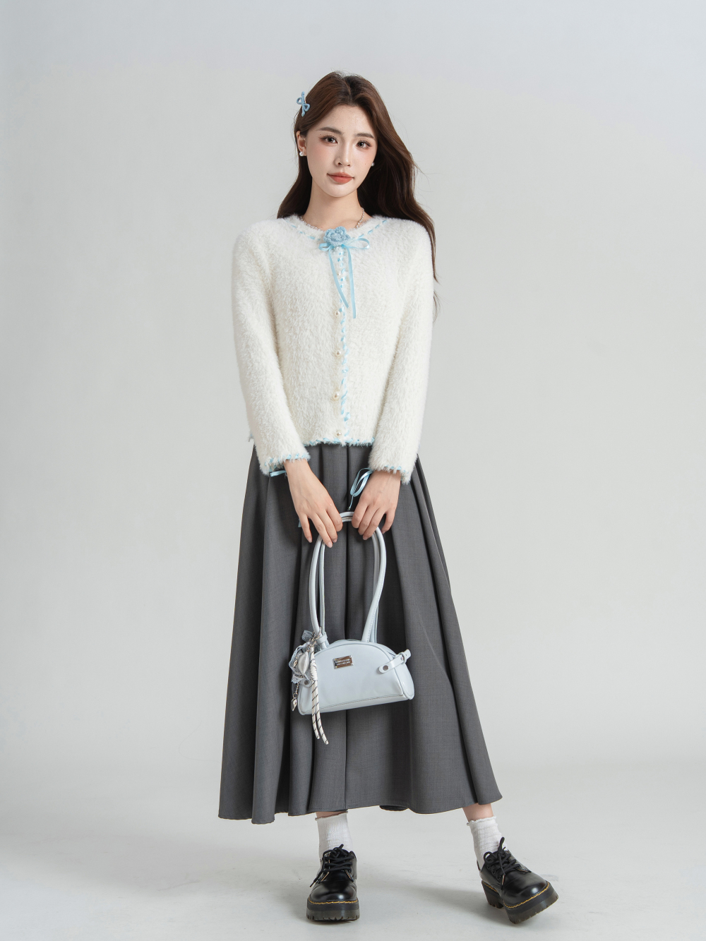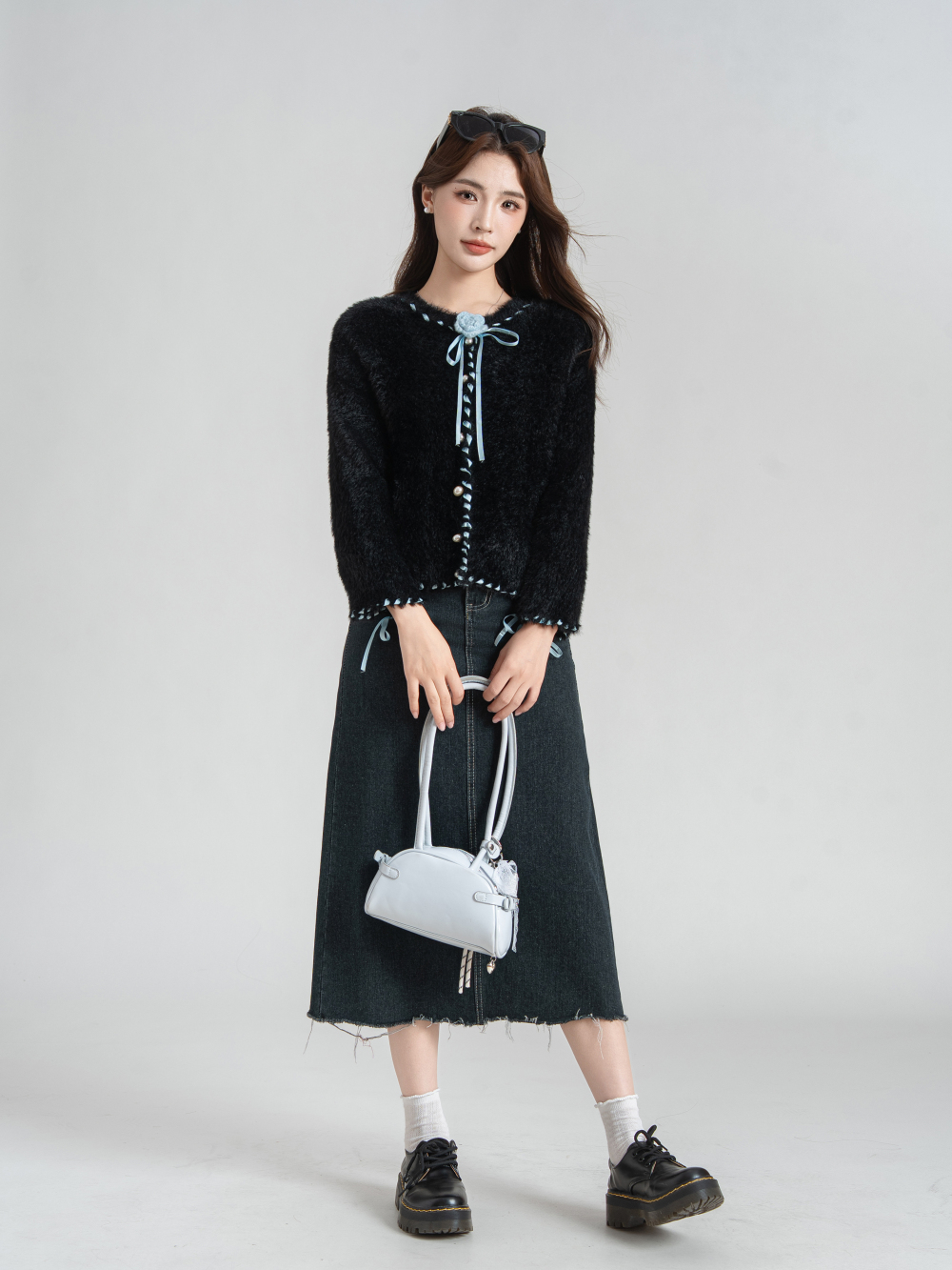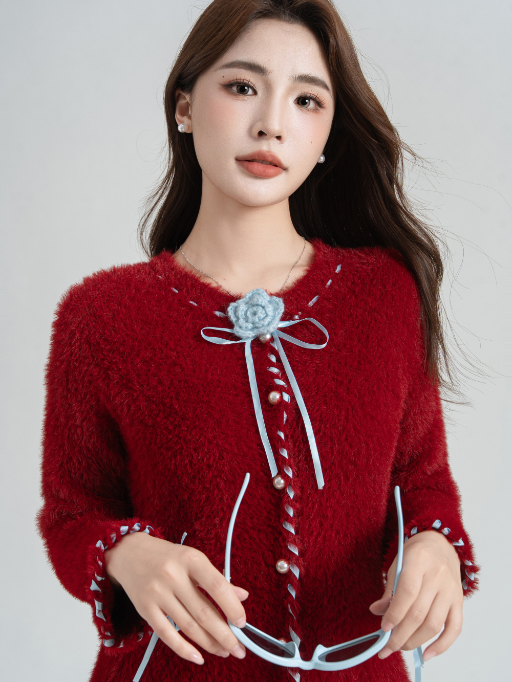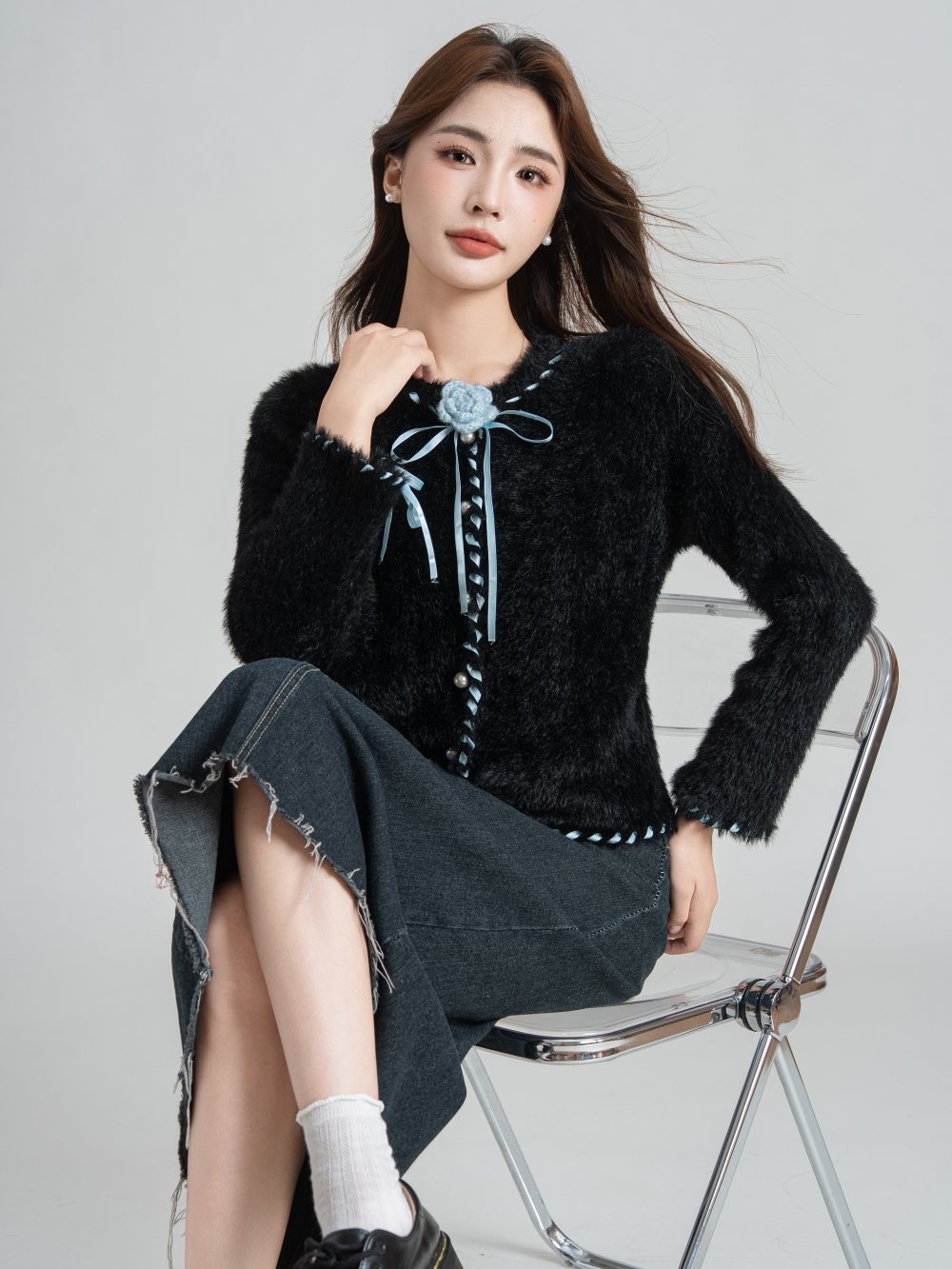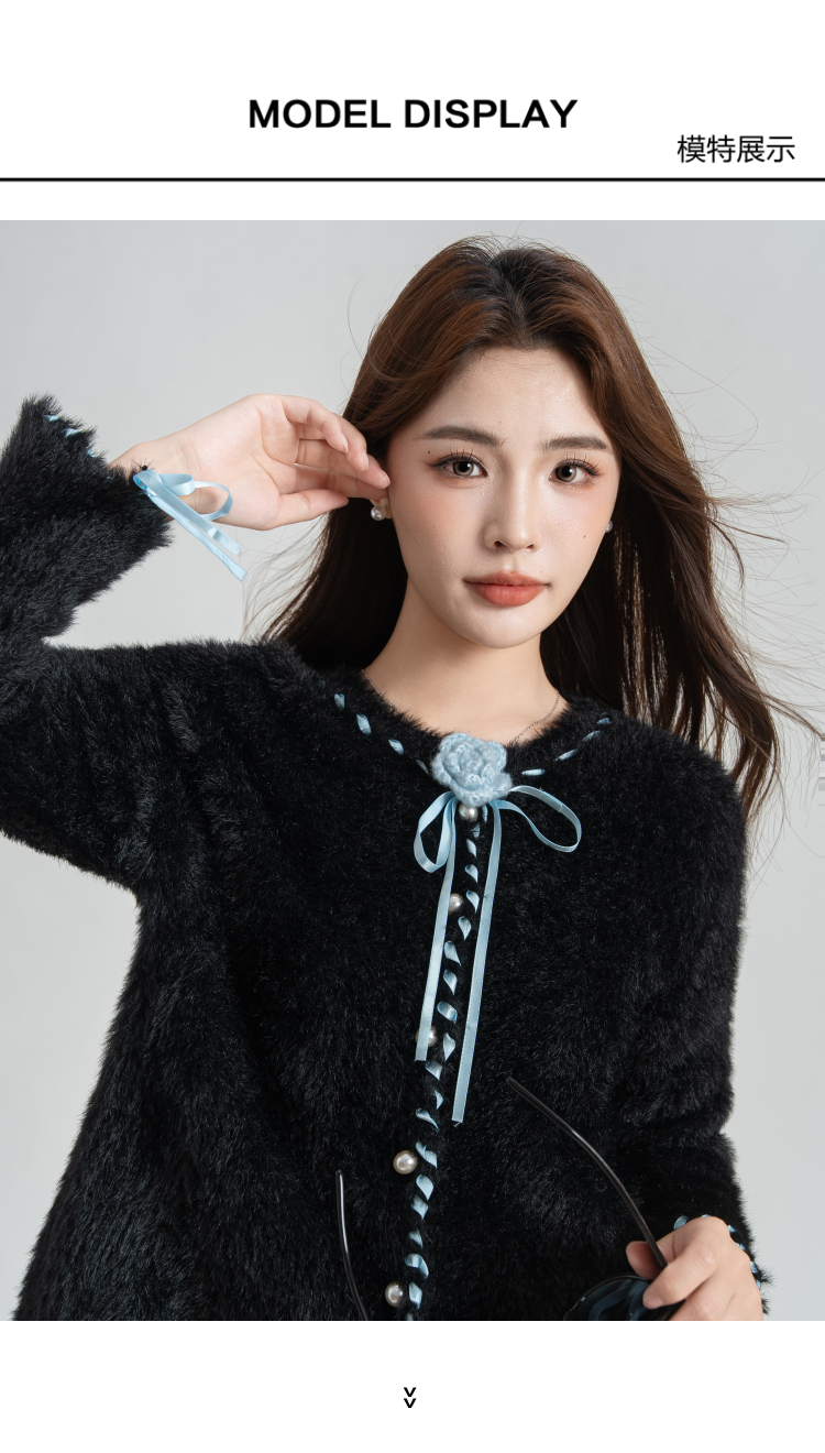 实拍 珍珠扣仿水貂绒针织开衫女甜美软糯风立体花朵小香风毛衣