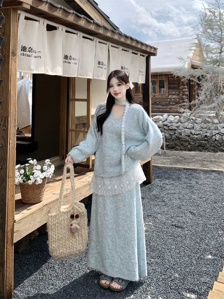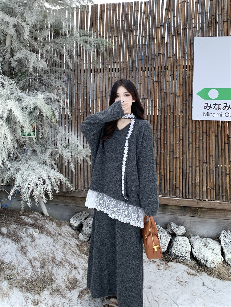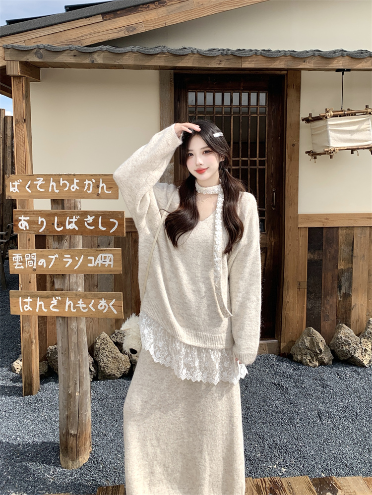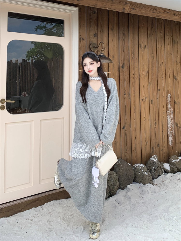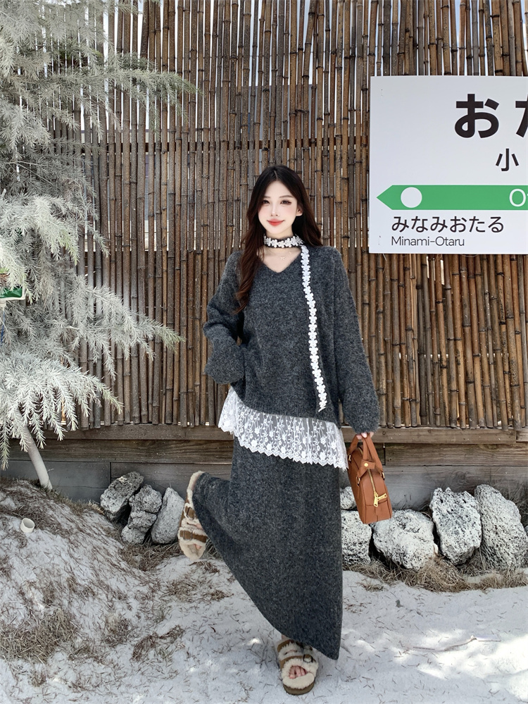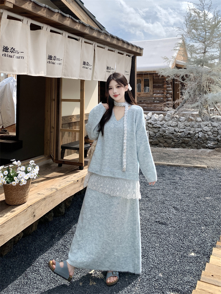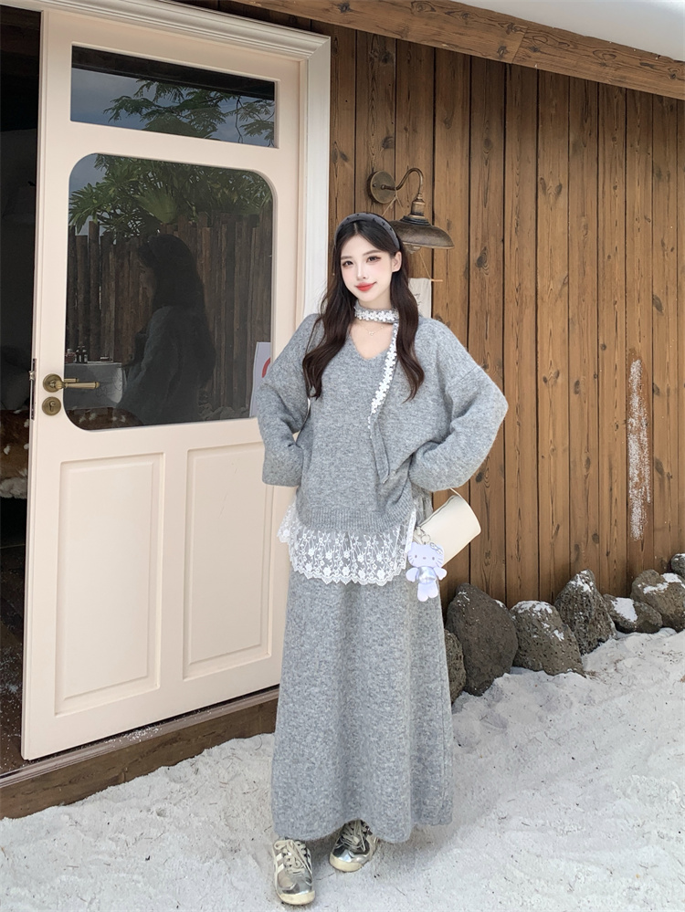 实拍大码秋冬法式温柔慵懒风V领蕾丝拼接针织衫上衣+半身裙套装