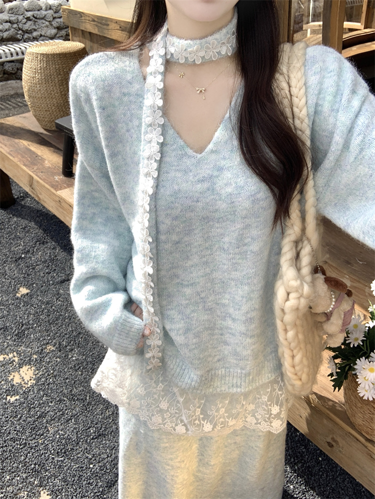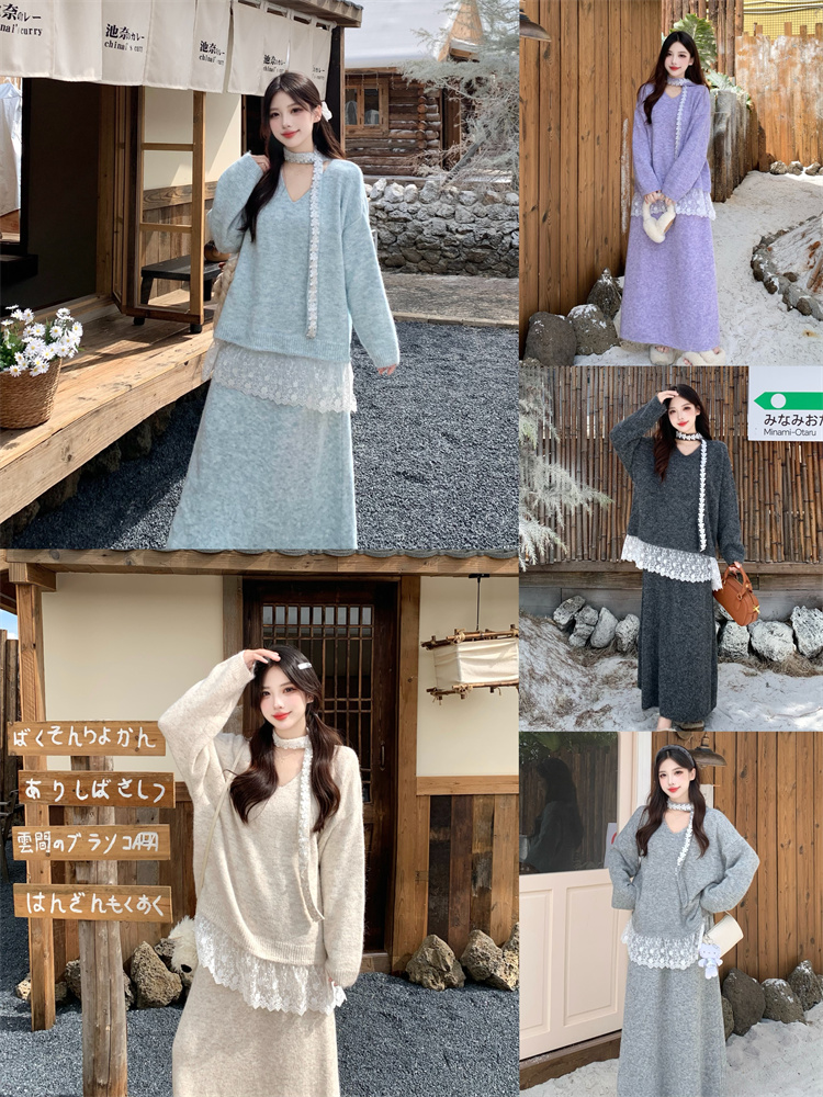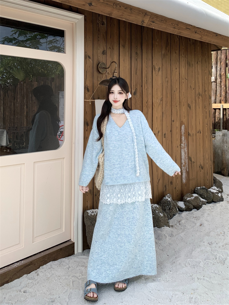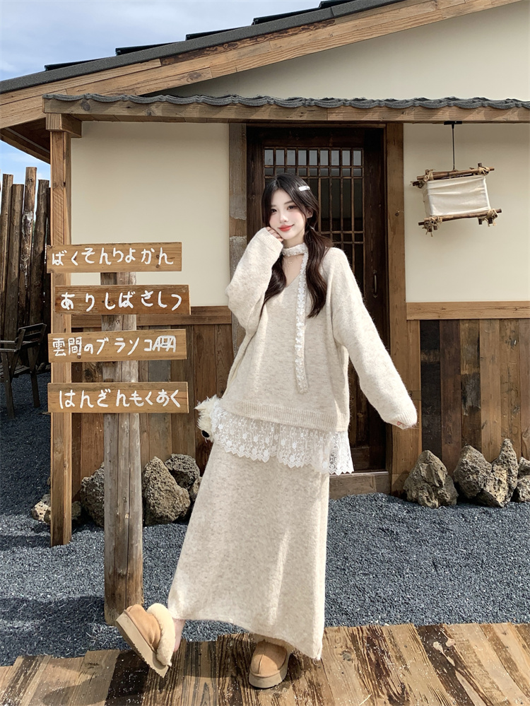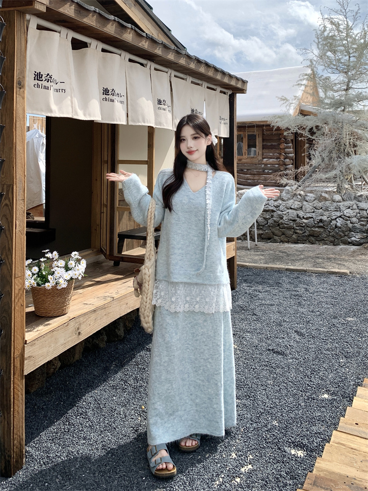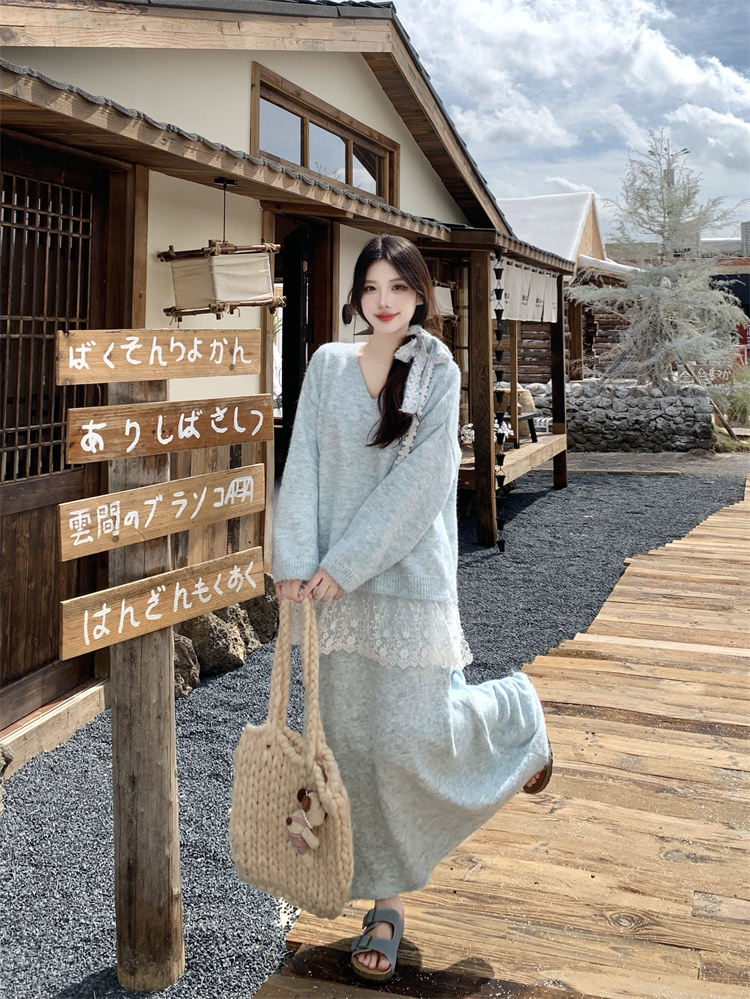 实拍大码秋冬法式温柔慵懒风V领蕾丝拼接针织衫上衣+半身裙套装