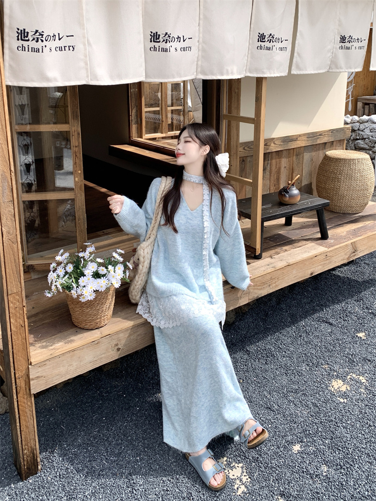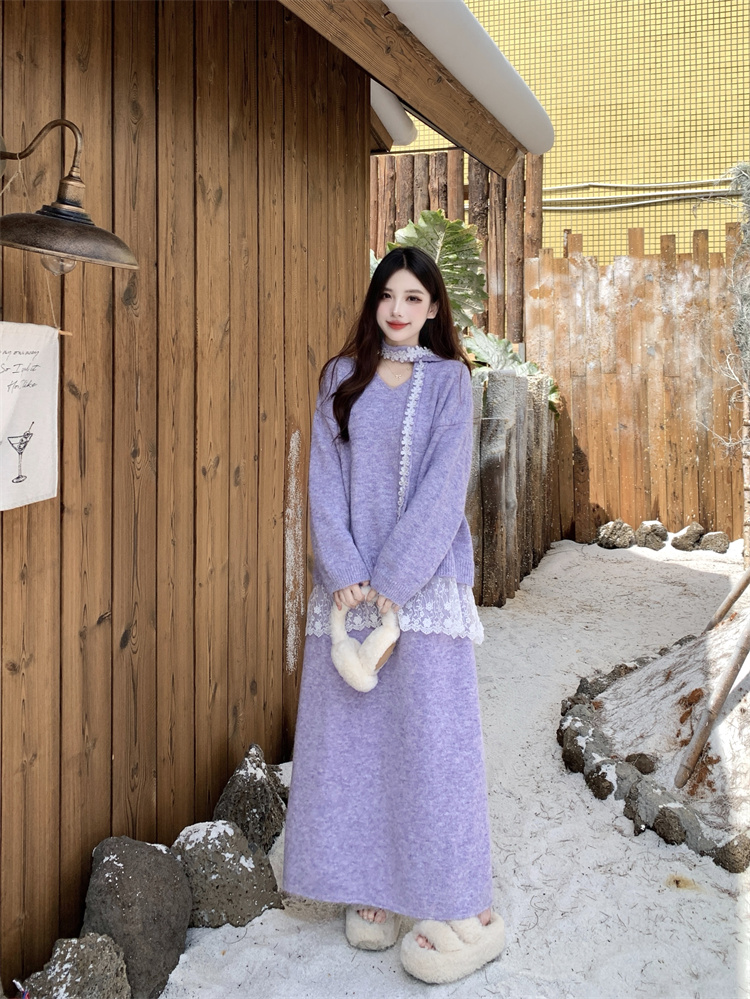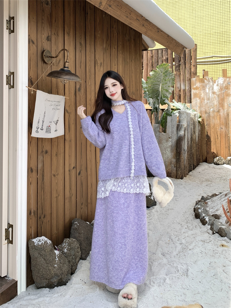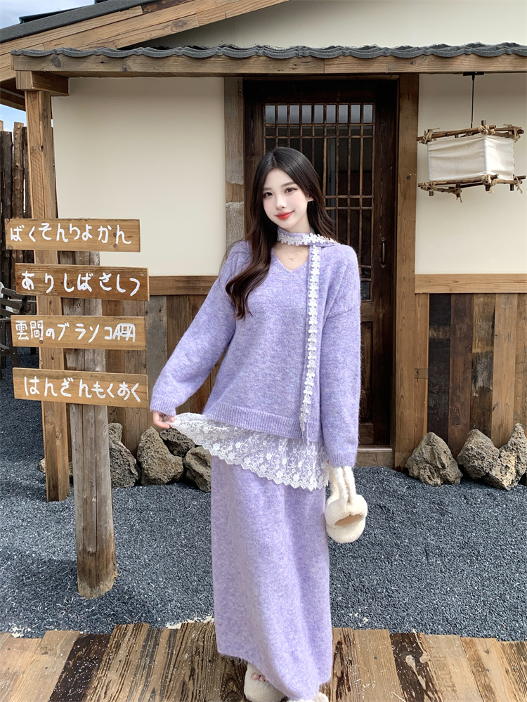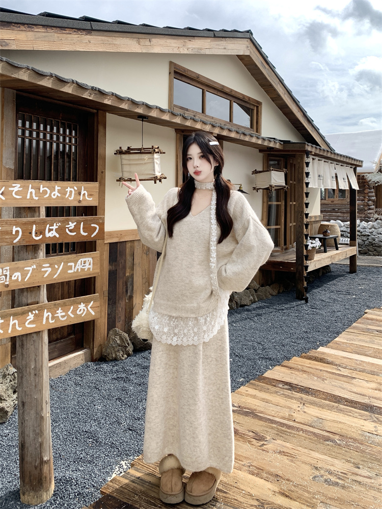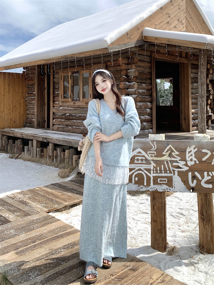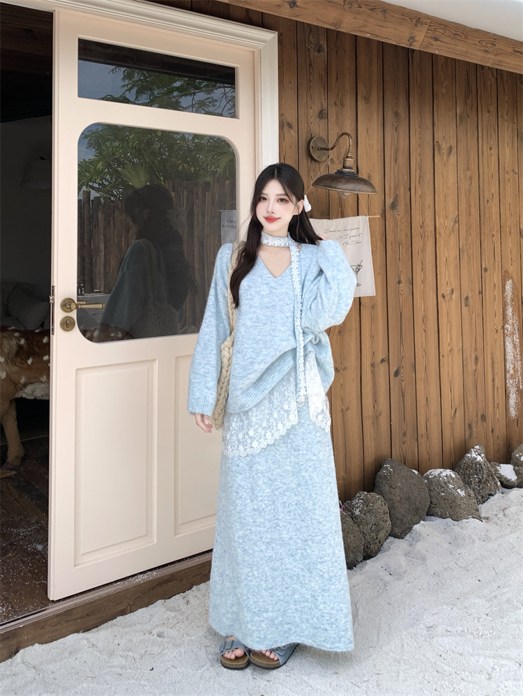 实拍大码秋冬法式温柔慵懒风V领蕾丝拼接针织衫上衣+半身裙套装
