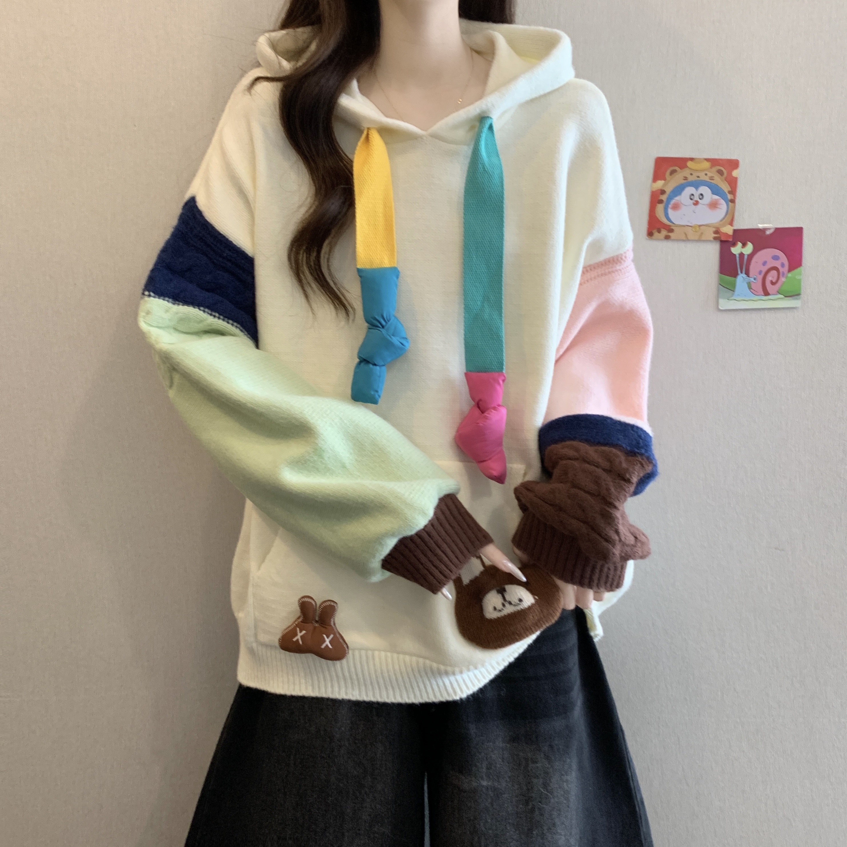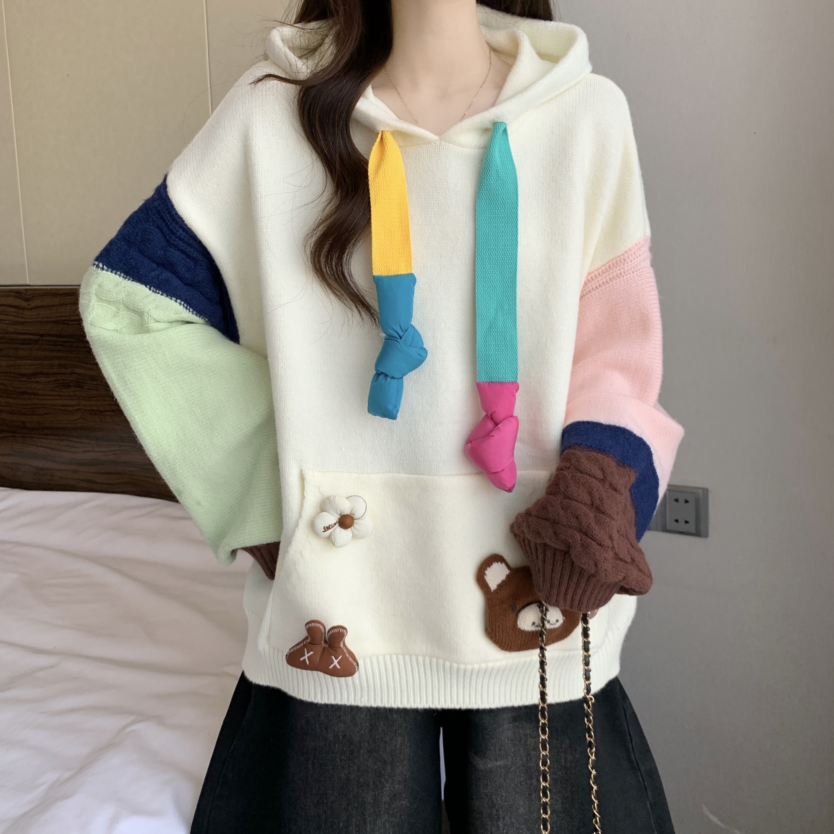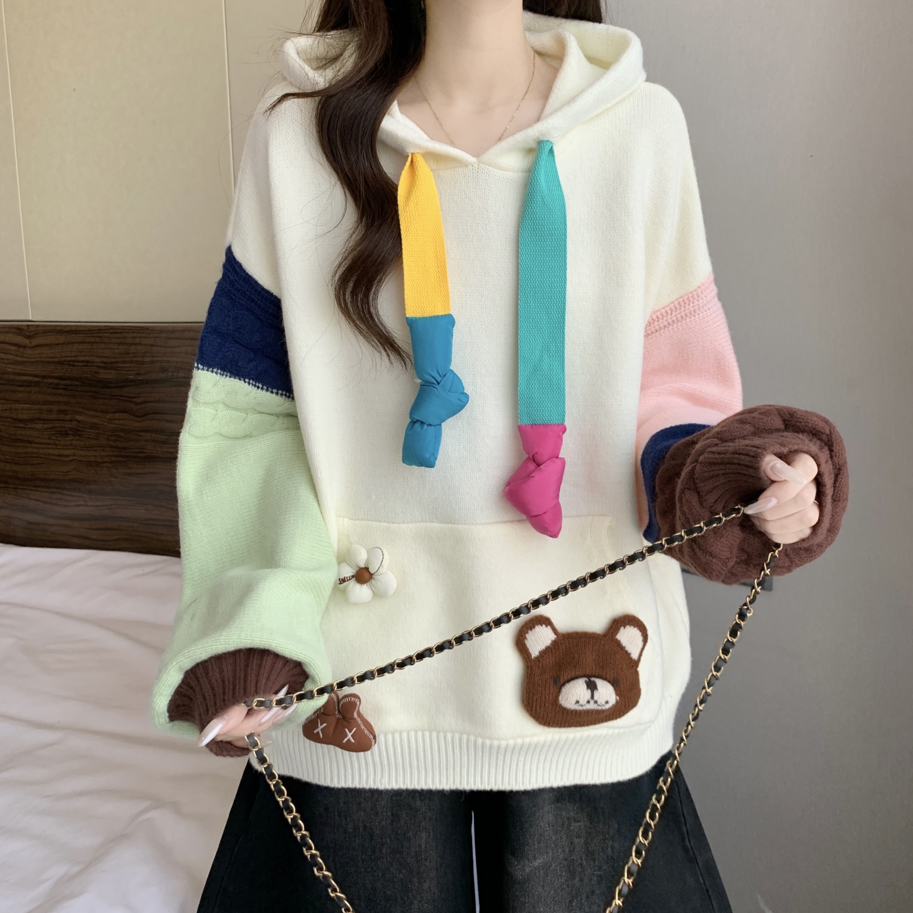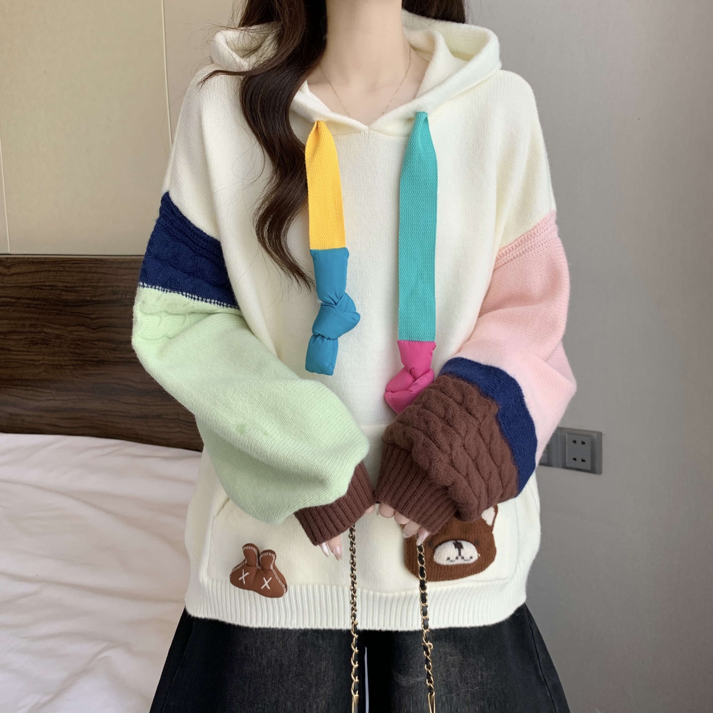 大码胖mm秋冬季新款撞色连帽毛衣卫衣设计感洋气减龄针织上衣