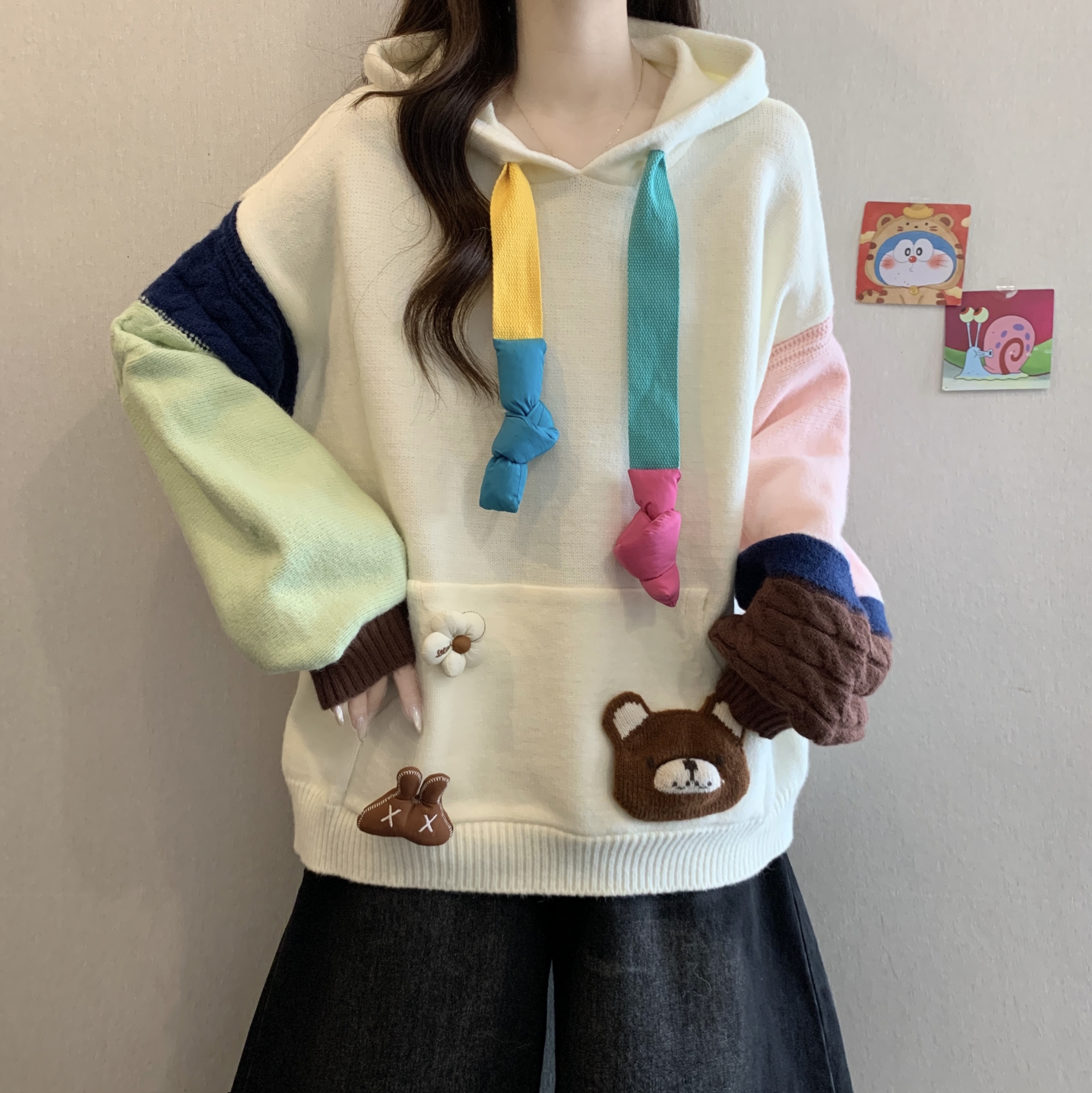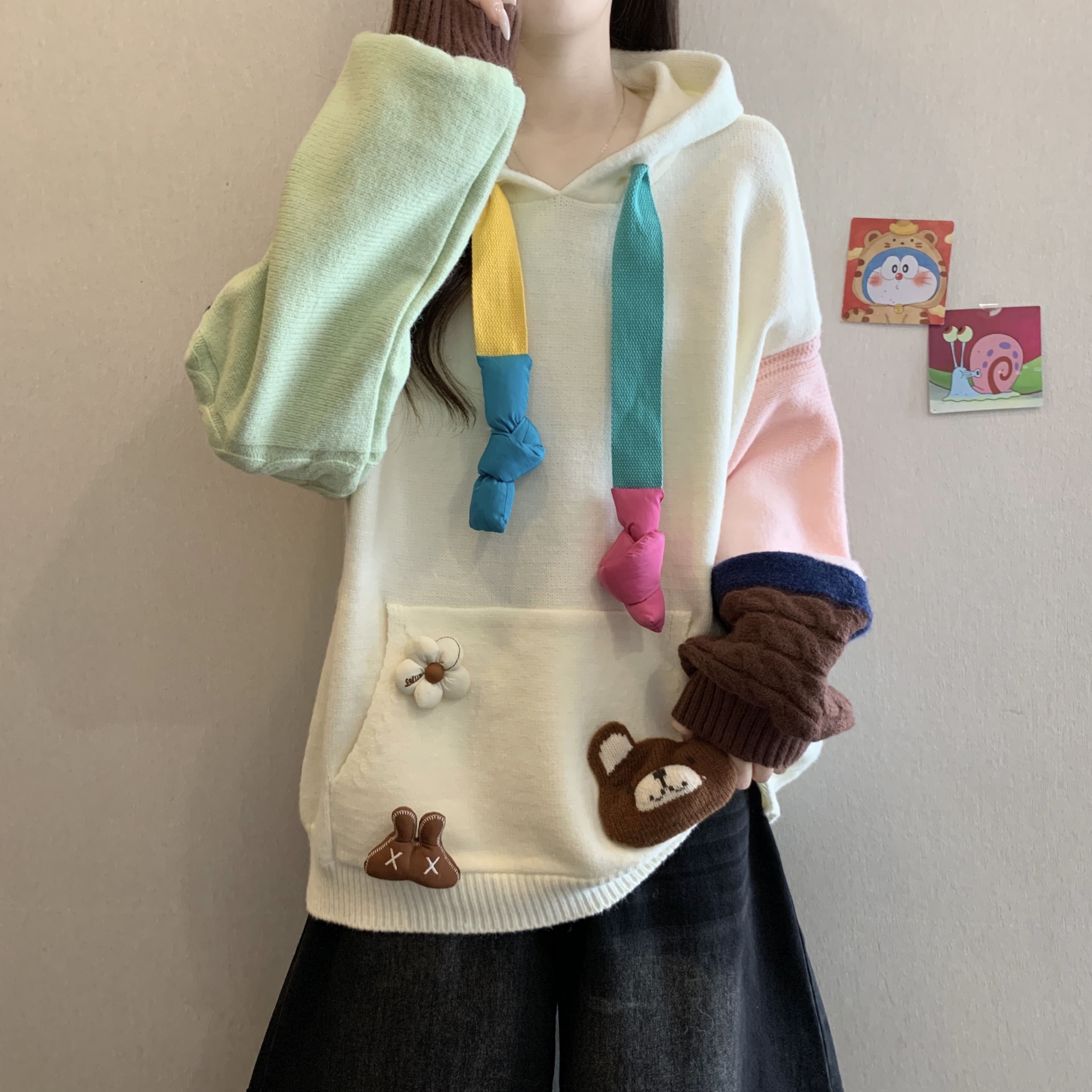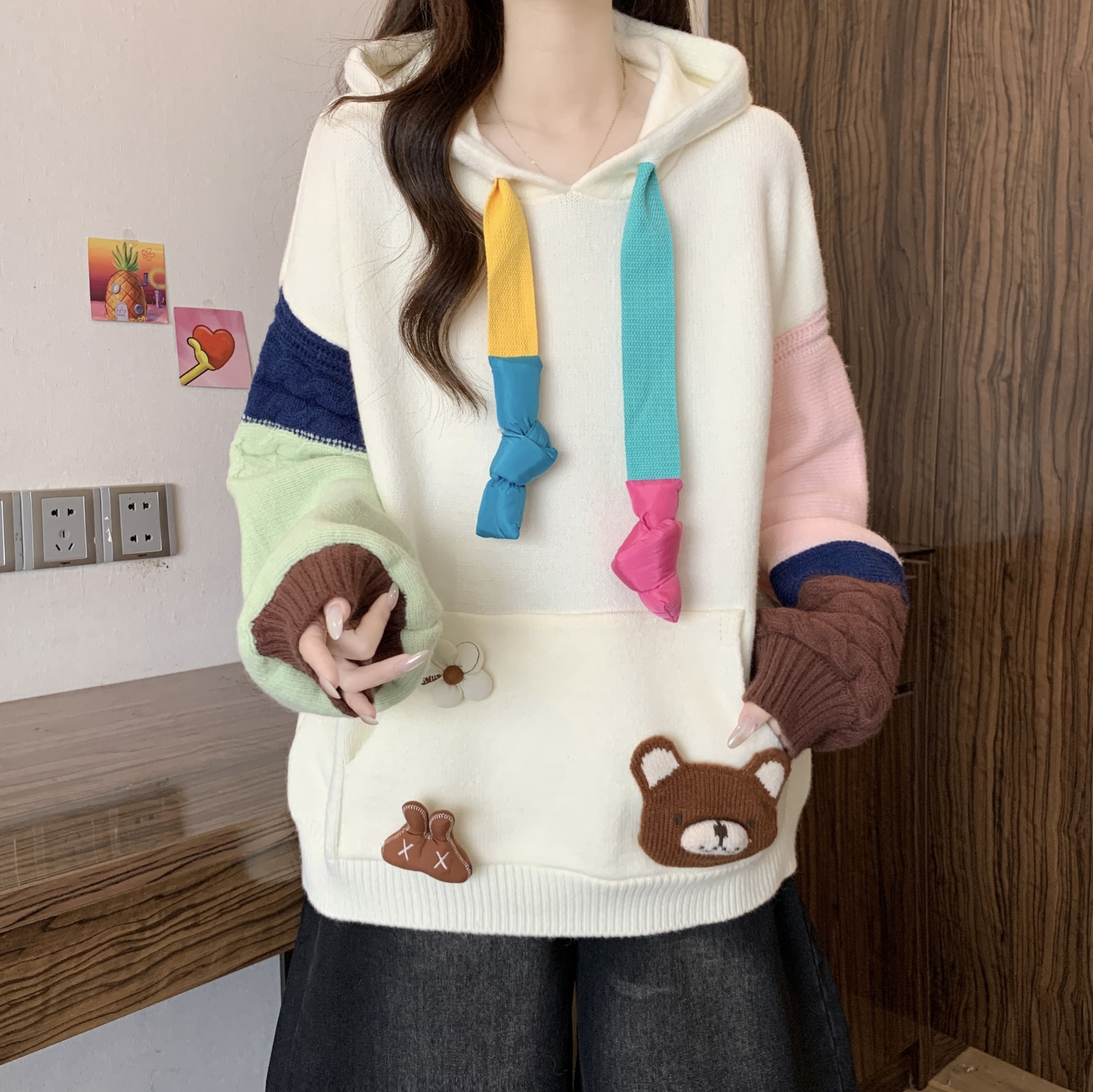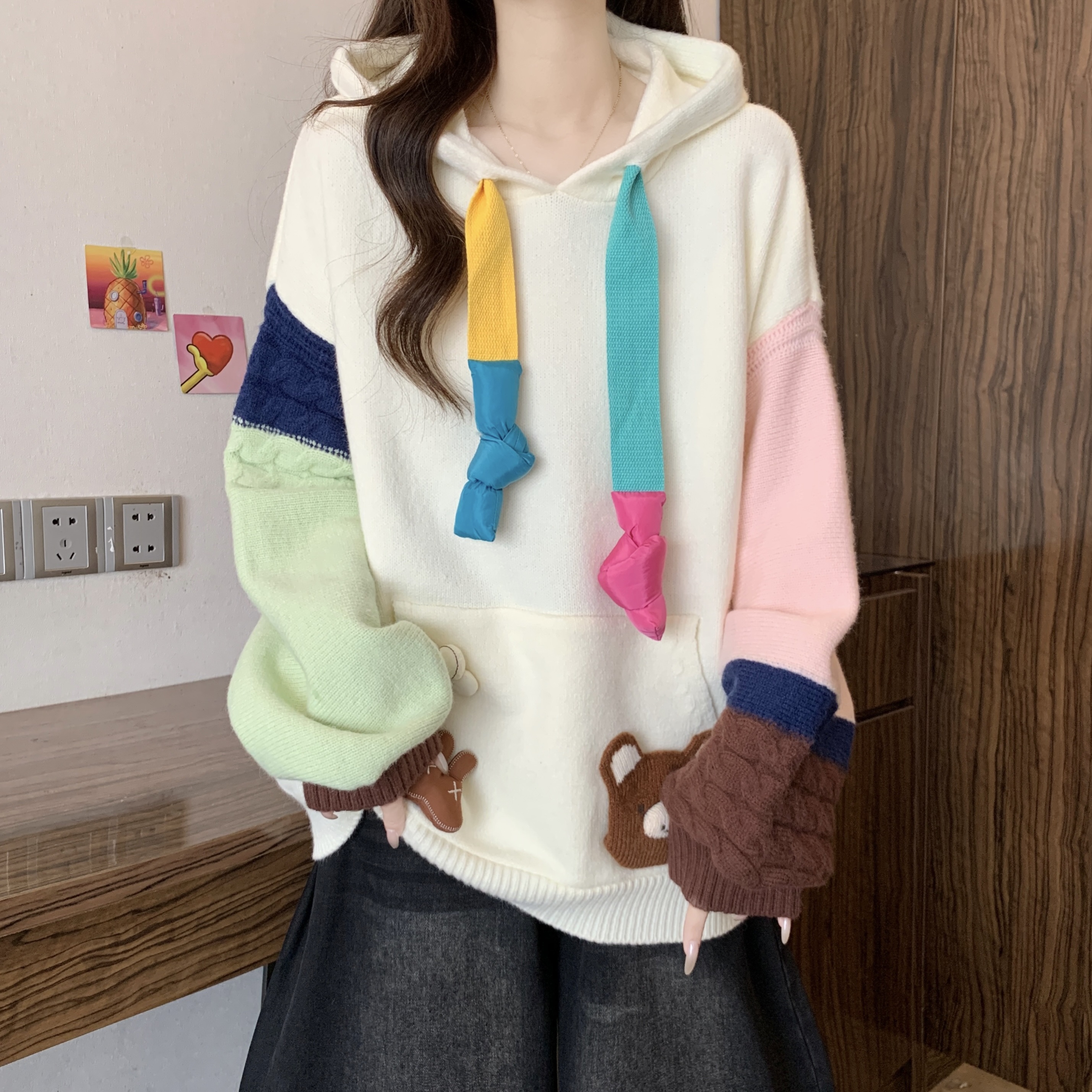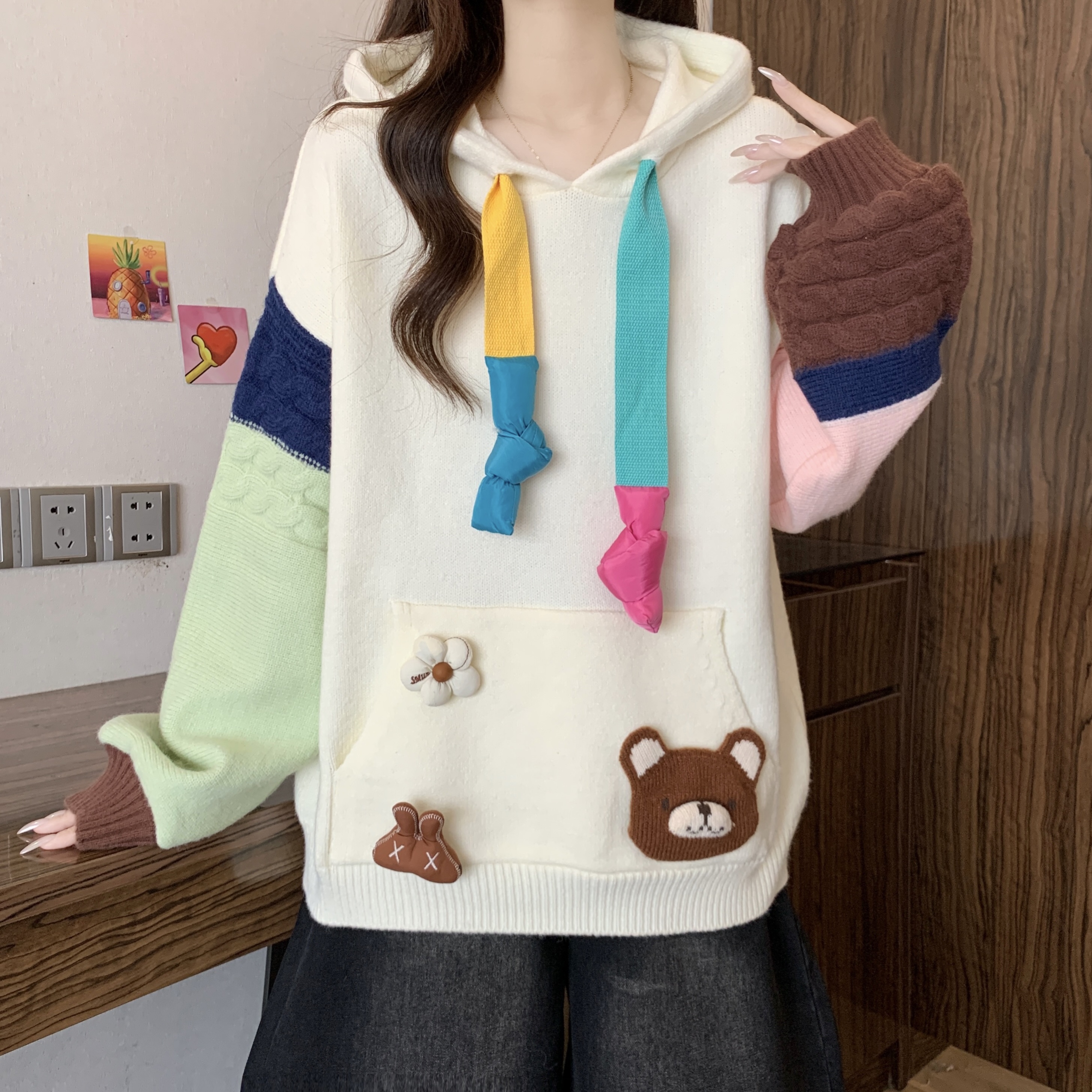 大码胖mm秋冬季新款撞色连帽毛衣卫衣设计感洋气减龄针织上衣