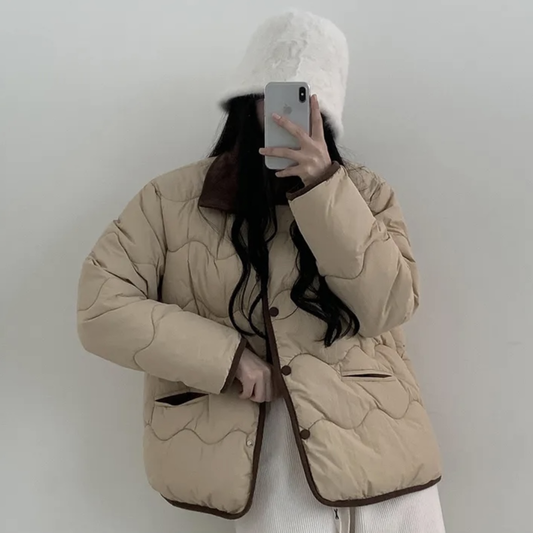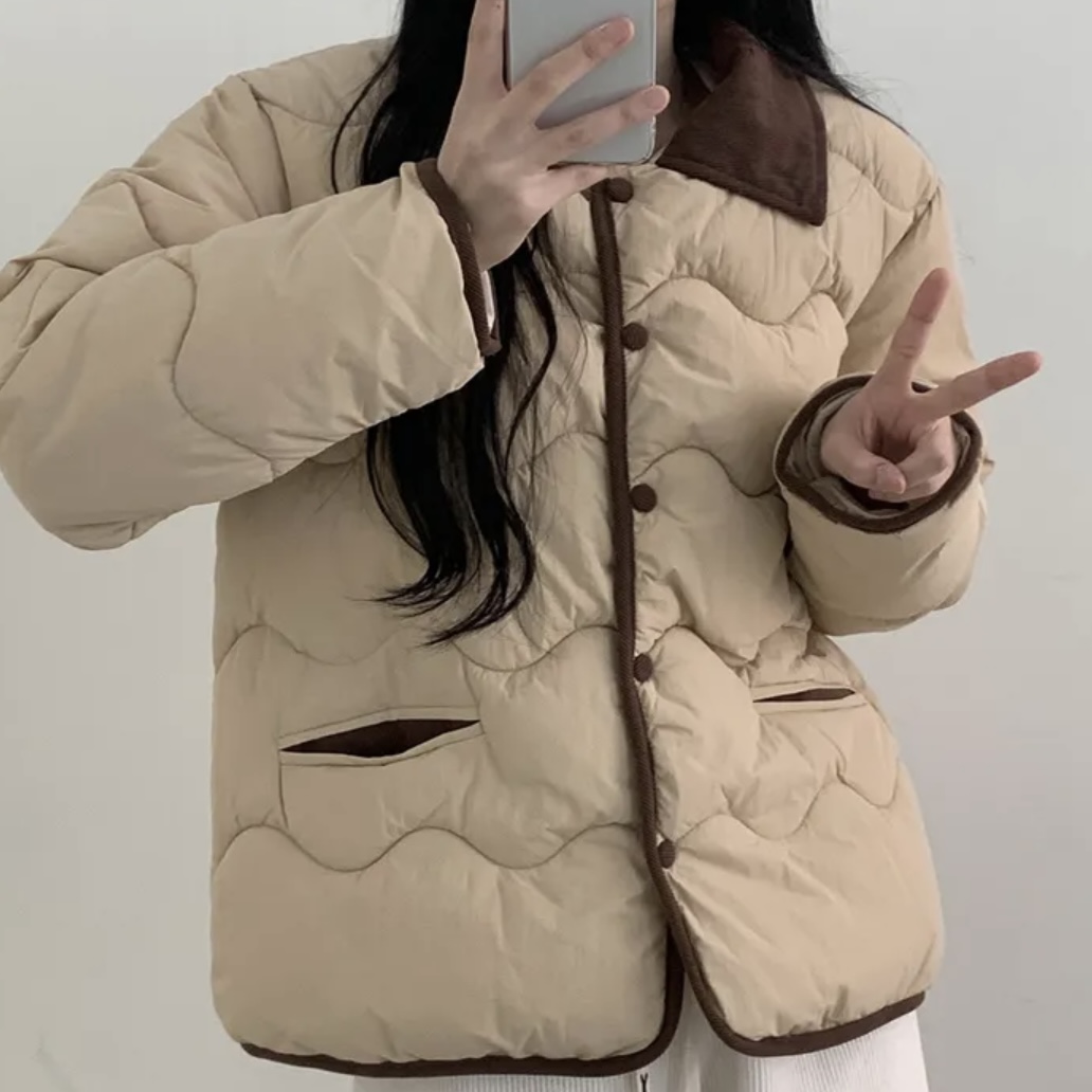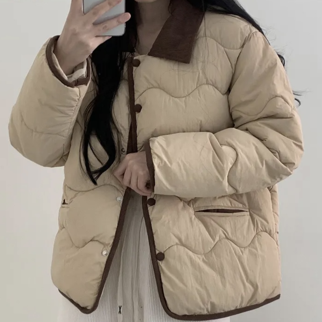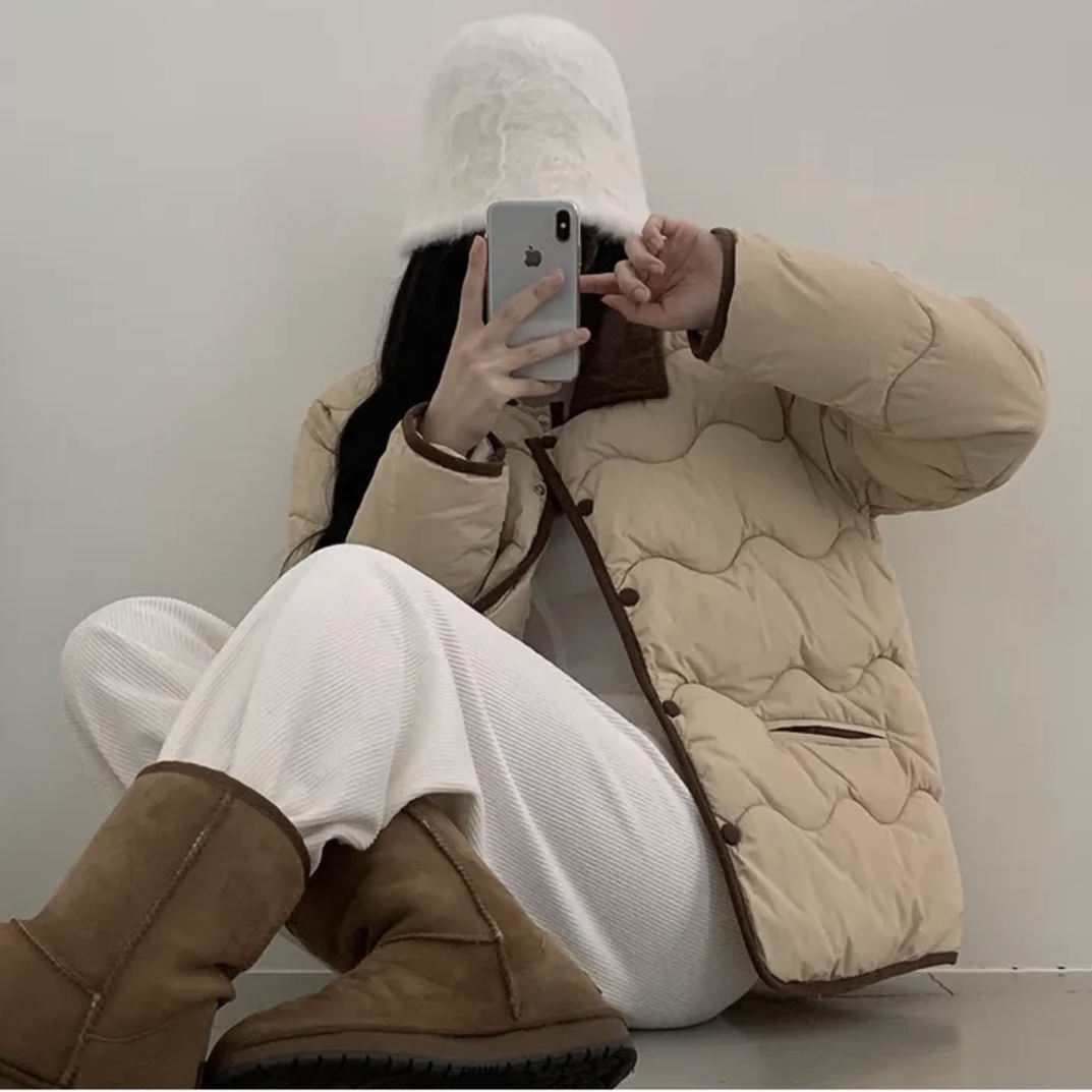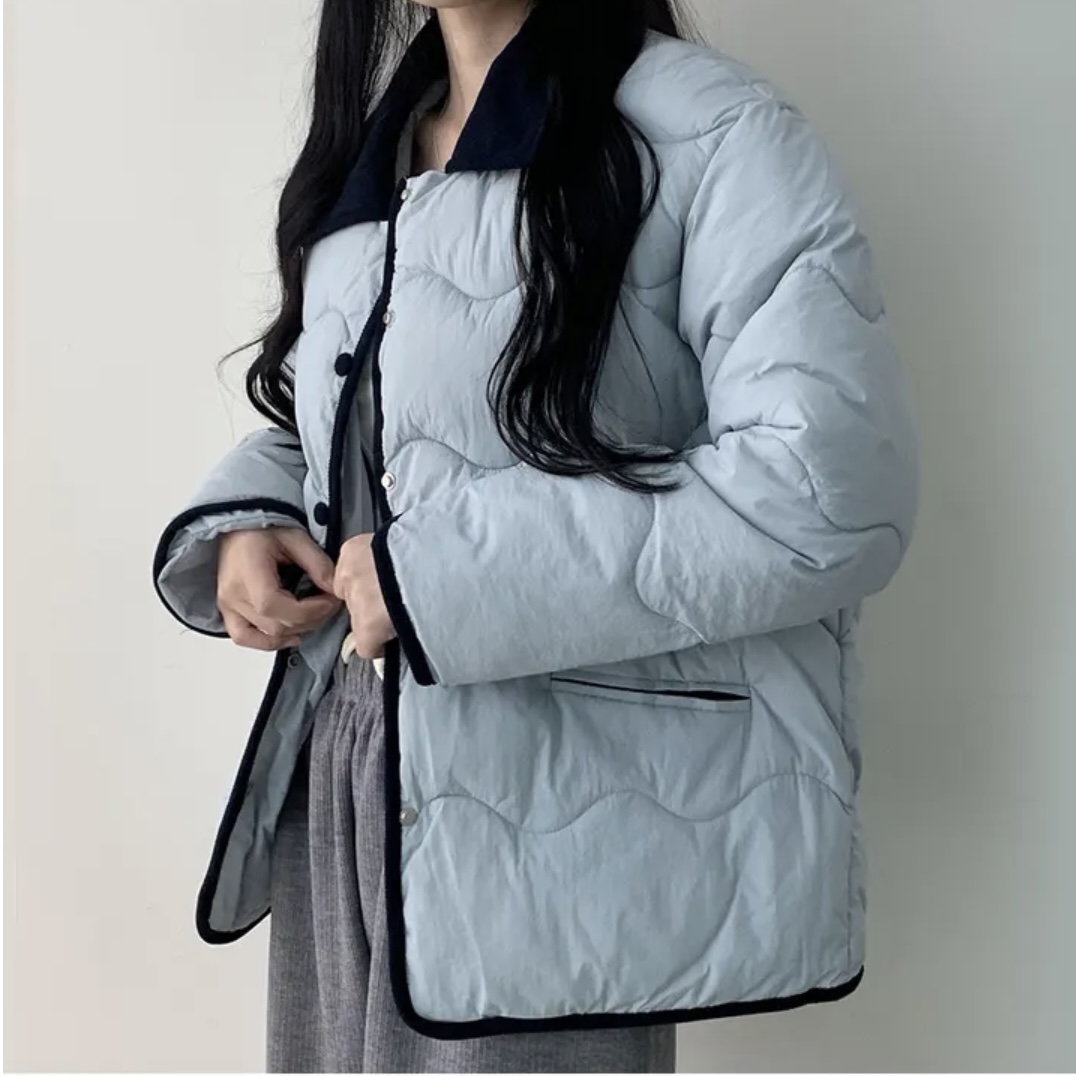 有货 韩国chic灯芯绒翻领棉服轻薄羽绒服女短款小香风时尚外套