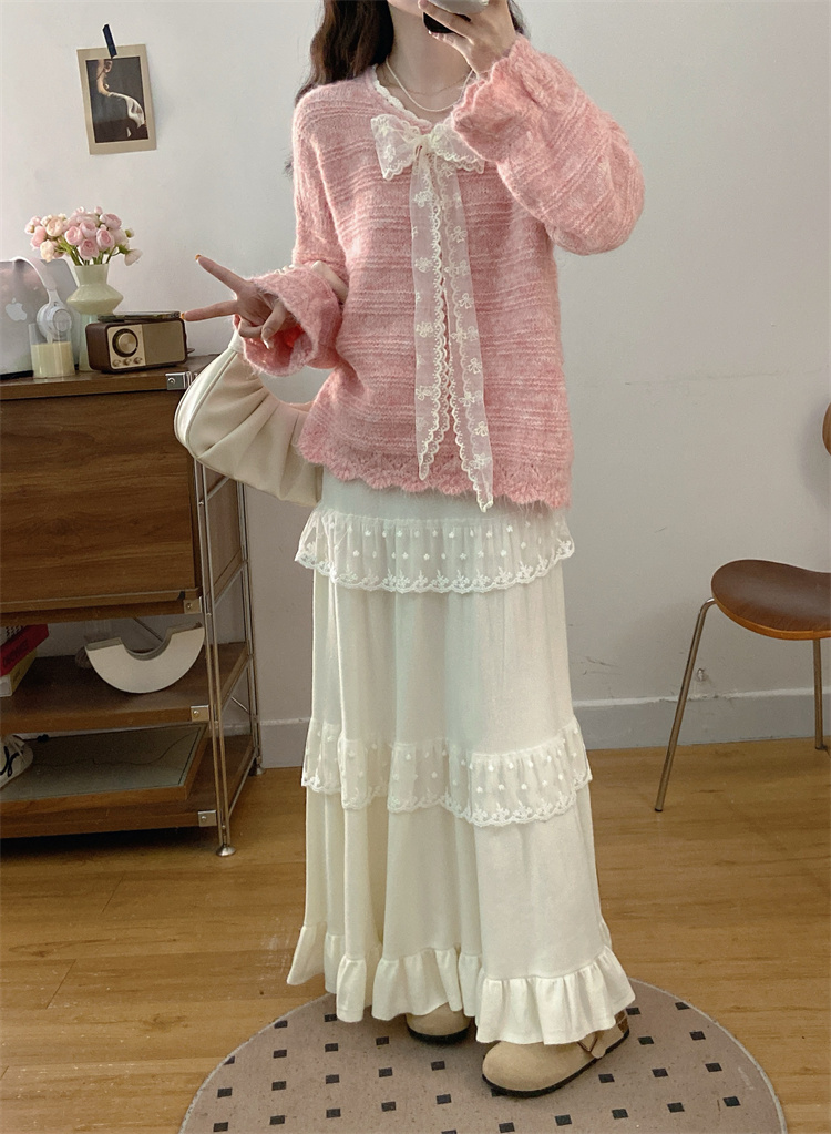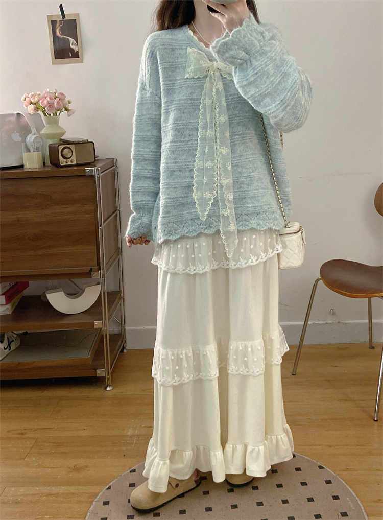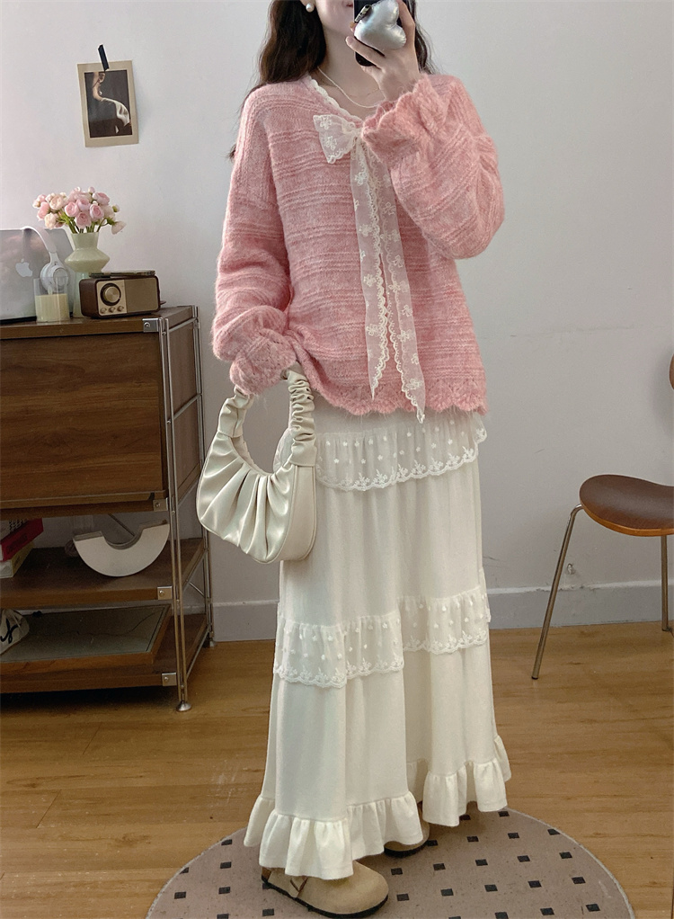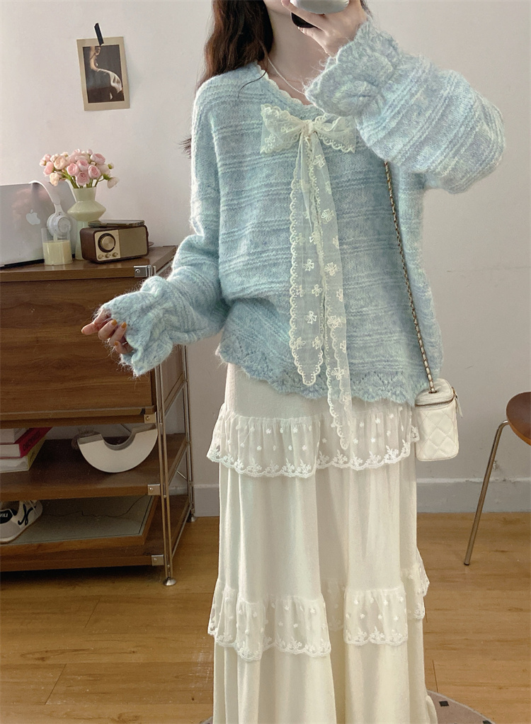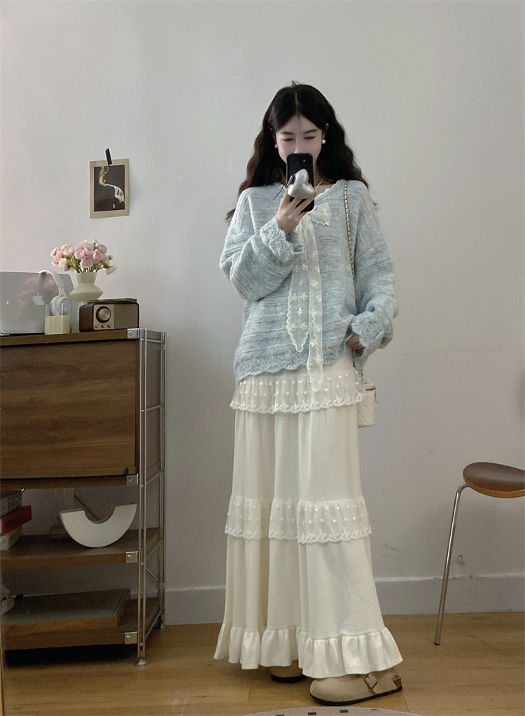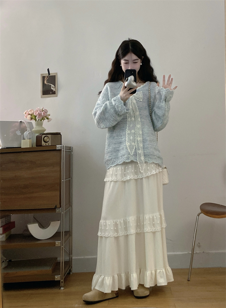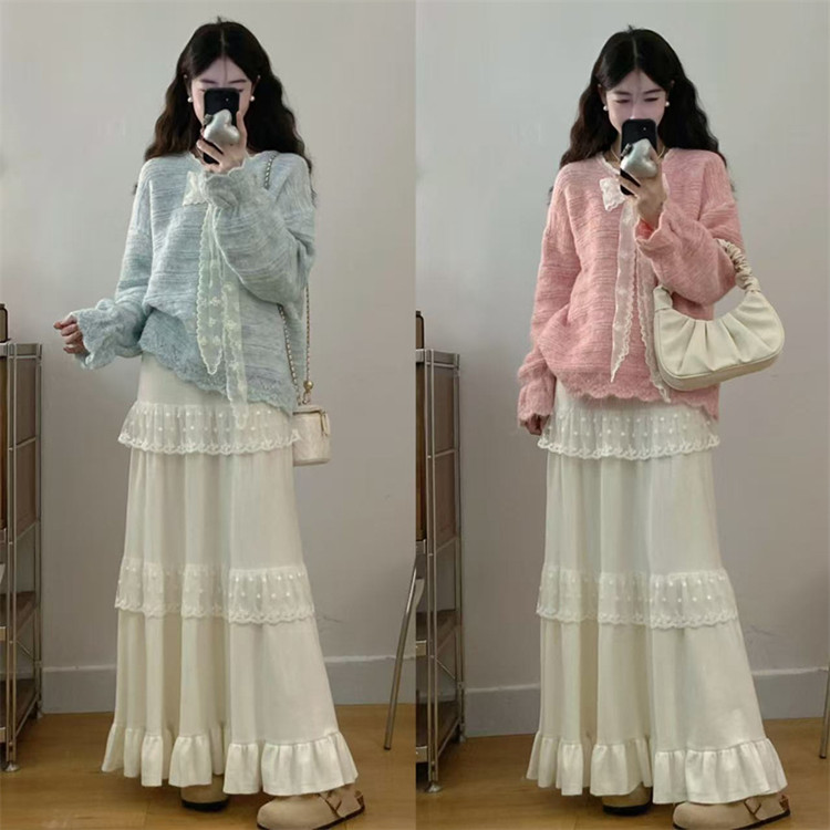 实拍大码高级感蝴蝶结蕾丝V领针织毛衣+针织蛋糕半身裙胖mm两件套
