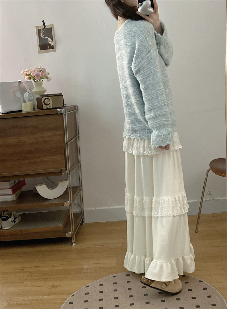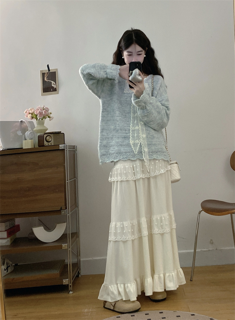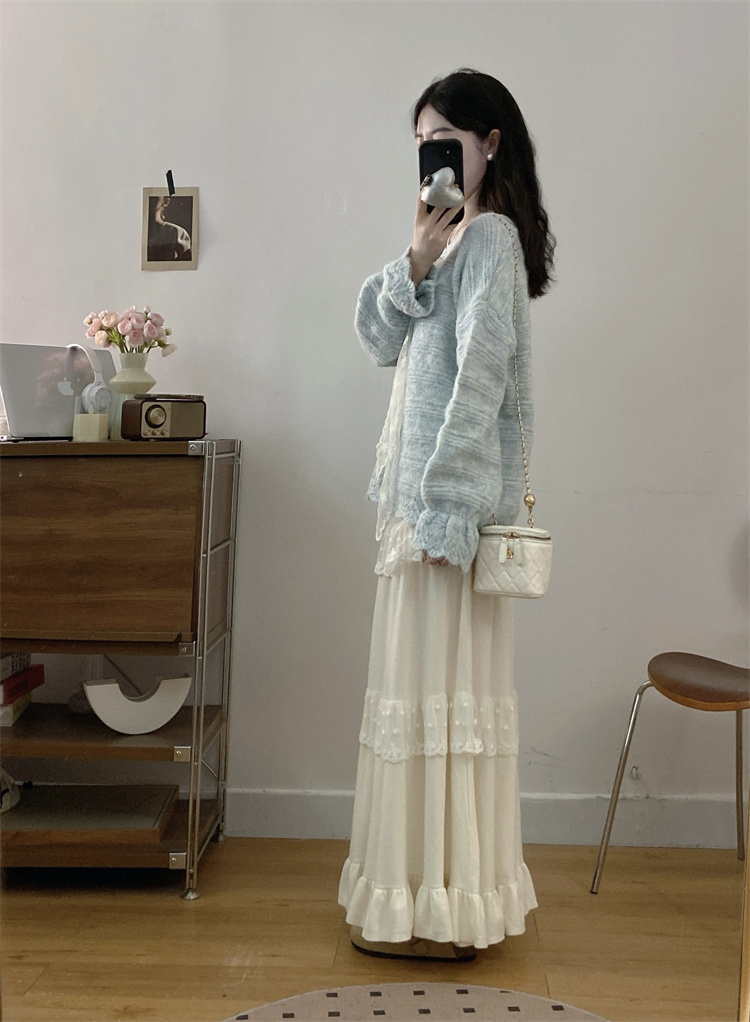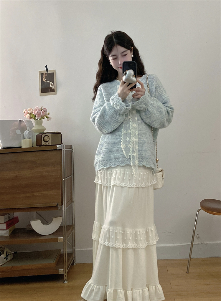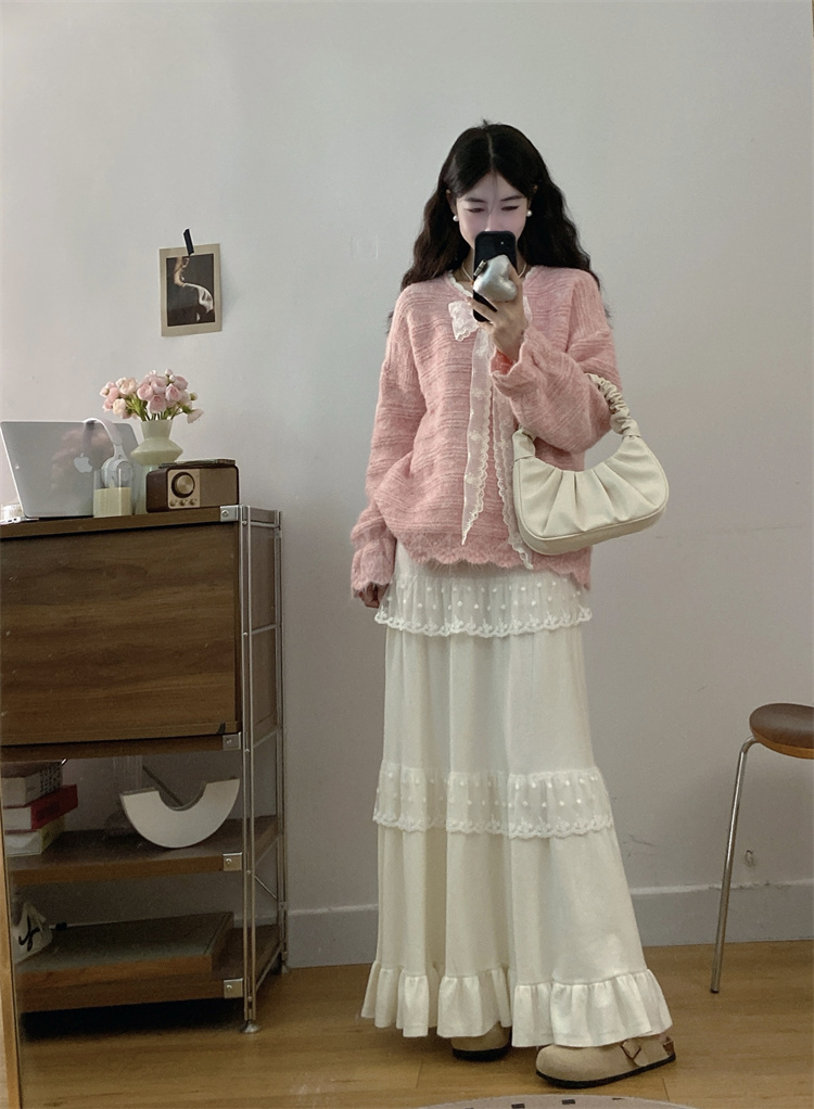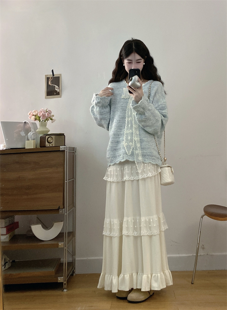 实拍大码高级感蝴蝶结蕾丝V领针织毛衣+针织蛋糕半身裙胖mm两件套
