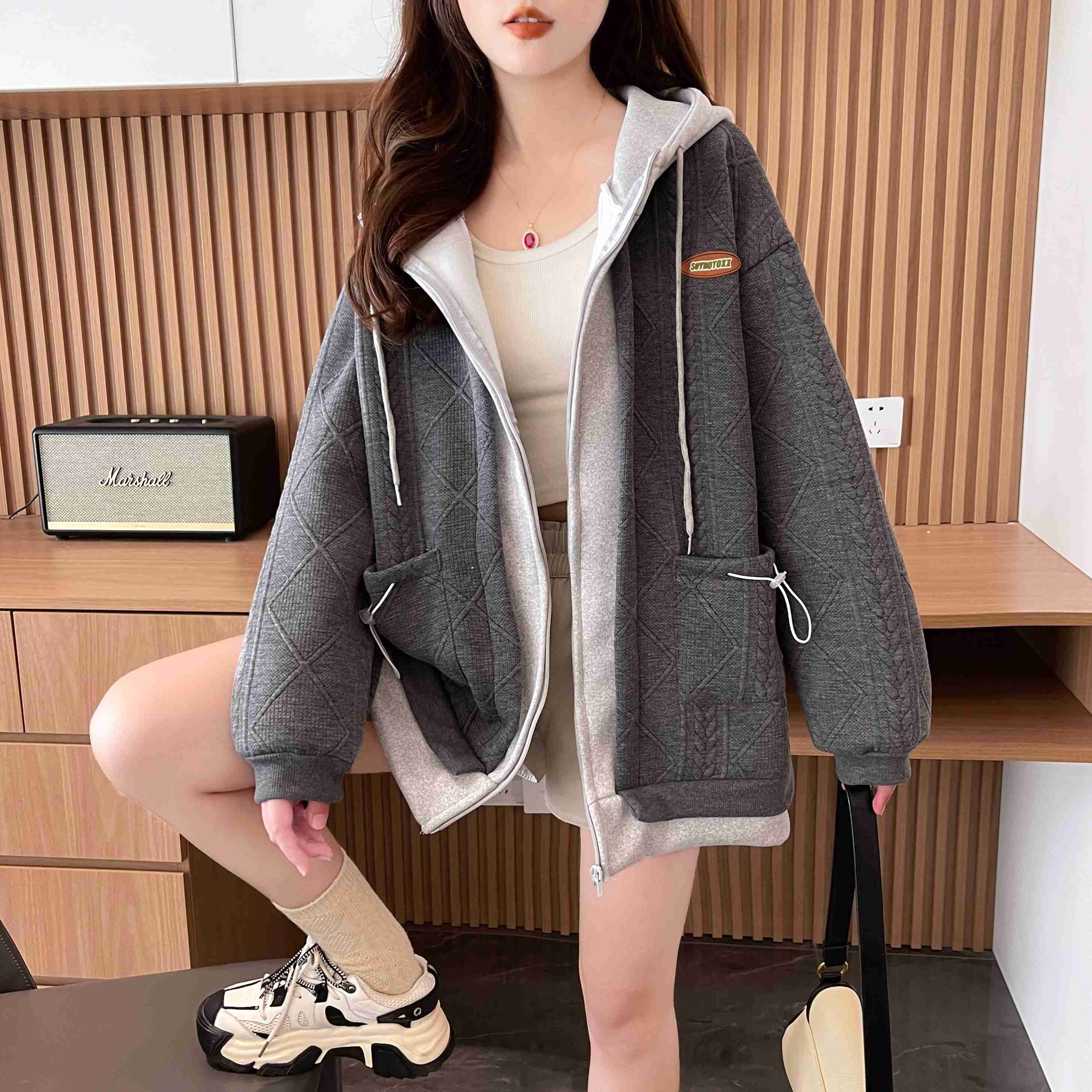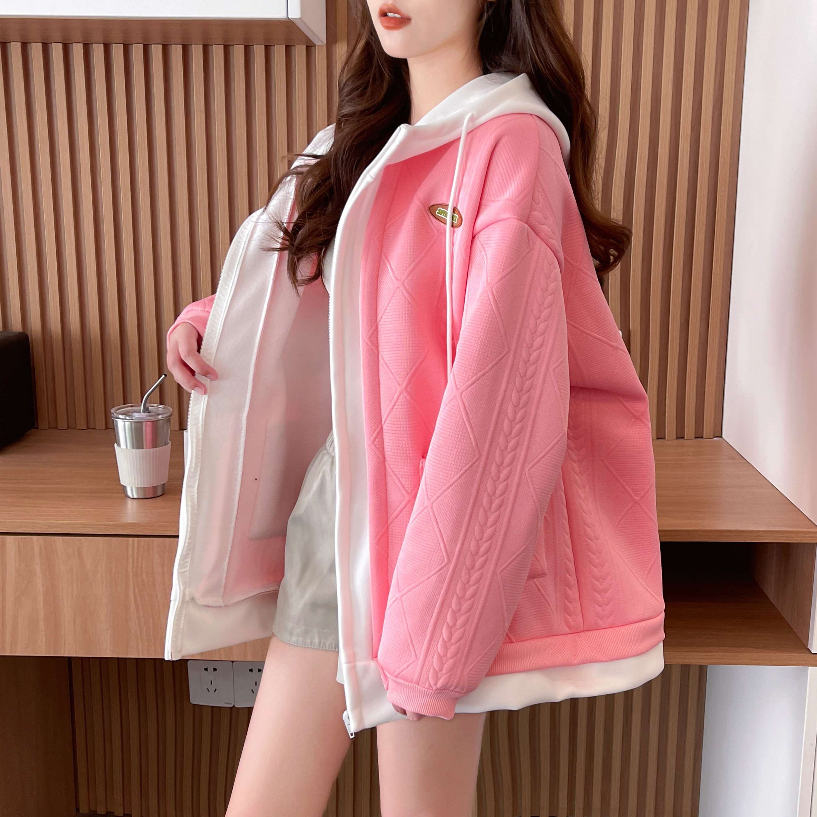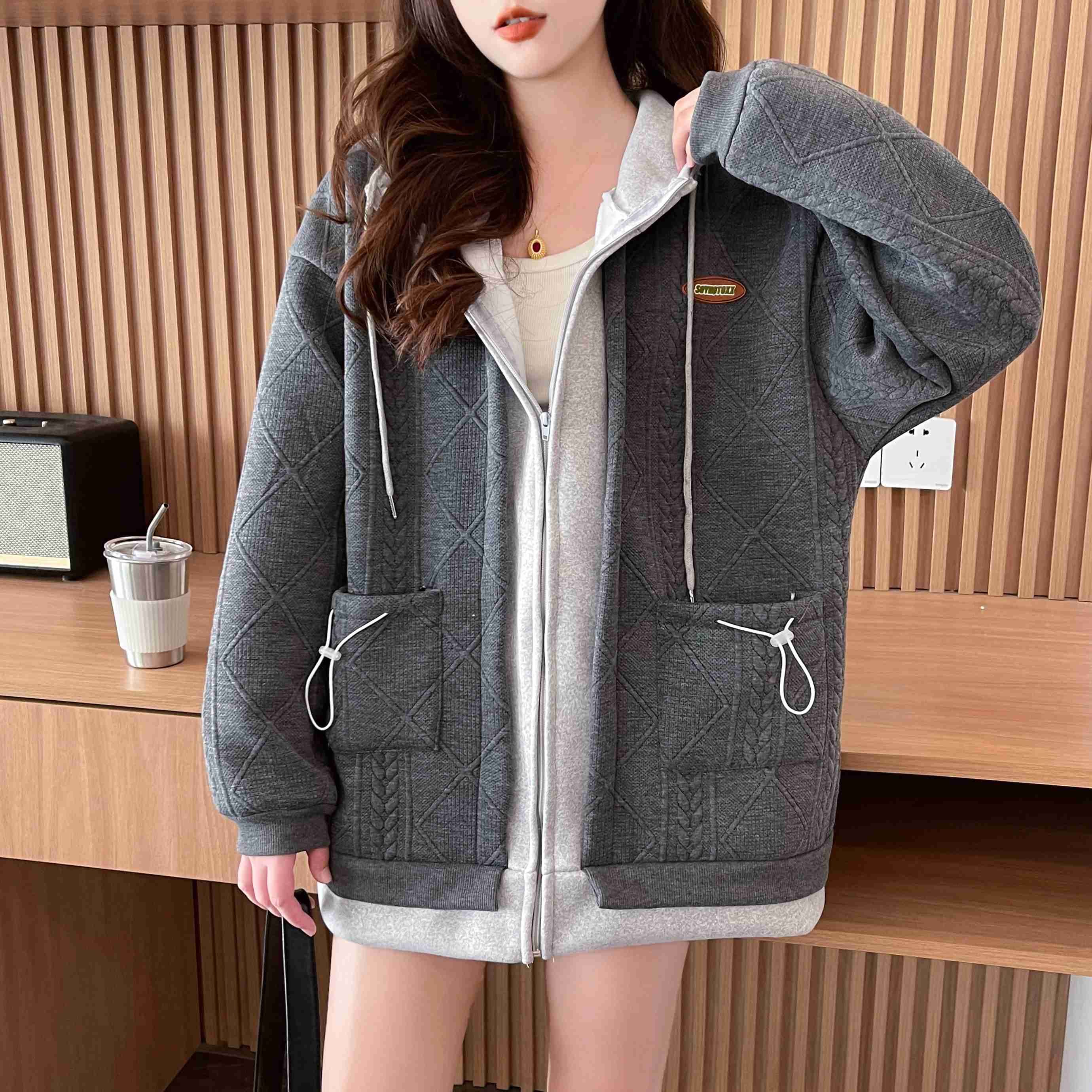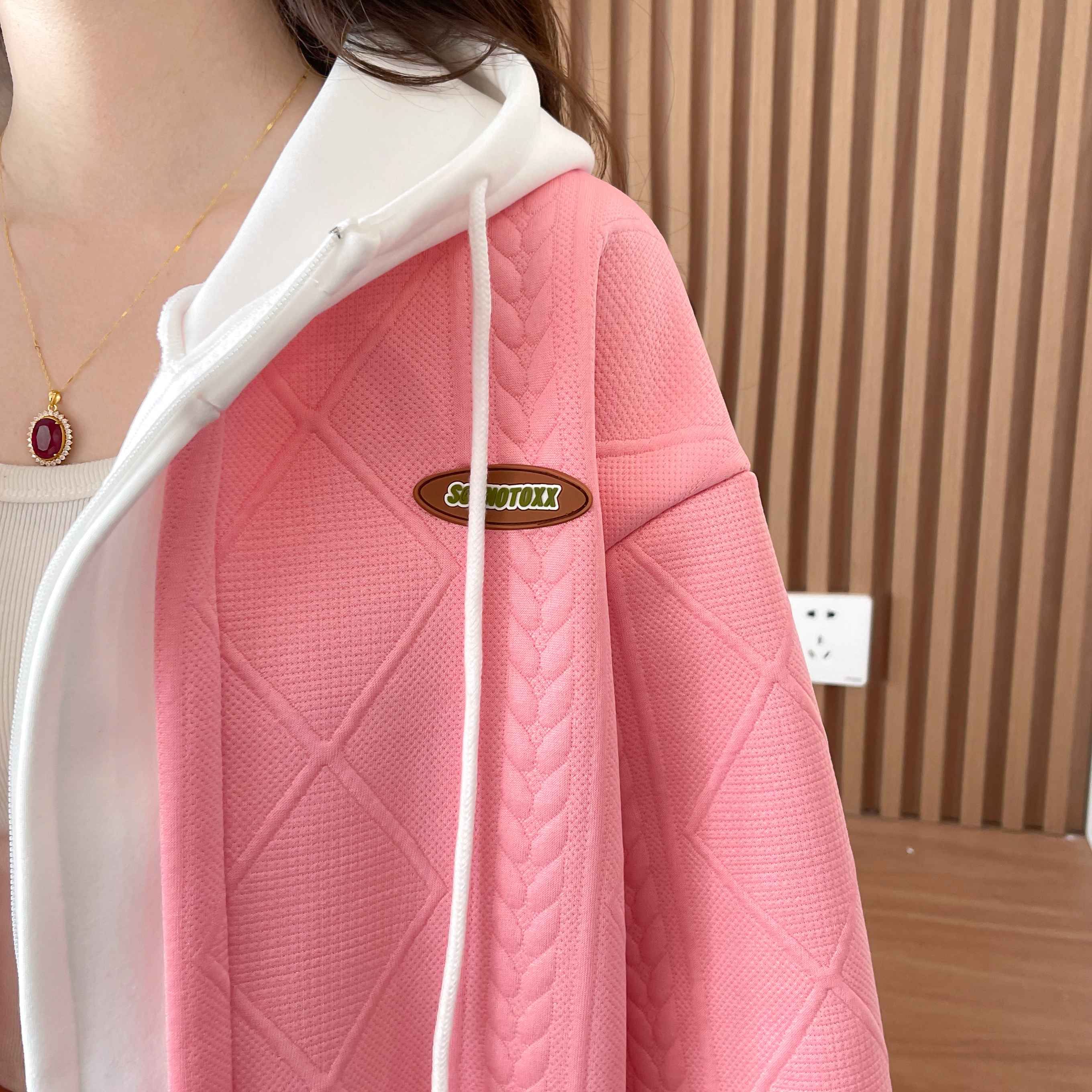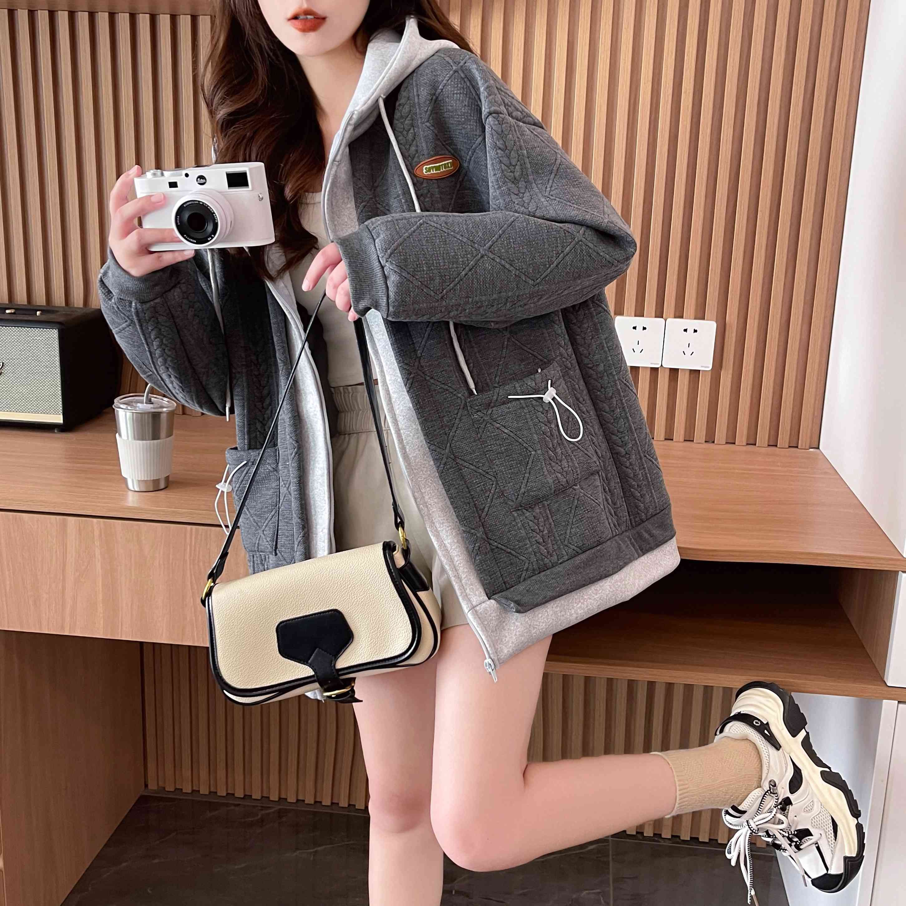实拍 提花面料春秋薄款假两件开衫连帽卫衣外套潮