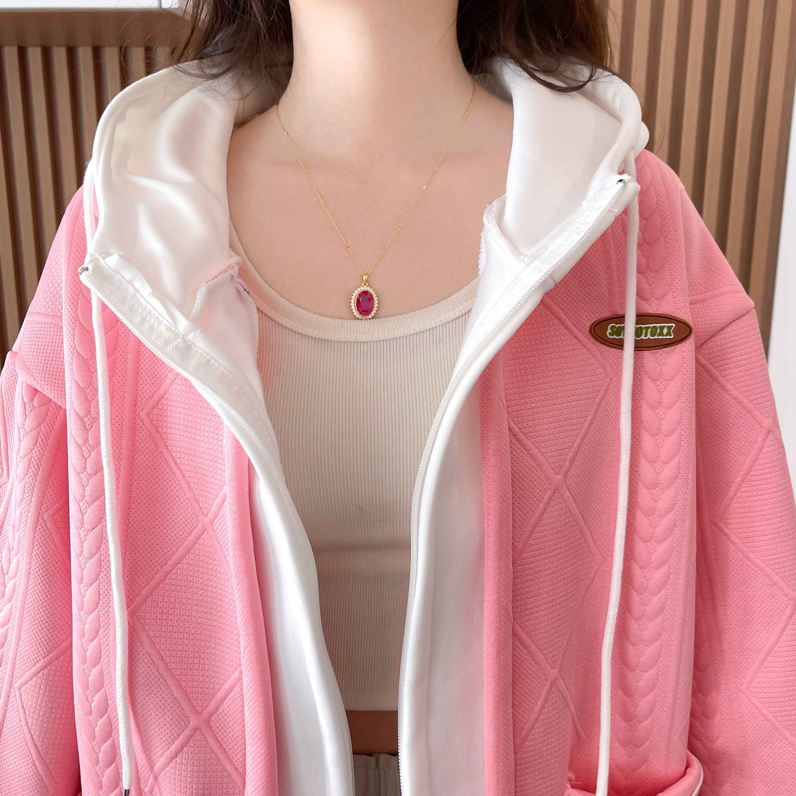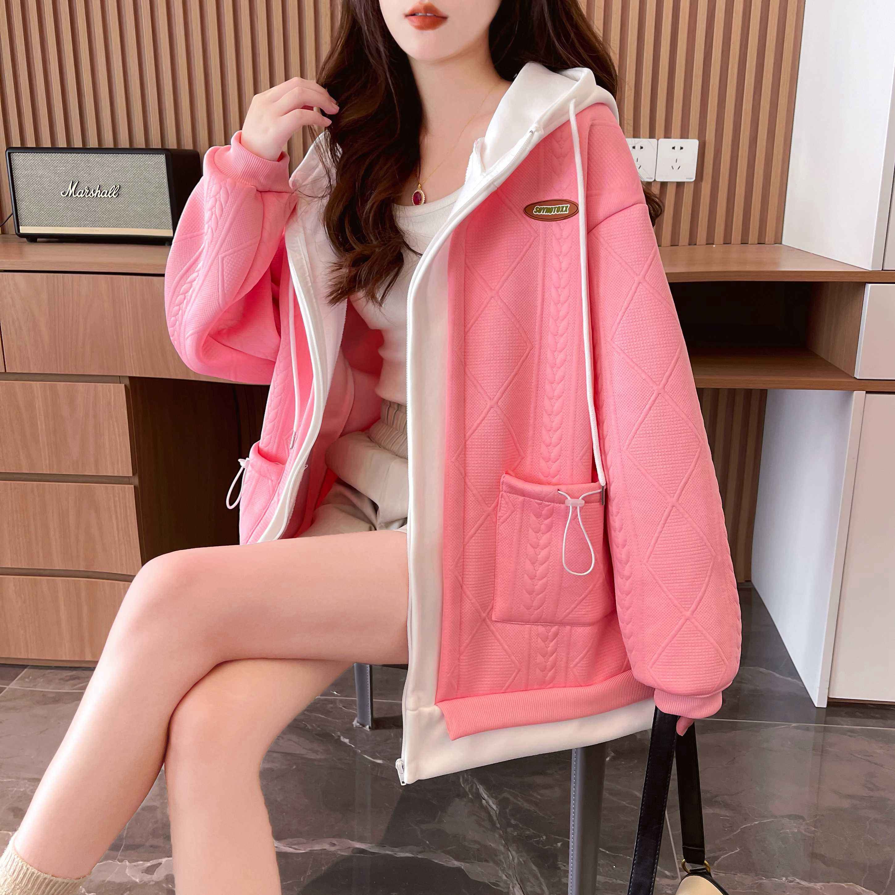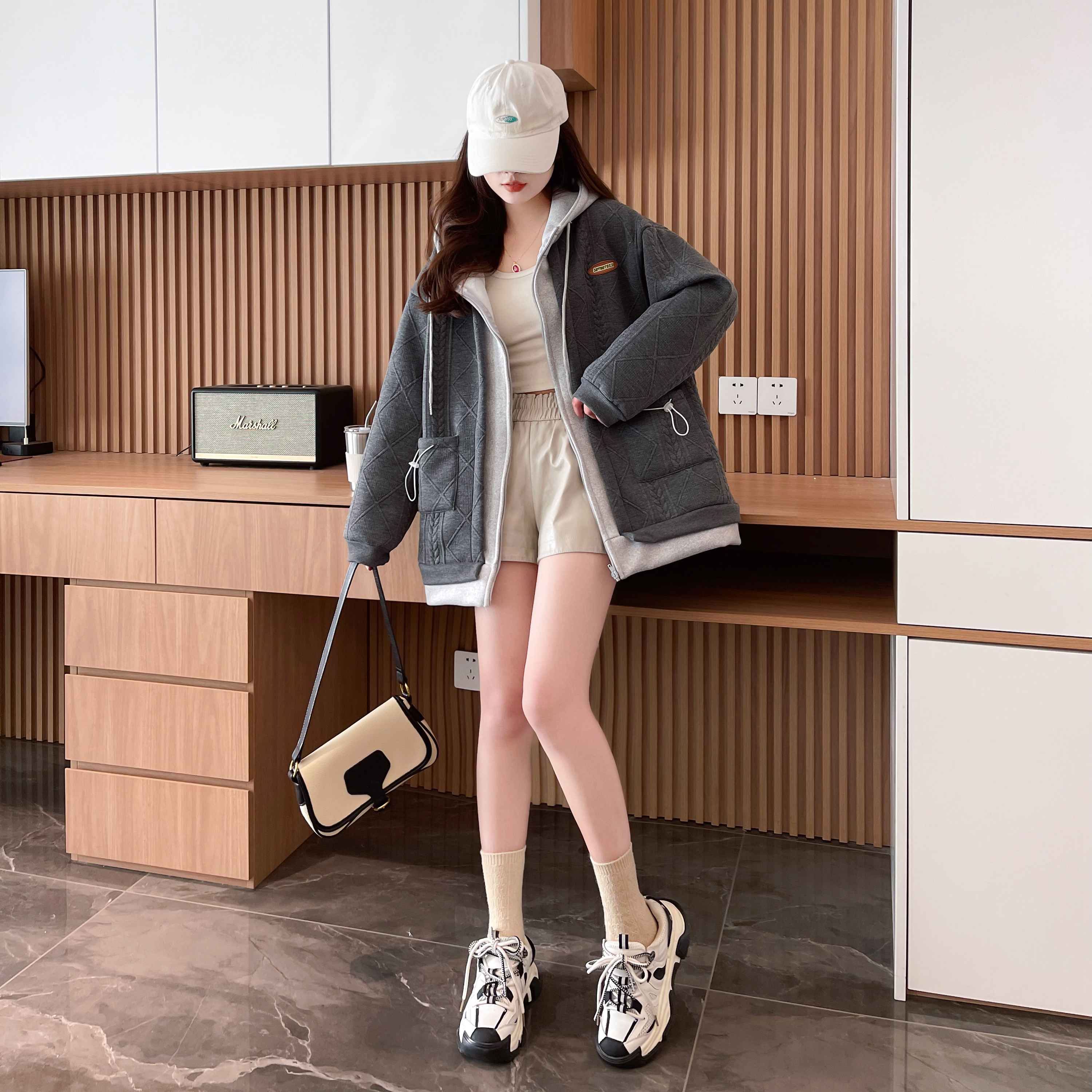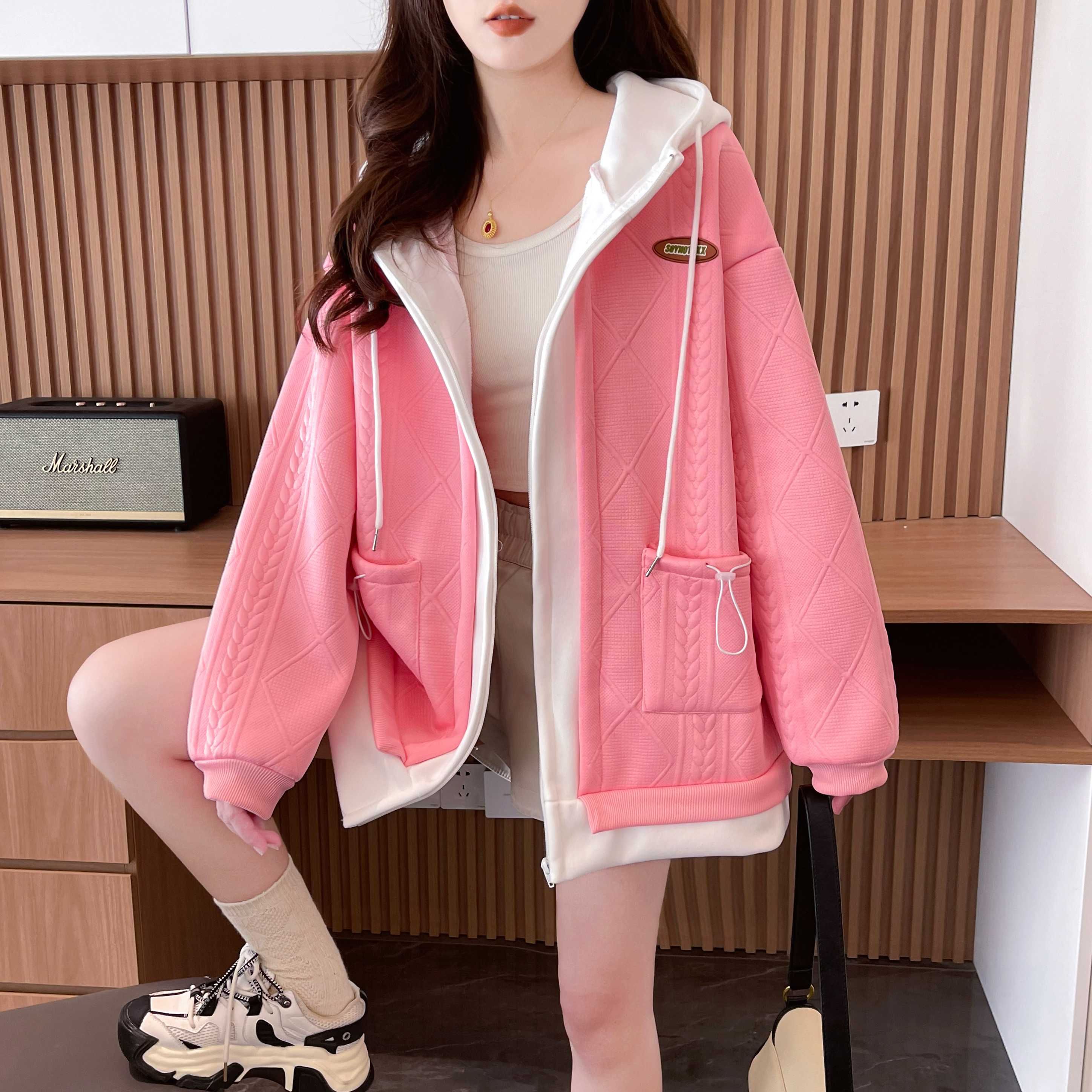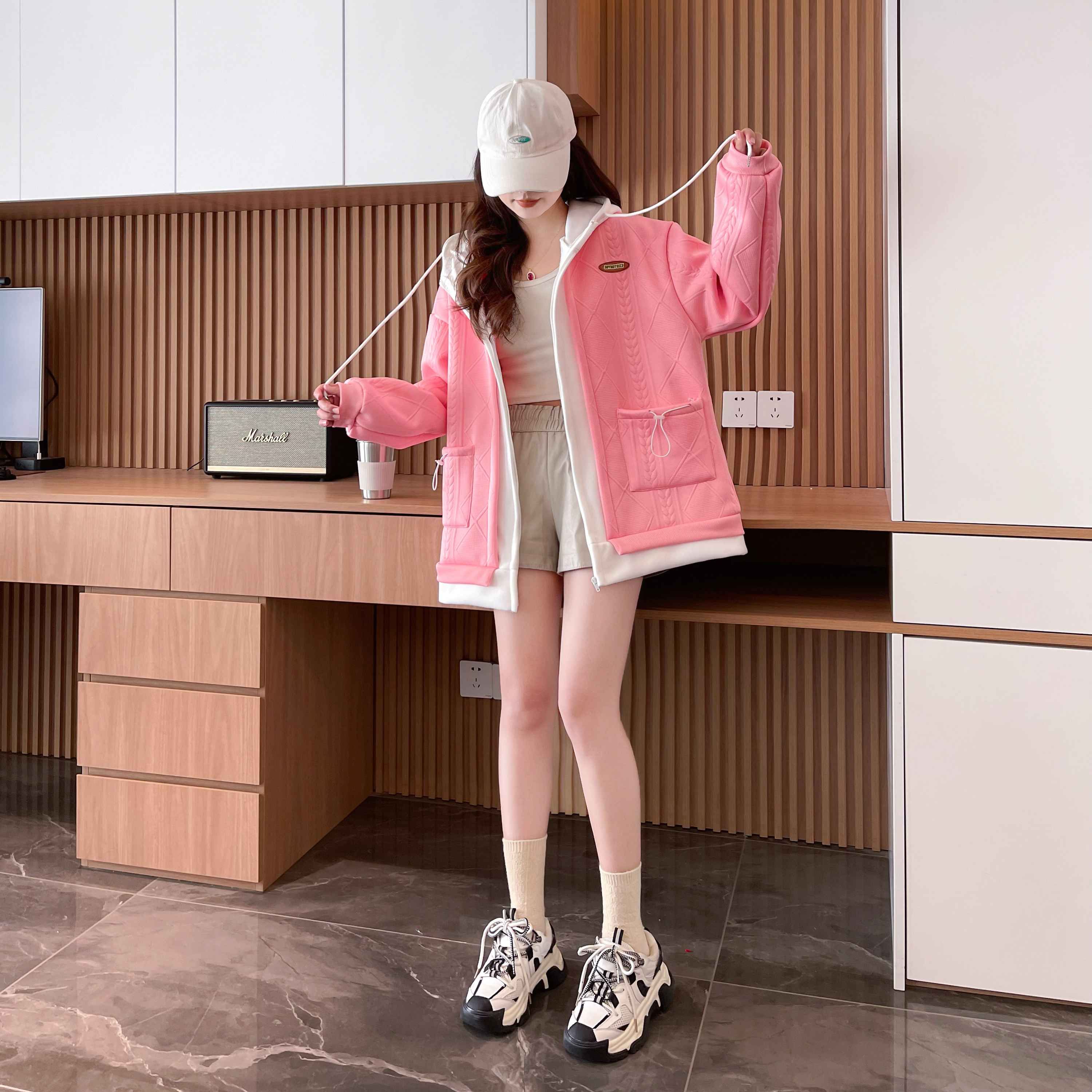 实拍 提花面料春秋薄款假两件开衫连帽卫衣外套潮