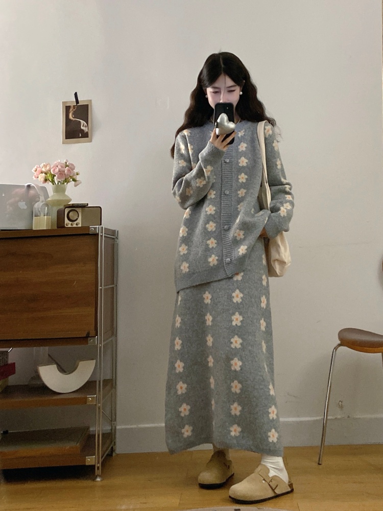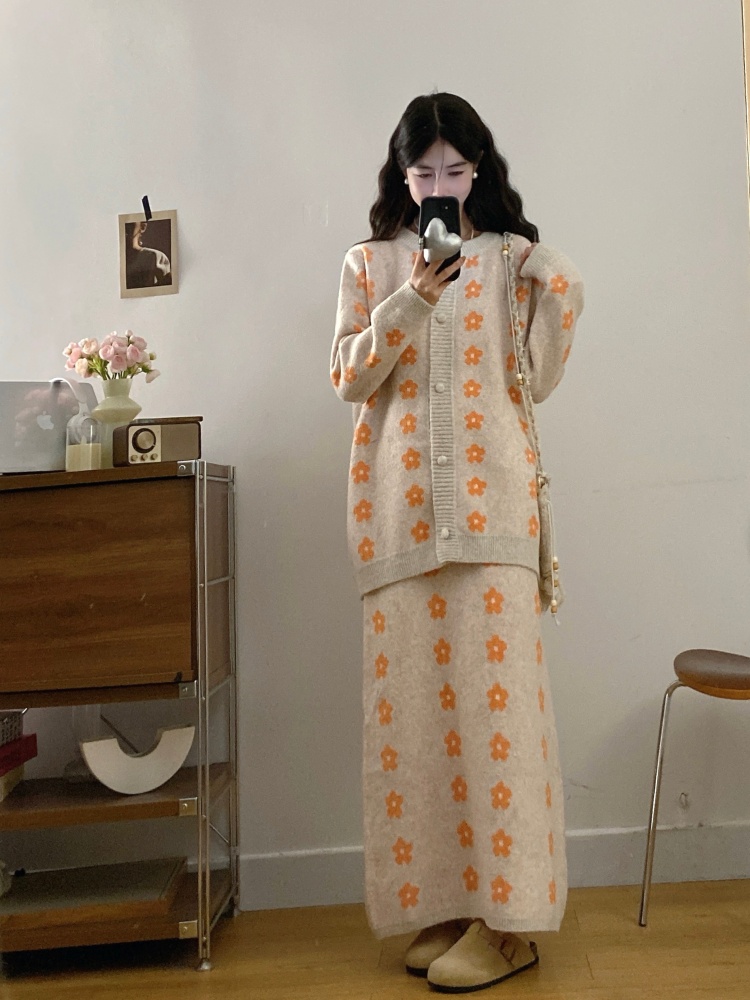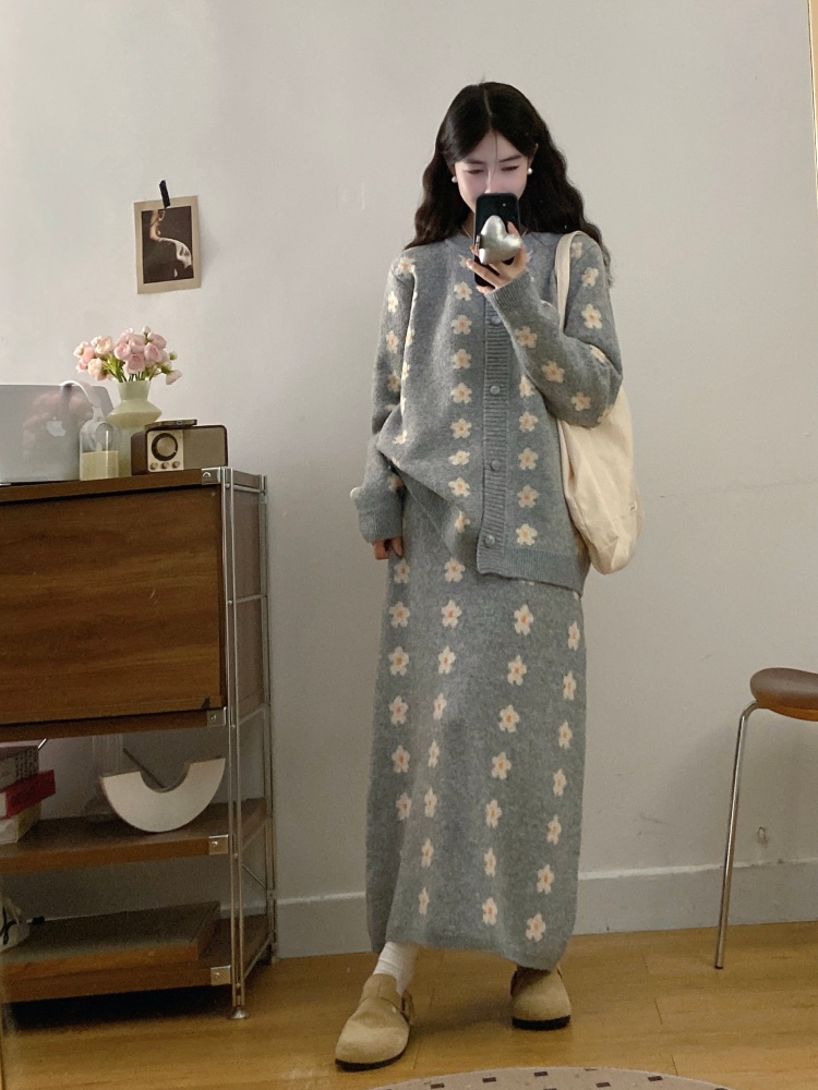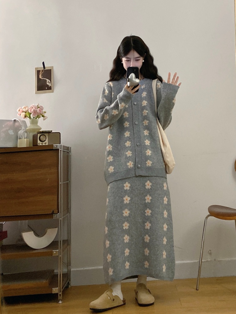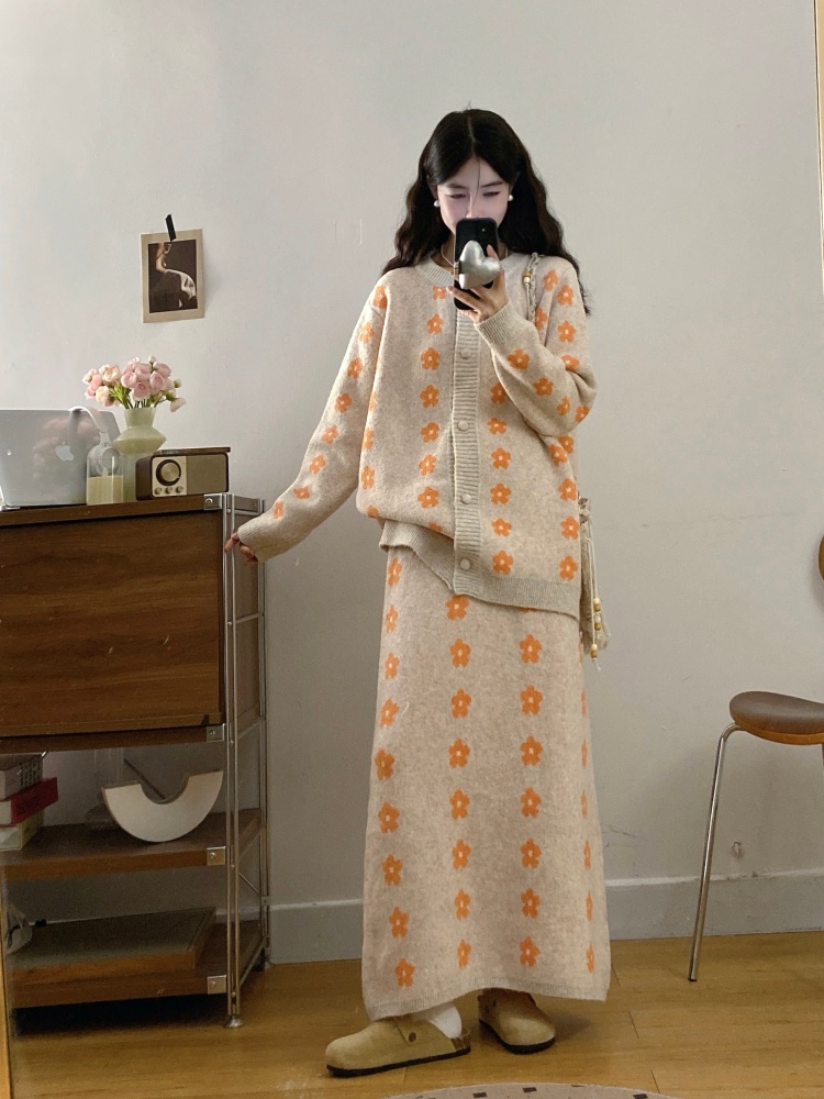 实拍大码秋冬花朵气质高级感洋气减龄时尚慵懒半身裙两件套