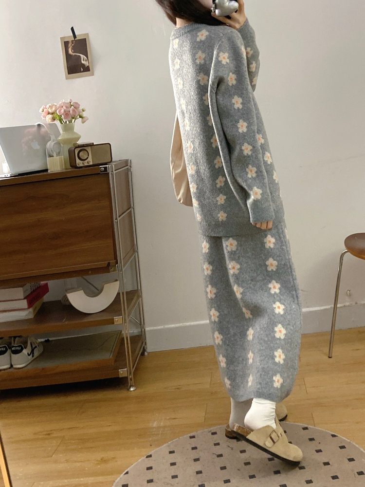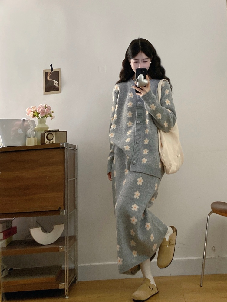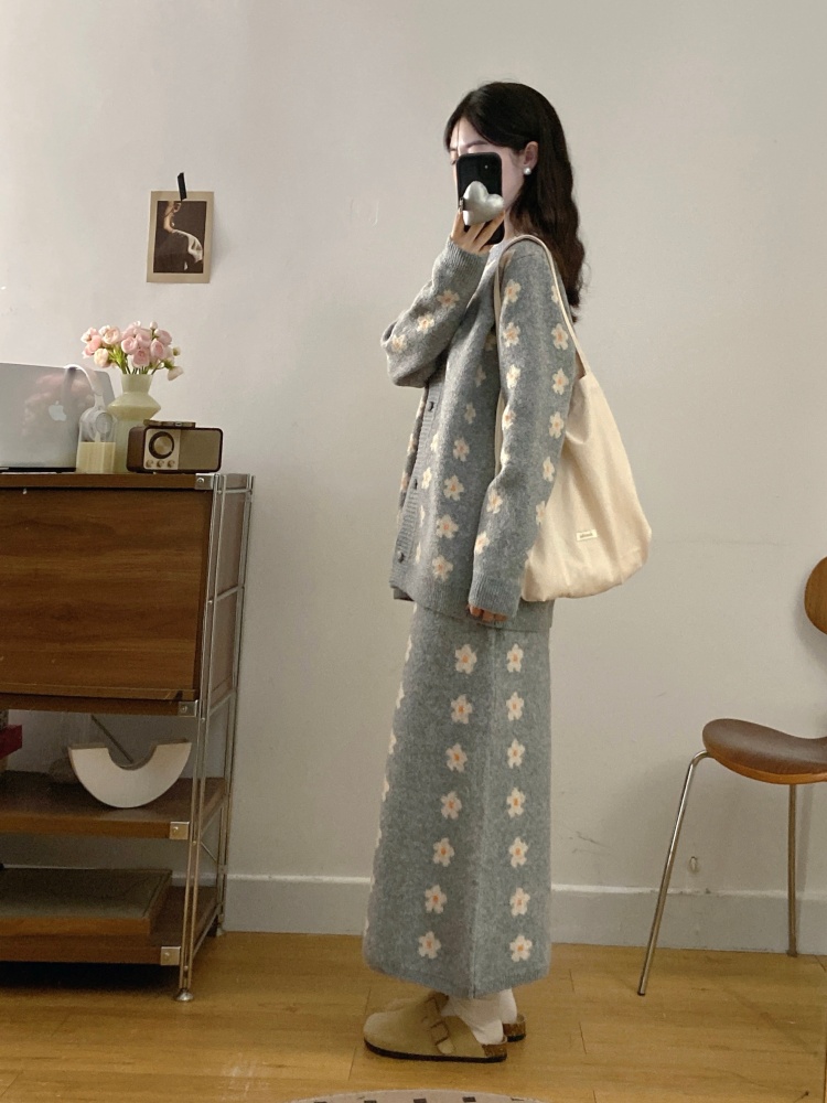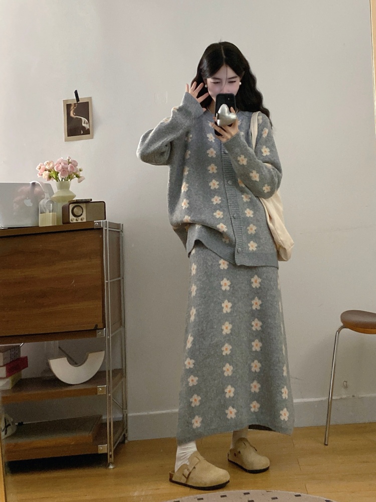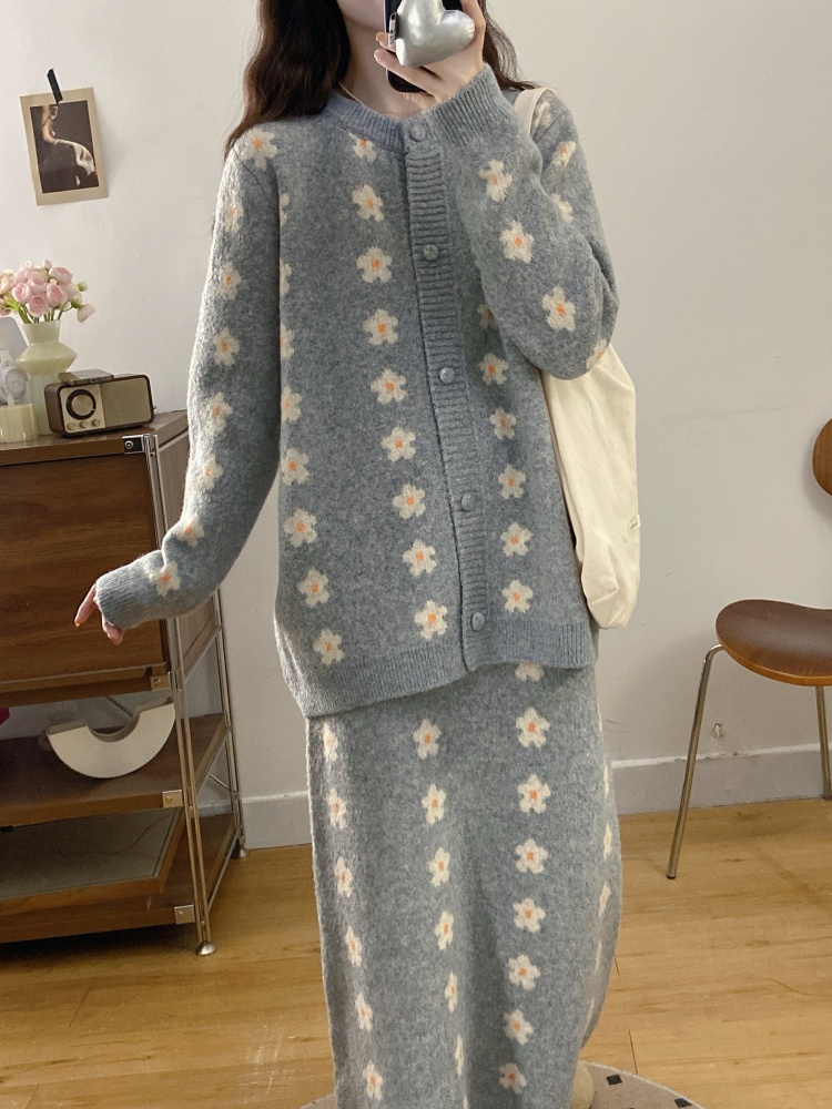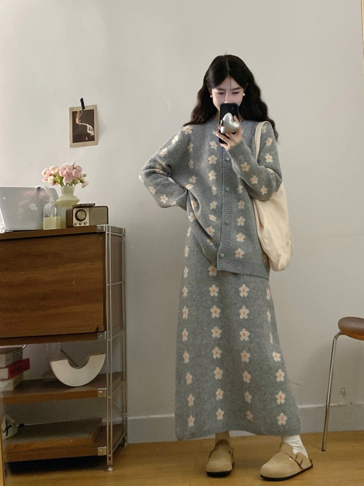 实拍大码秋冬花朵气质高级感洋气减龄时尚慵懒半身裙两件套