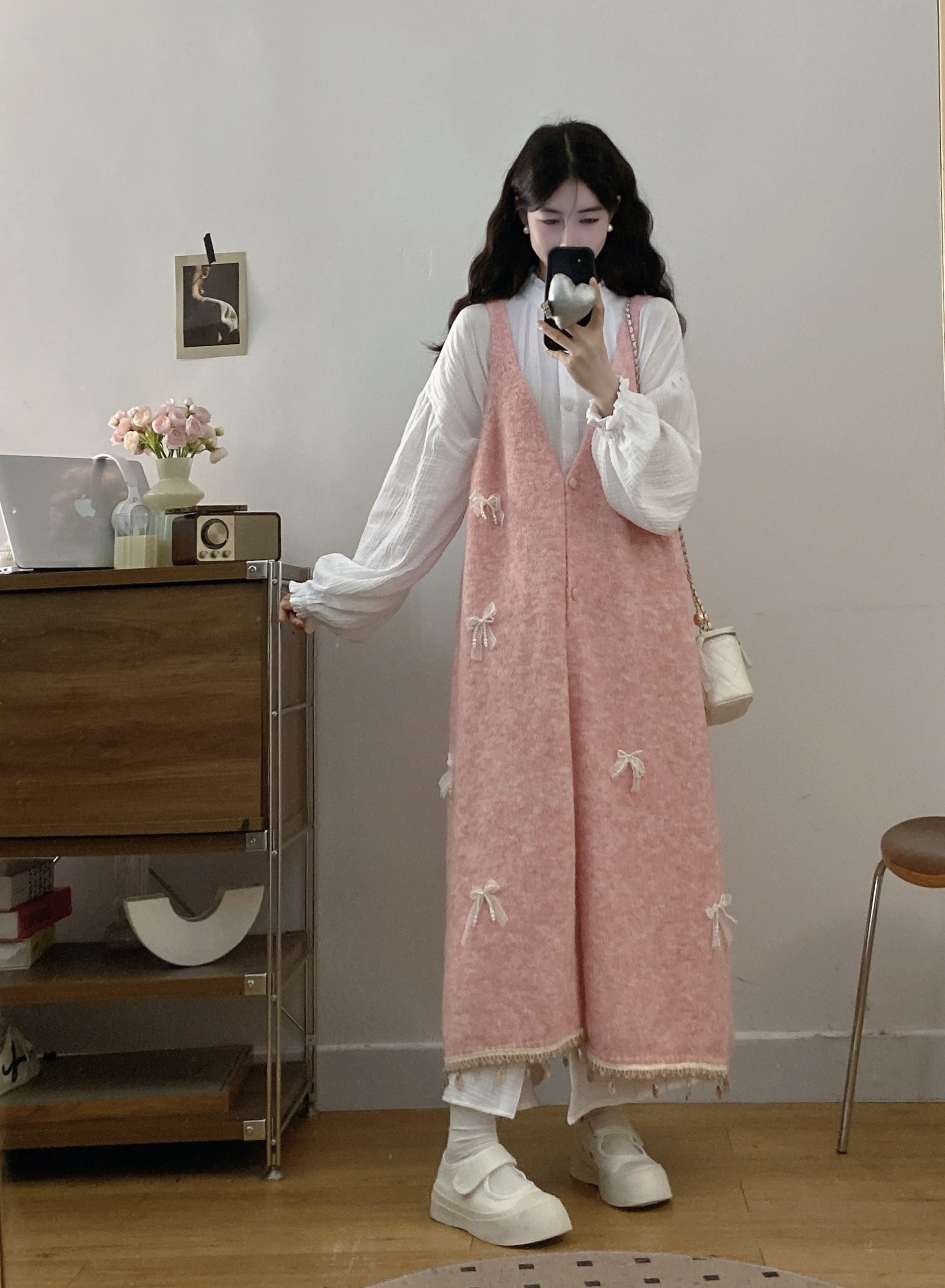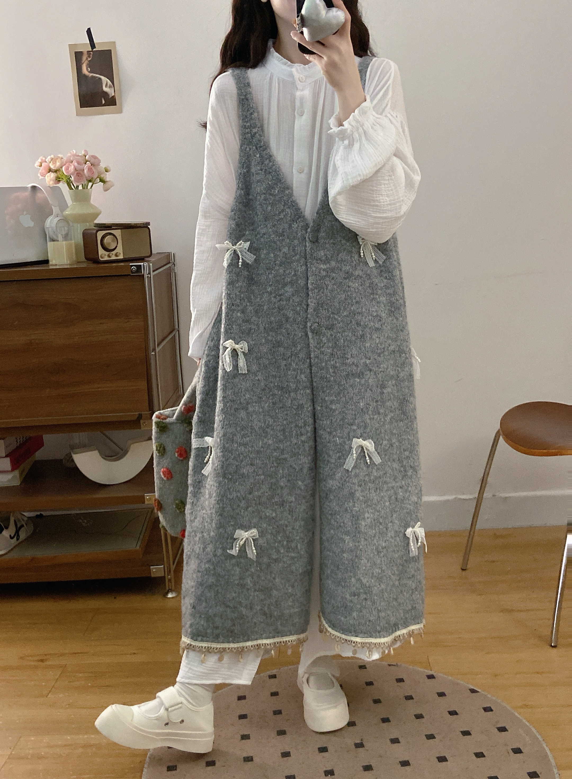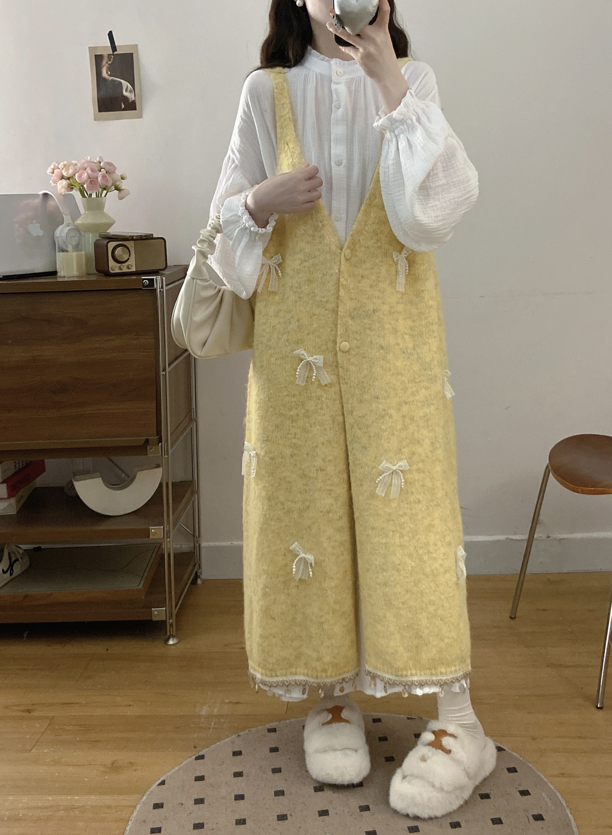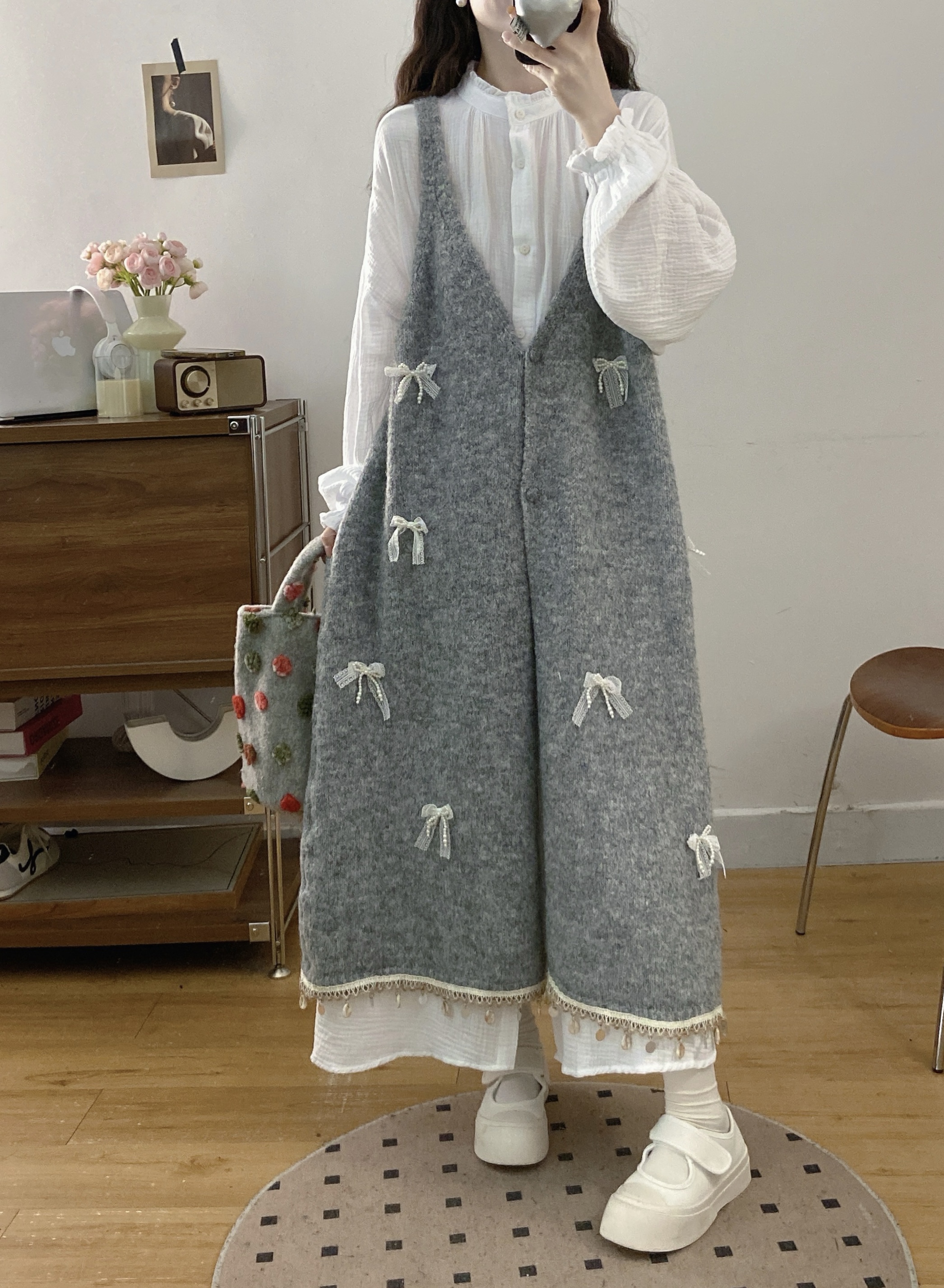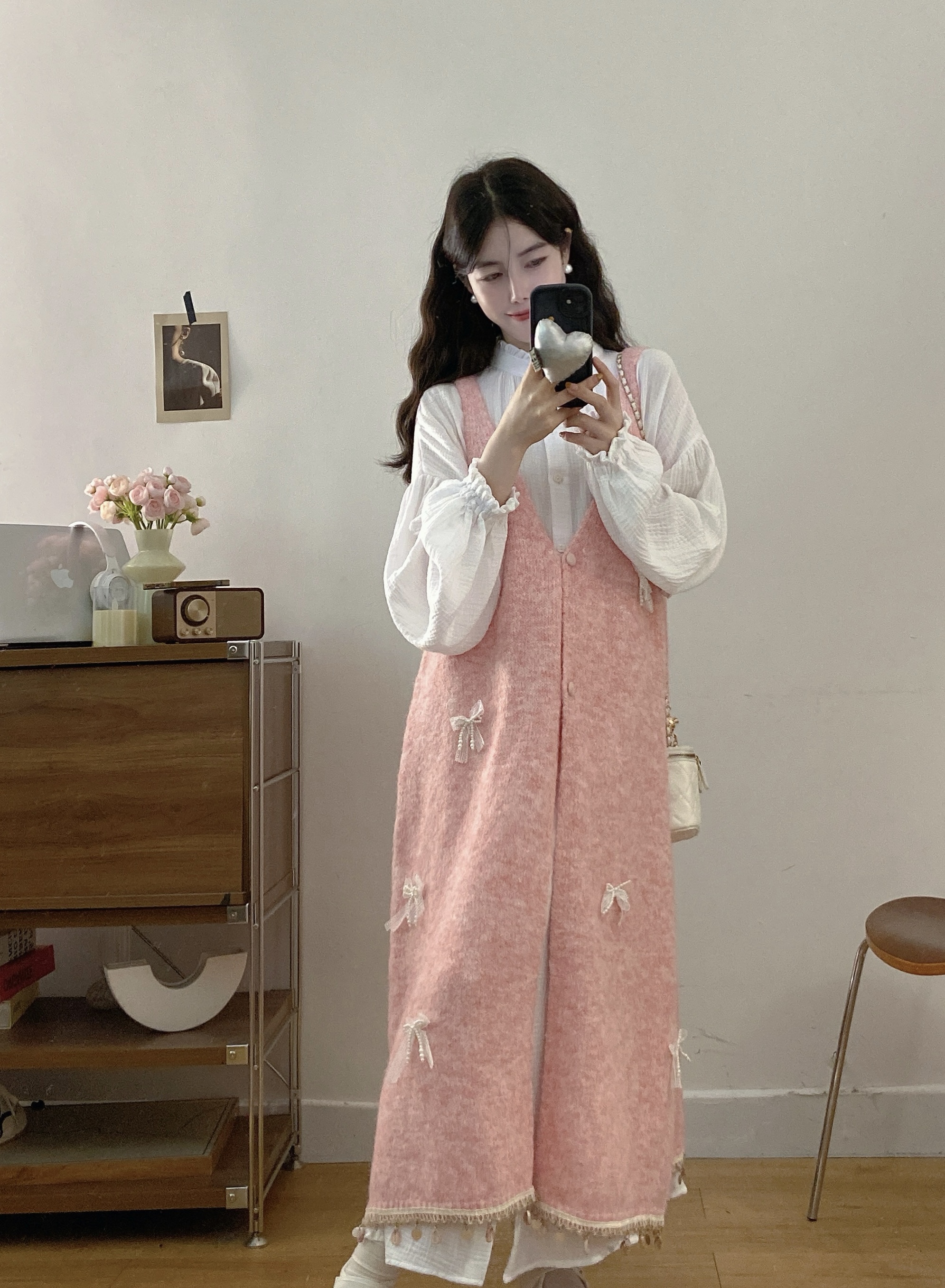 实拍大码秋冬蝴蝶结甜美气质宽松针织背心裙+宝宝棉衬衫裙套装