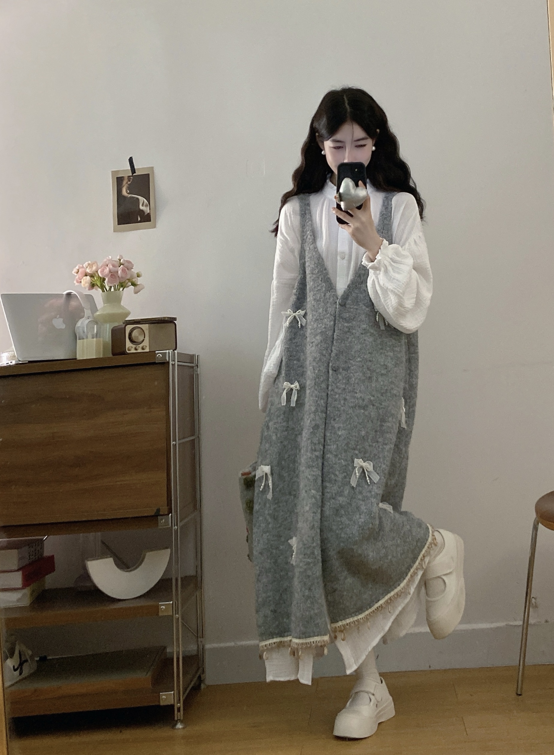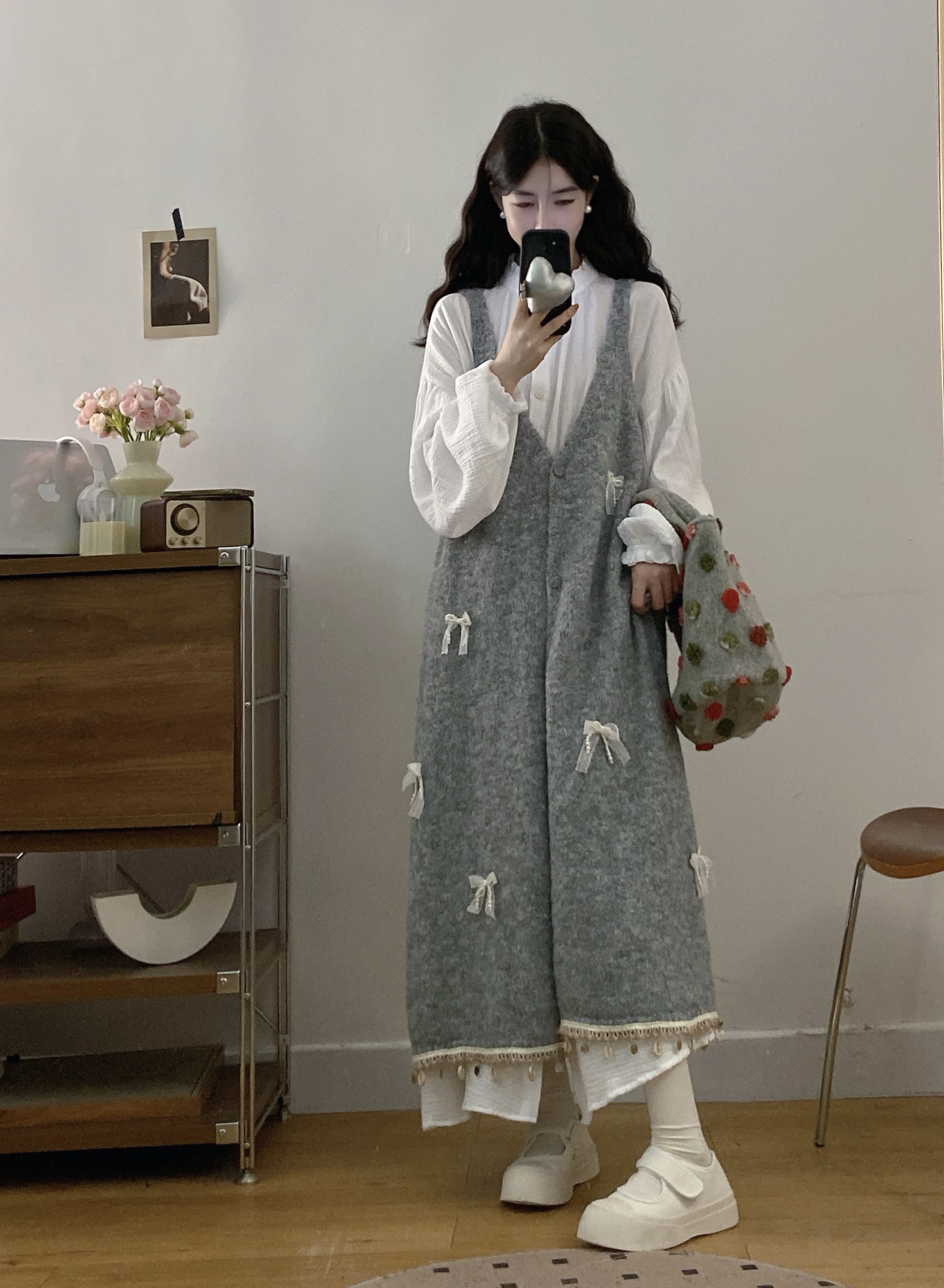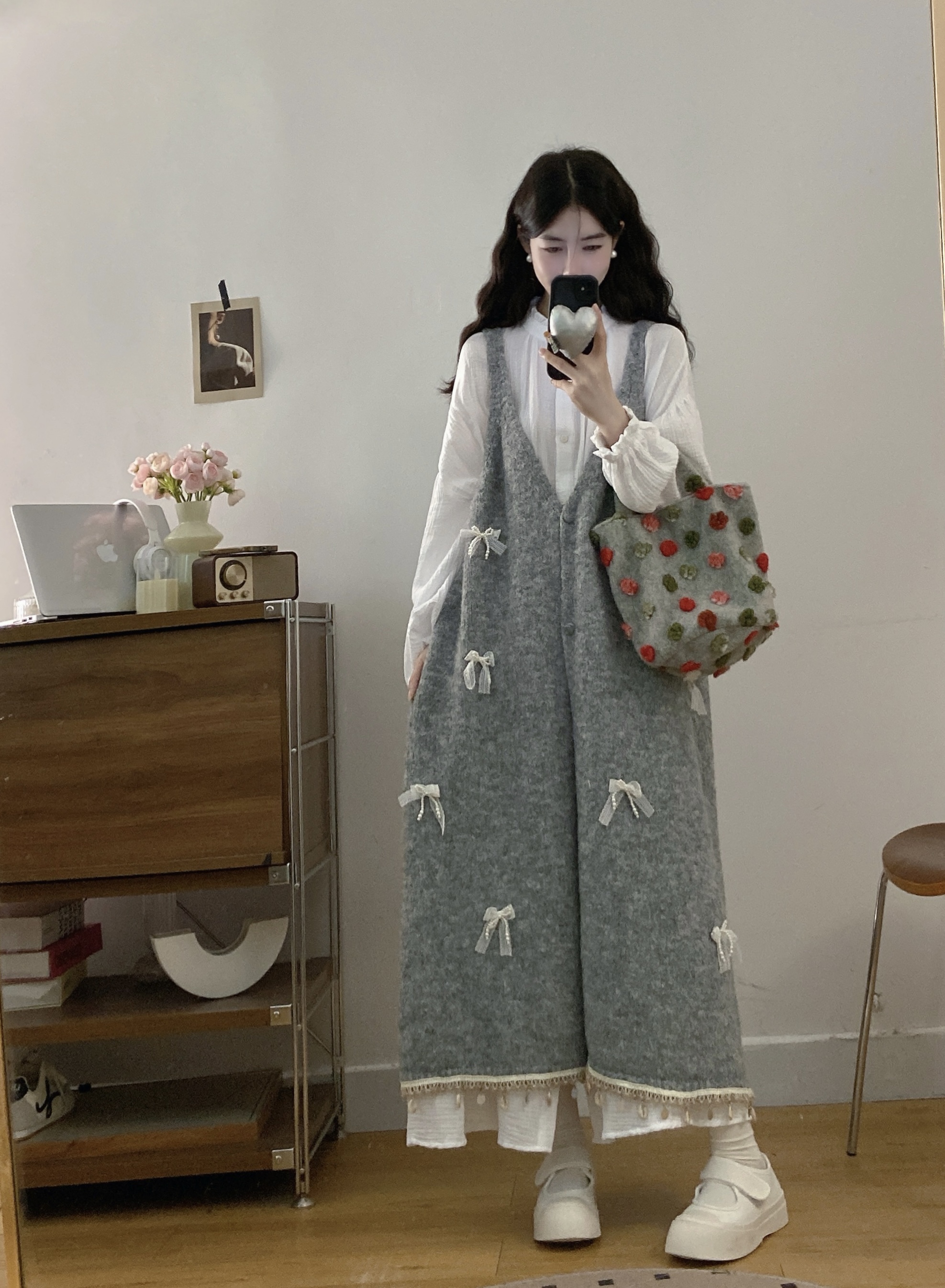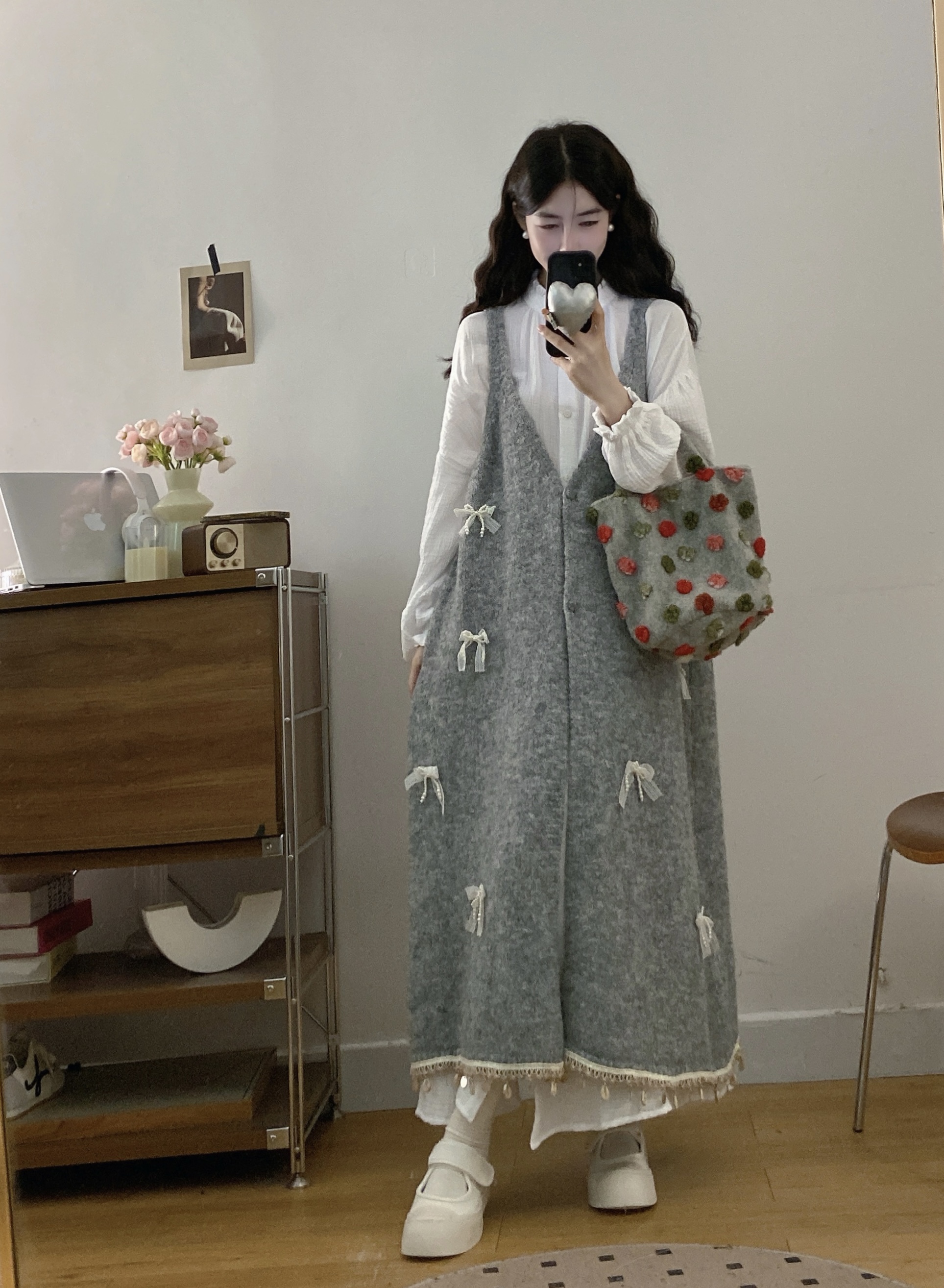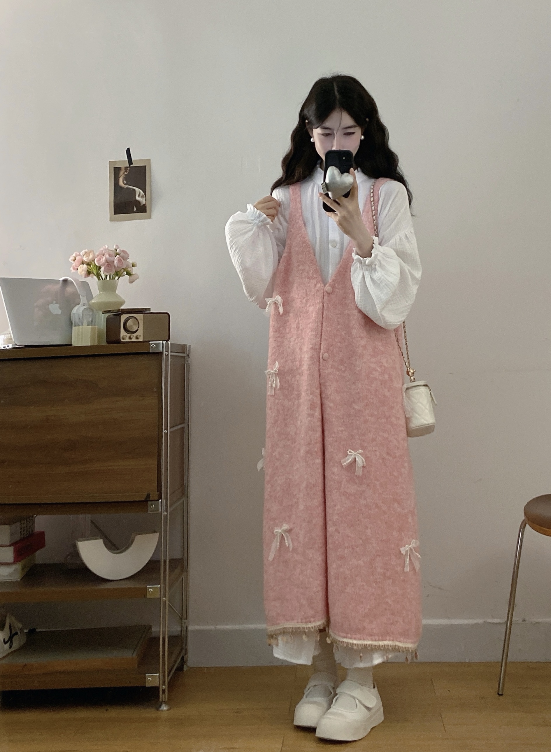实拍大码秋冬蝴蝶结甜美气质宽松针织背心裙+宝宝棉衬衫裙套装
