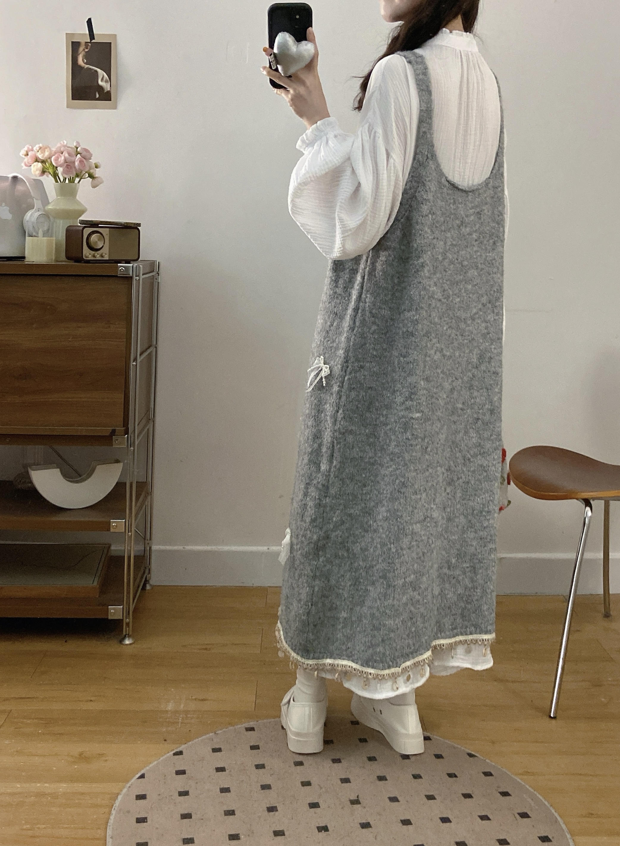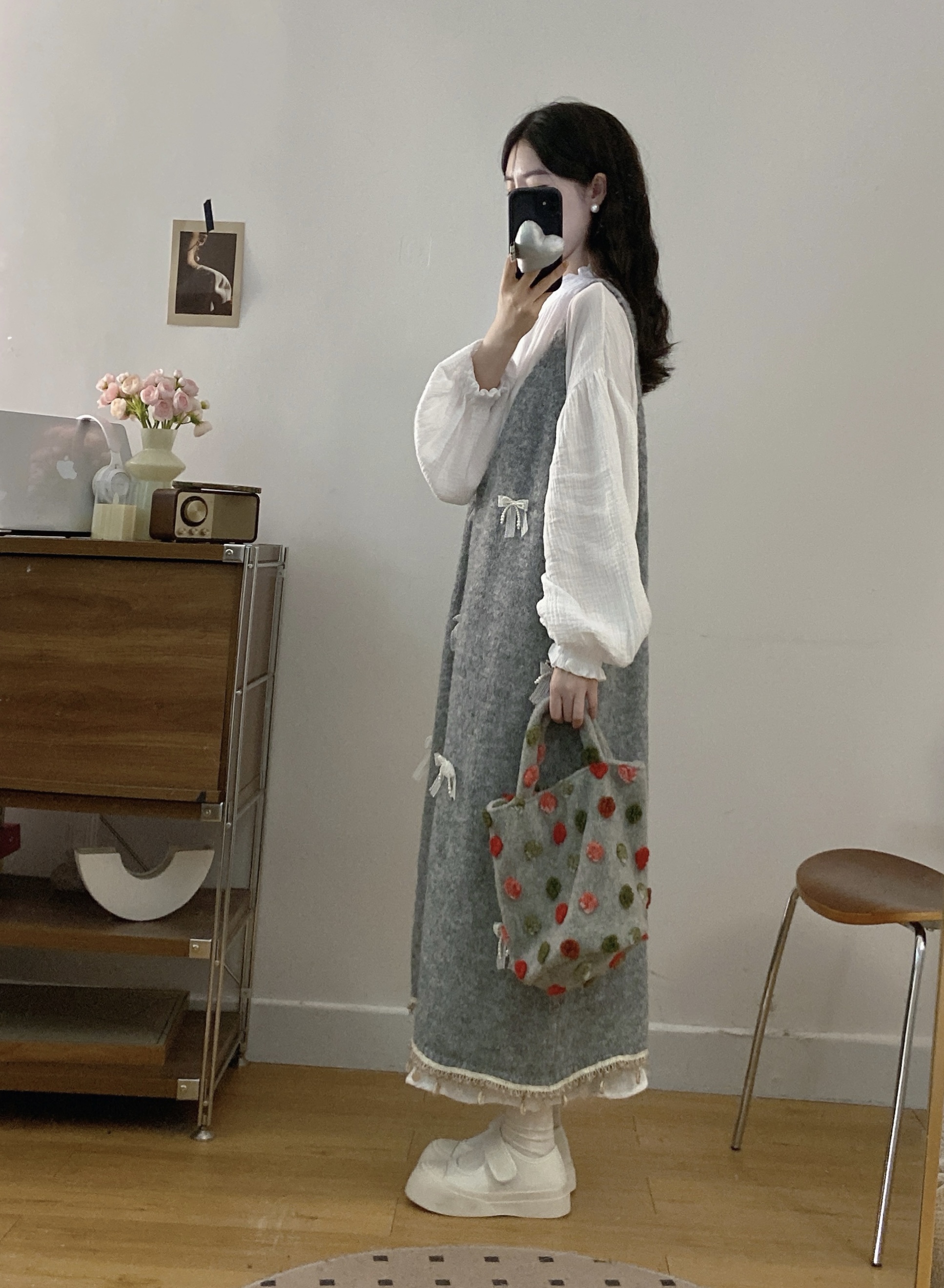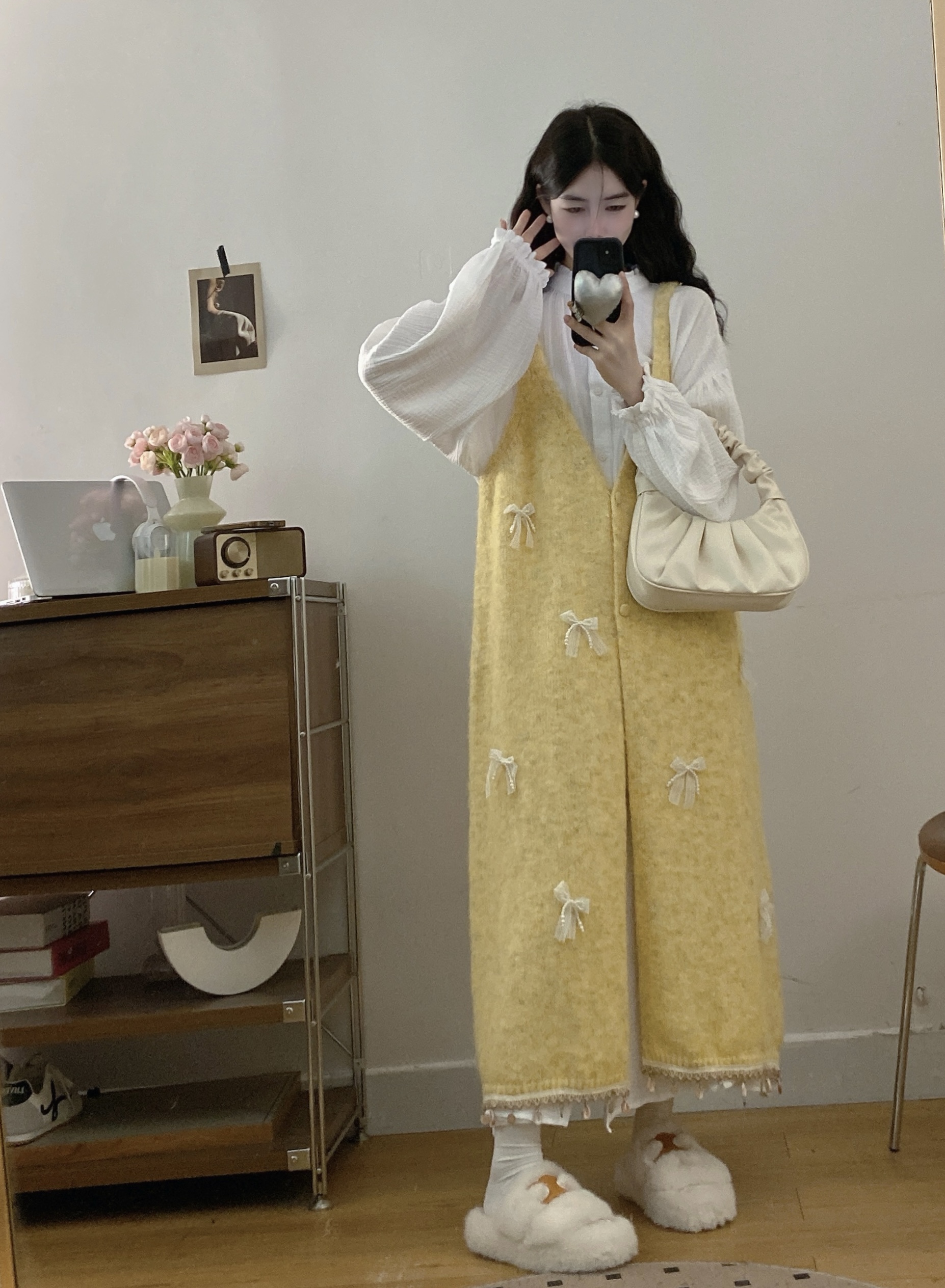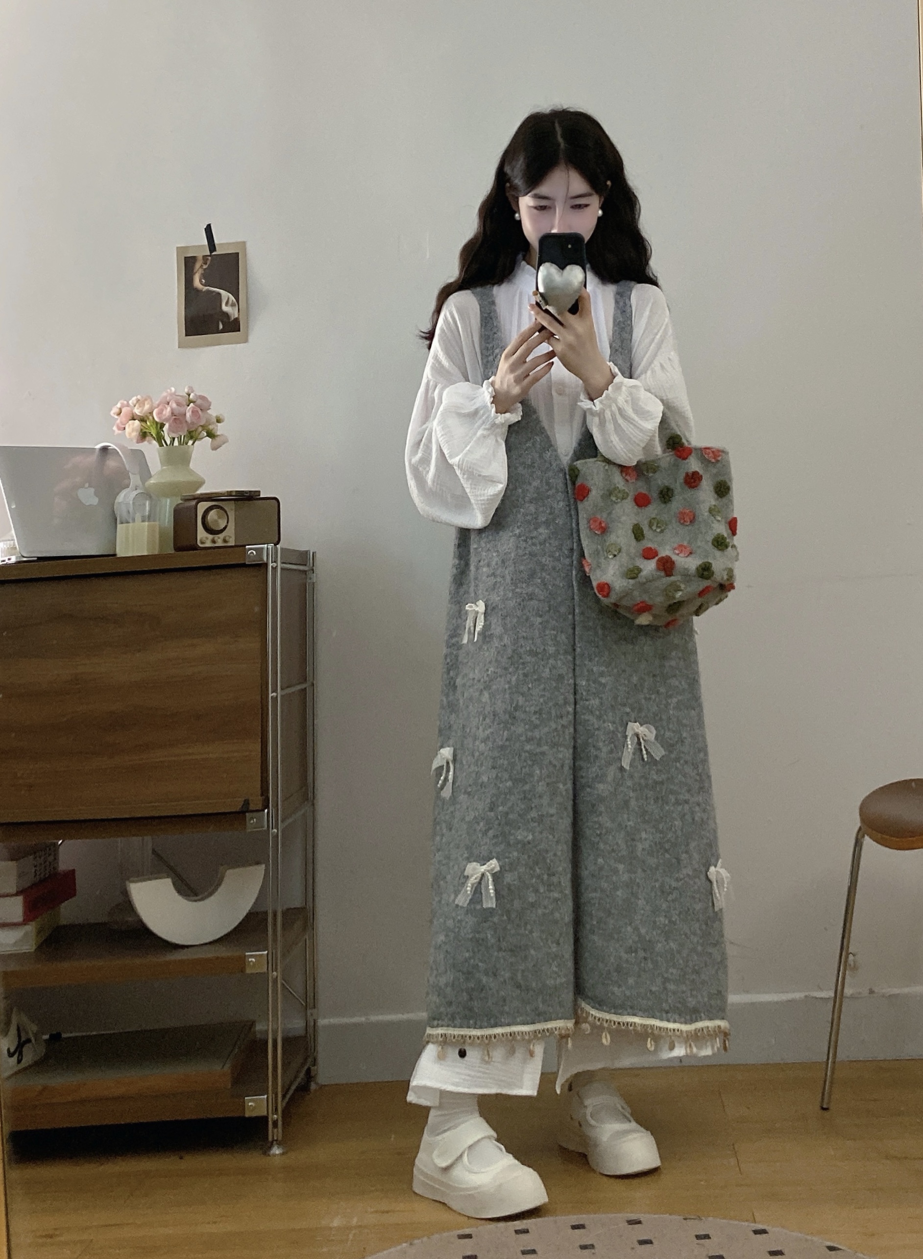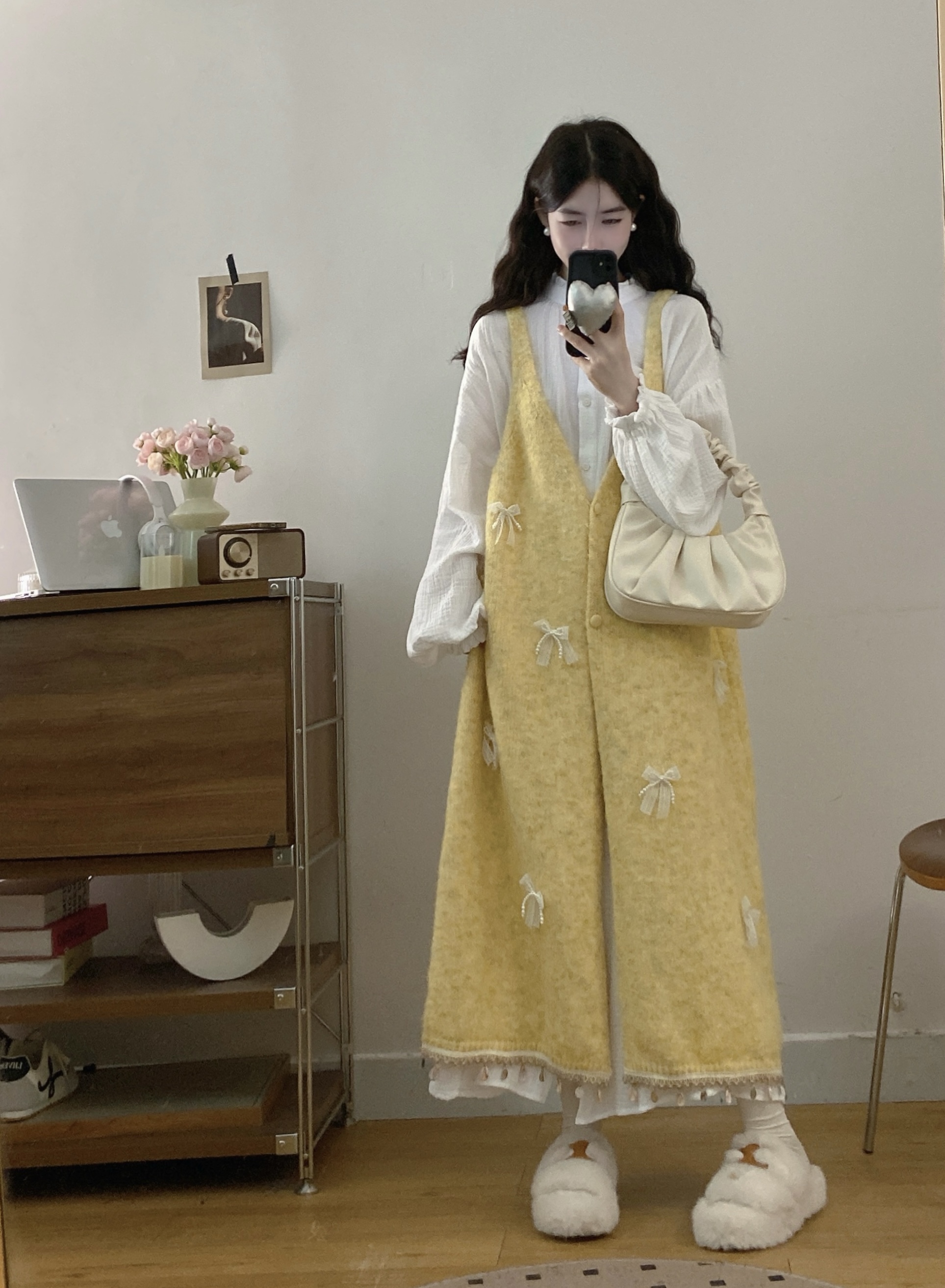 实拍大码秋冬蝴蝶结甜美气质宽松针织背心裙+宝宝棉衬衫裙套装