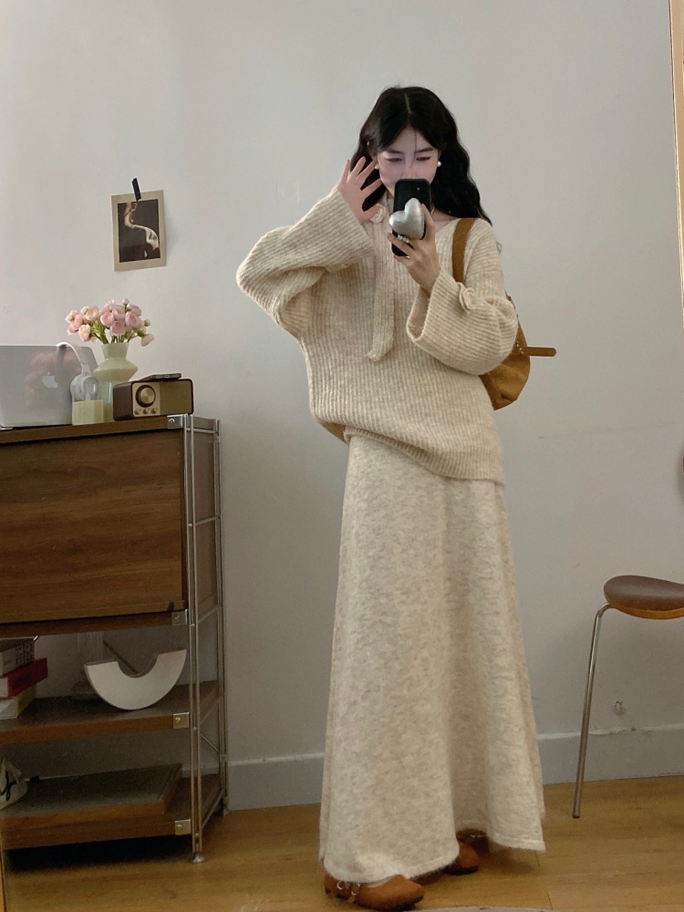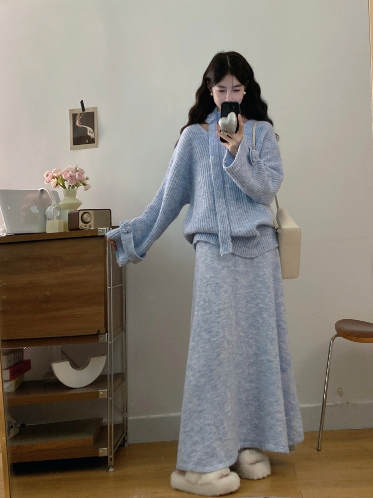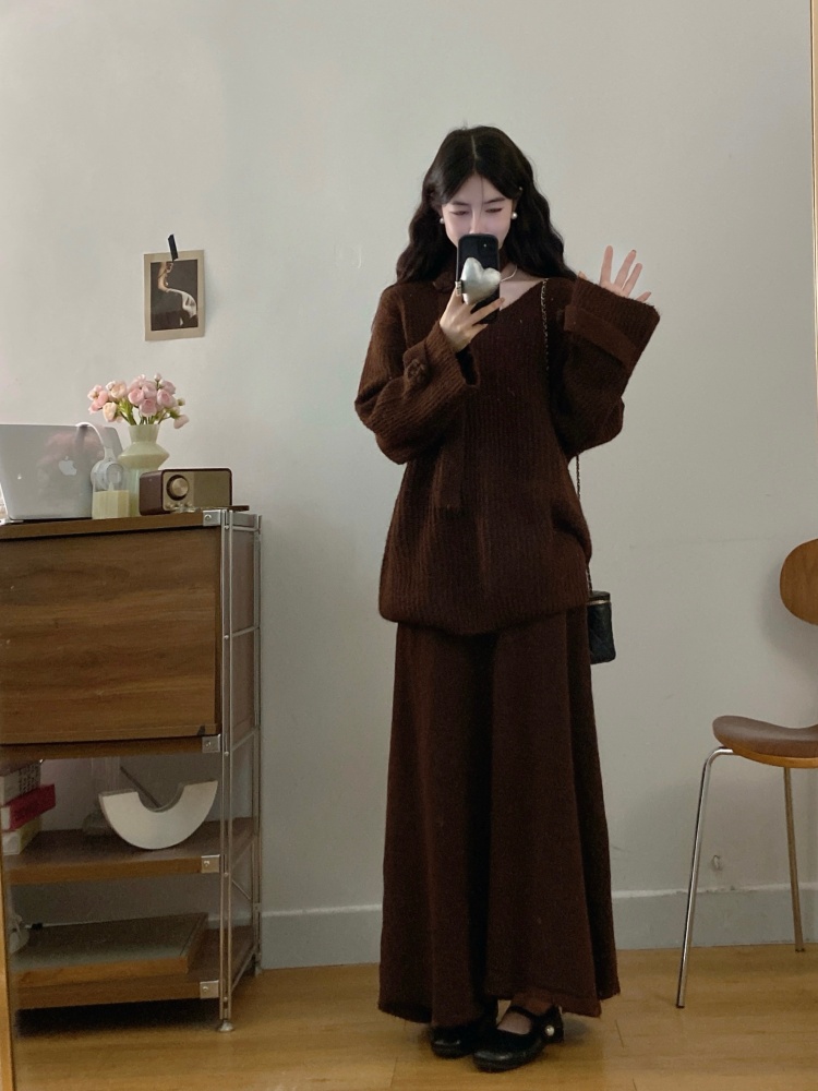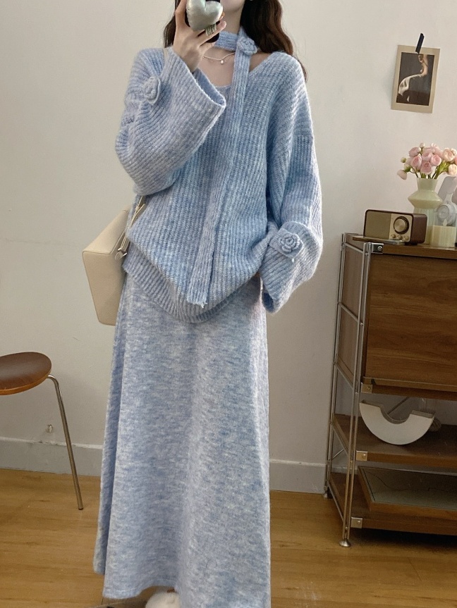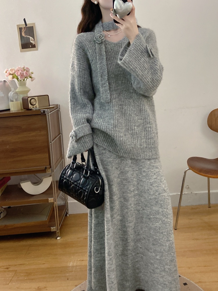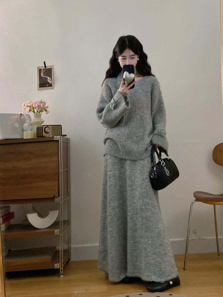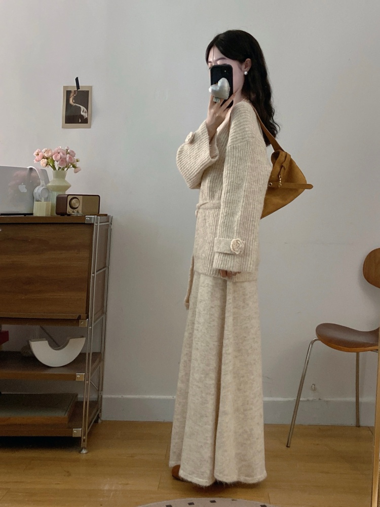 实拍大码法式慵懒风高级感玫瑰花V领针织毛衣配飘带套装女