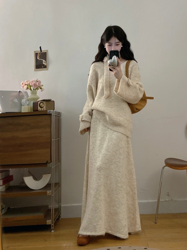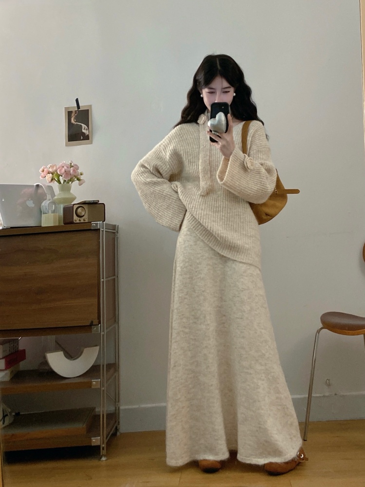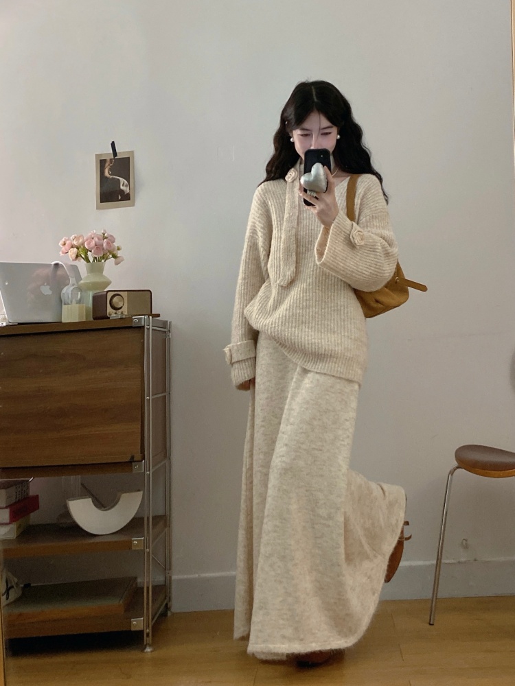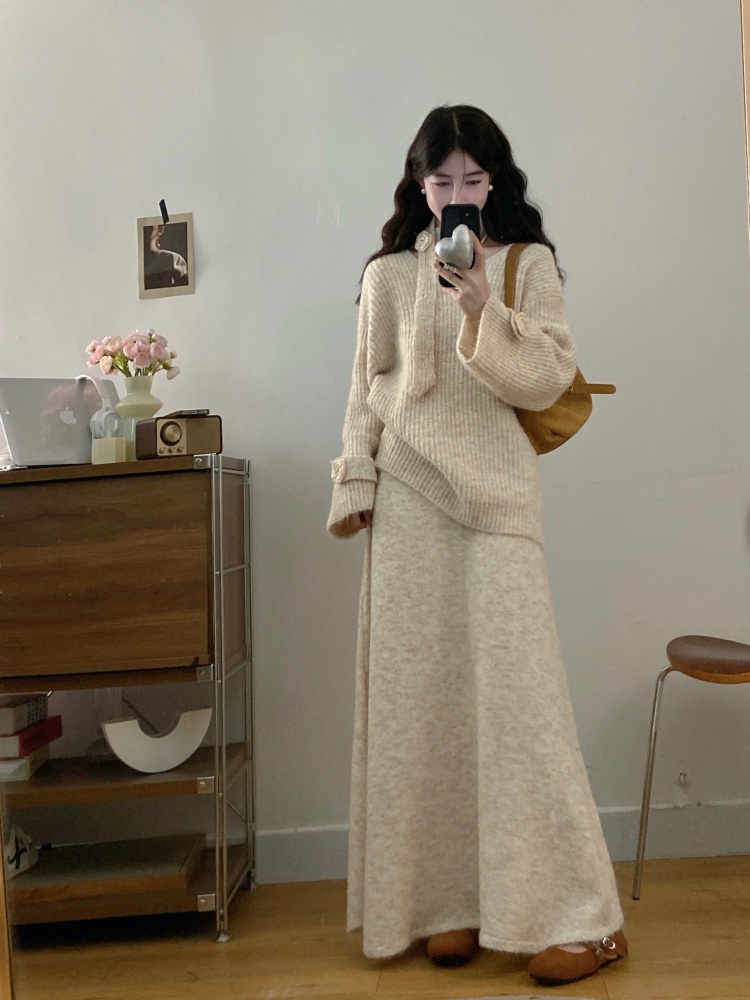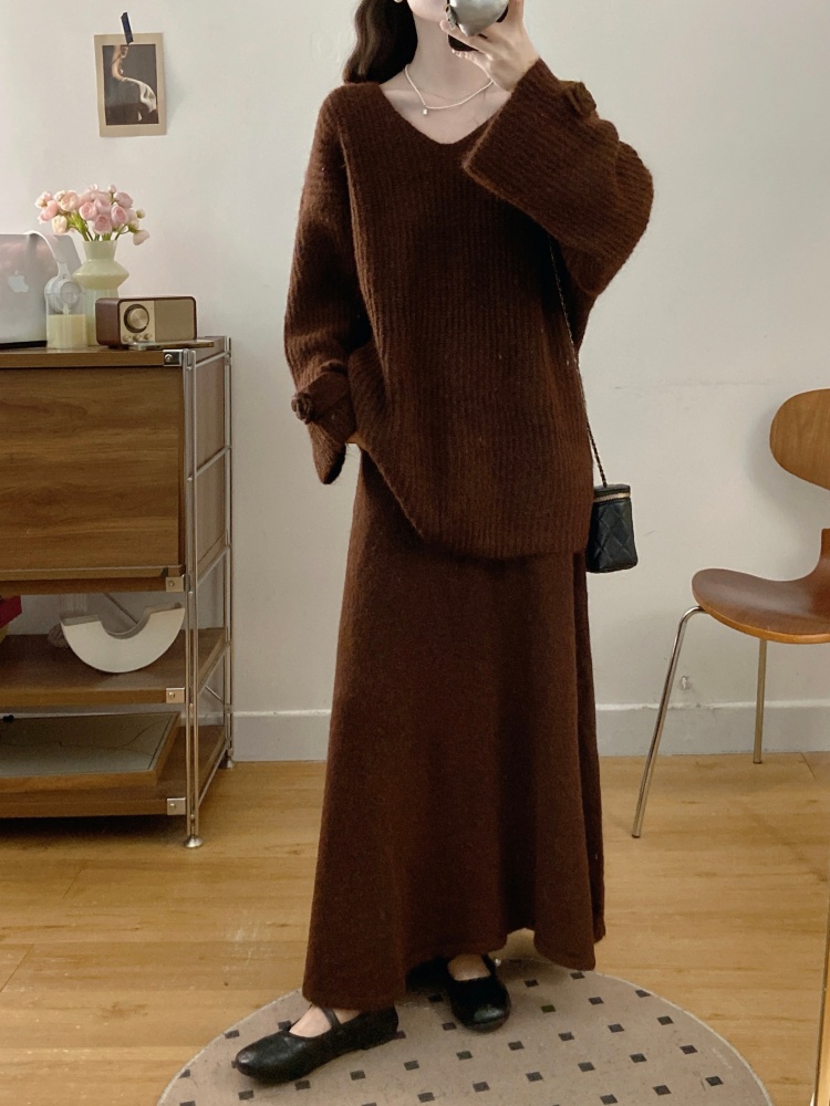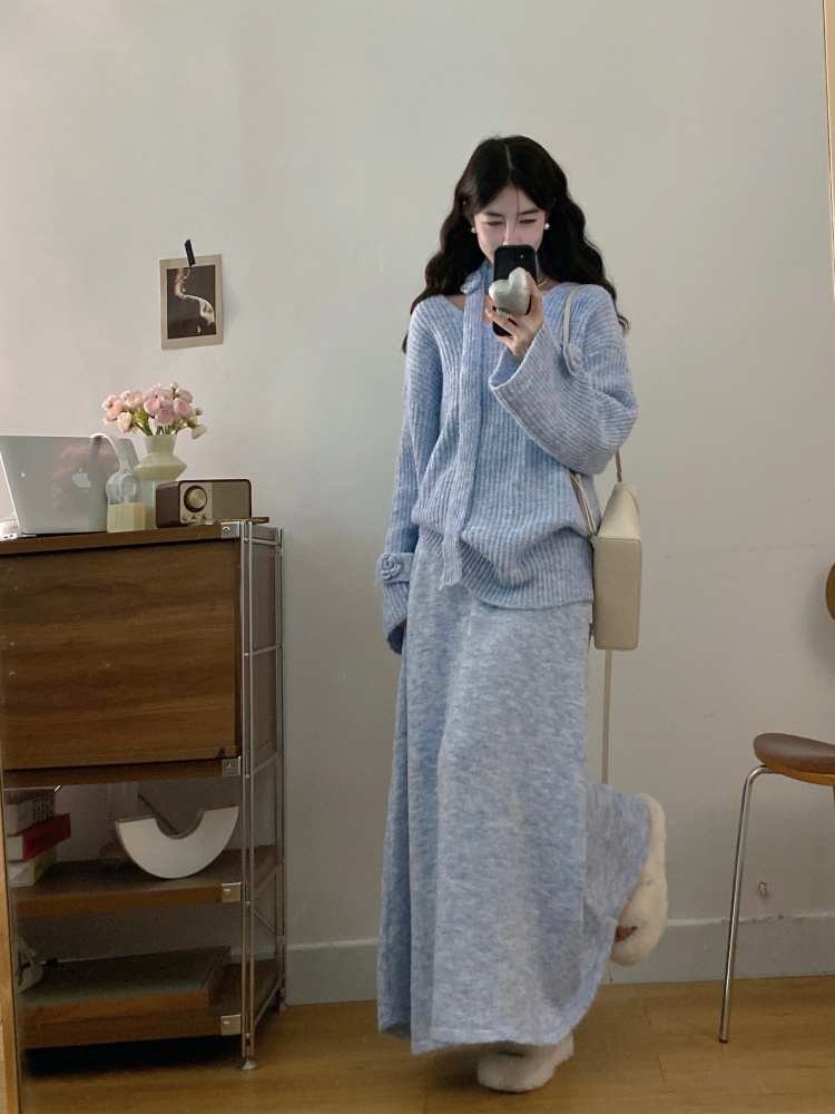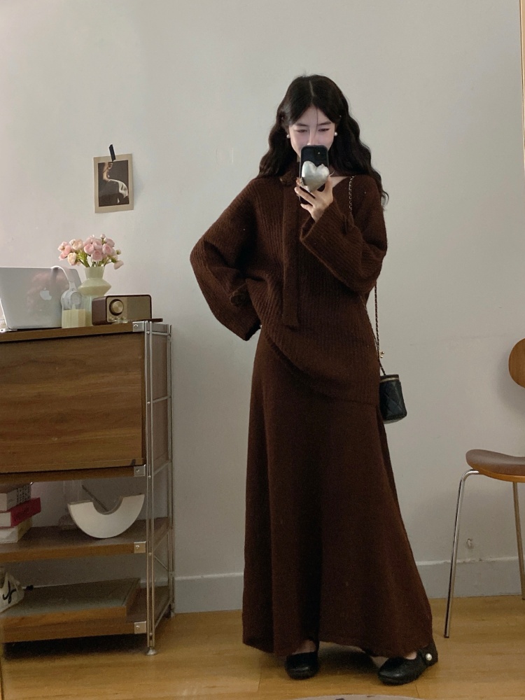 实拍大码法式慵懒风高级感玫瑰花V领针织毛衣配飘带套装女