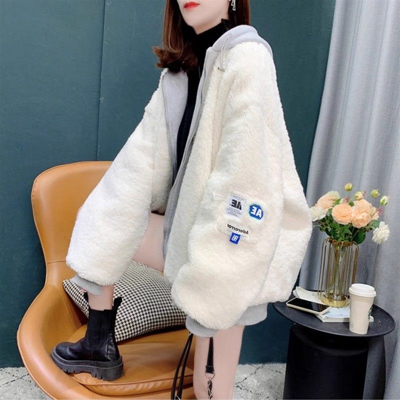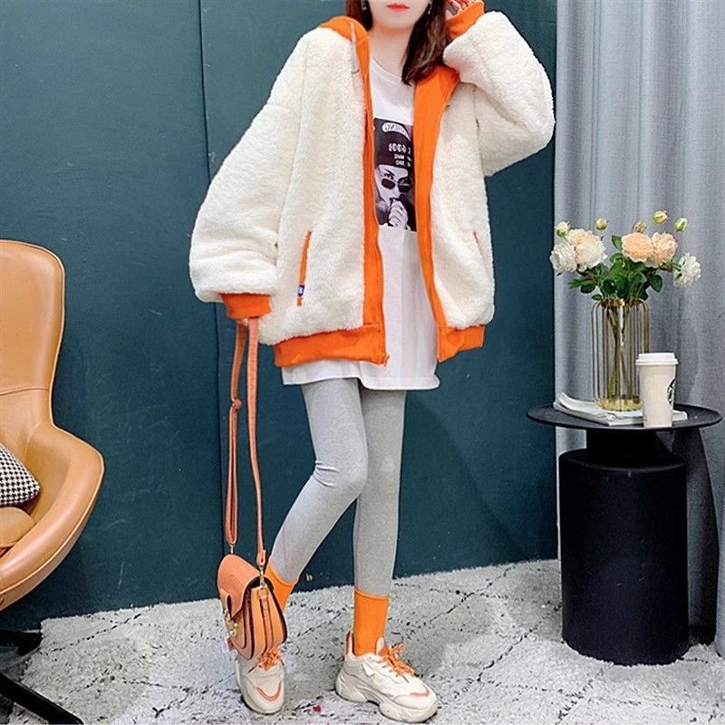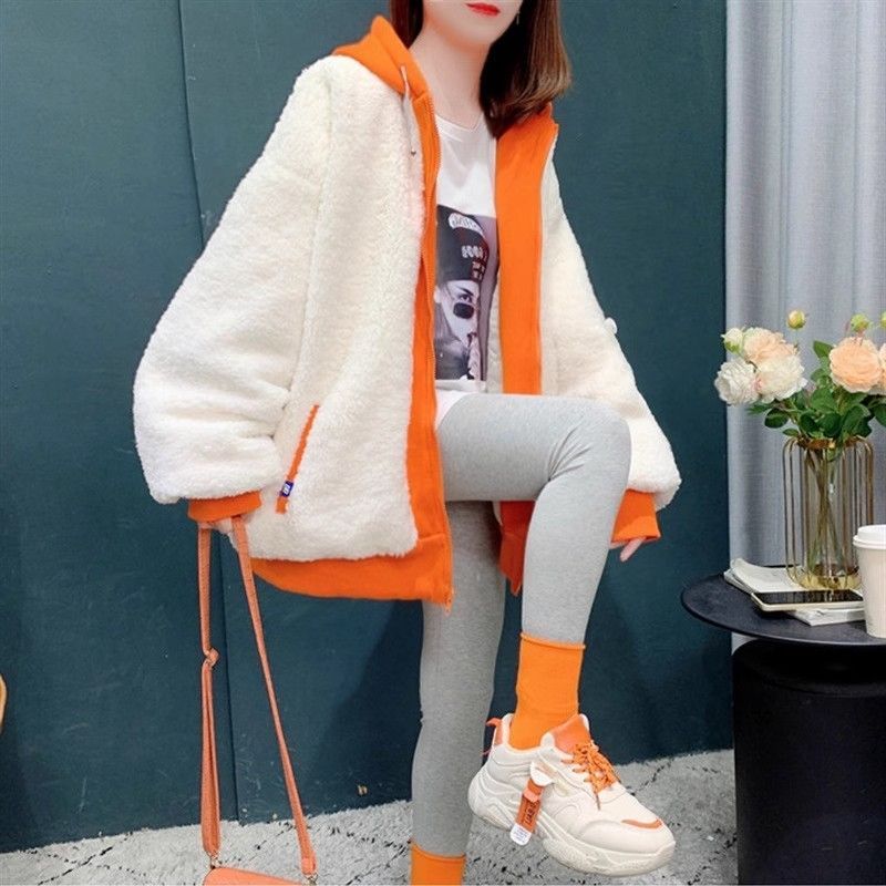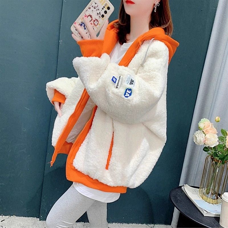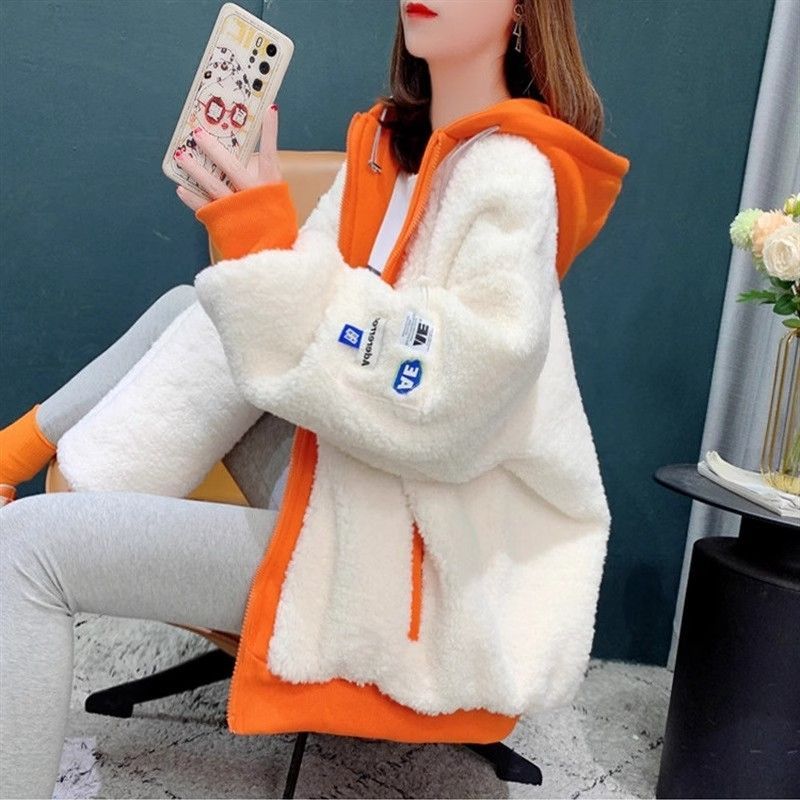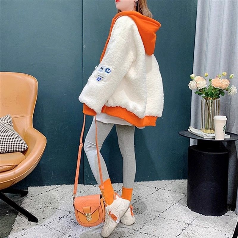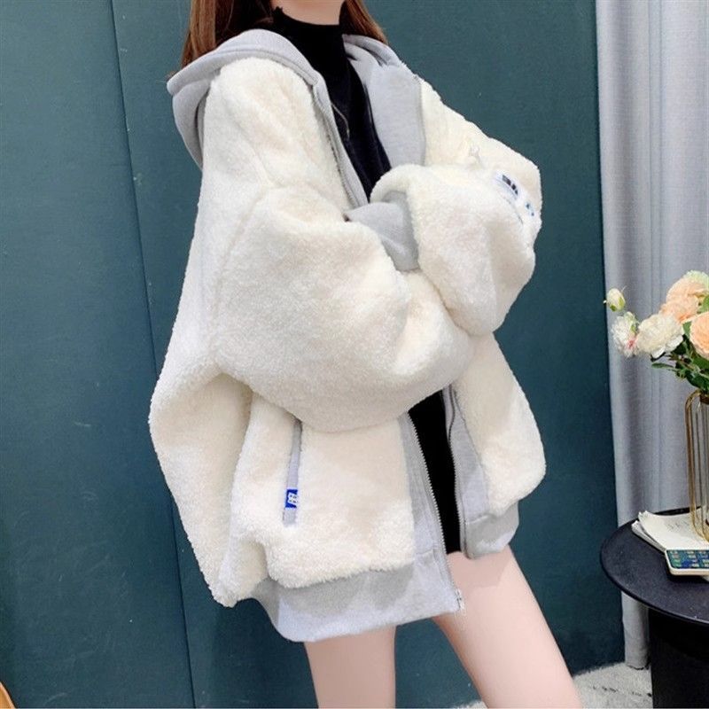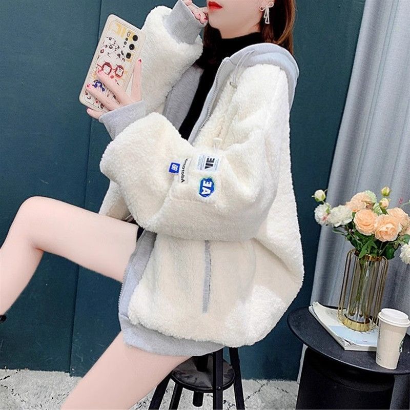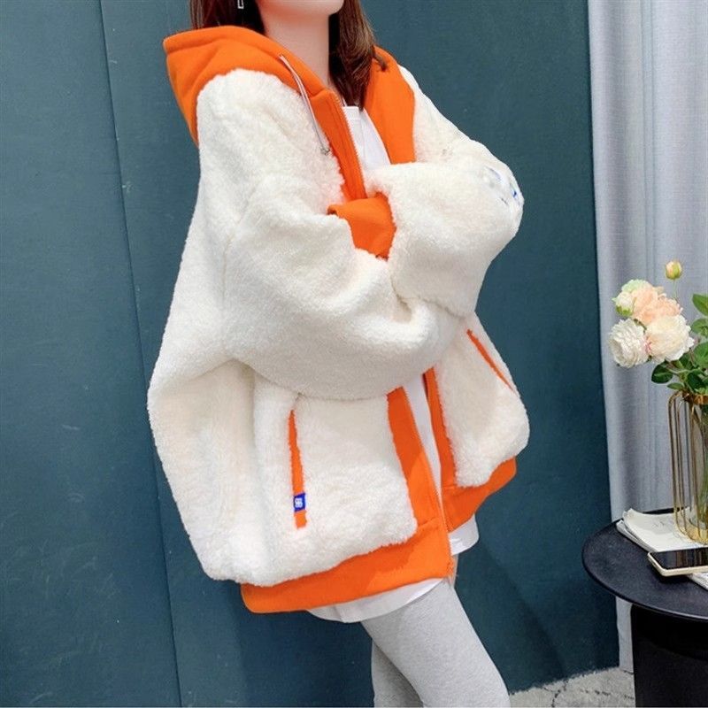米粒绒复合牛奶丝休闲慵懒风拼色连帽卫衣外套