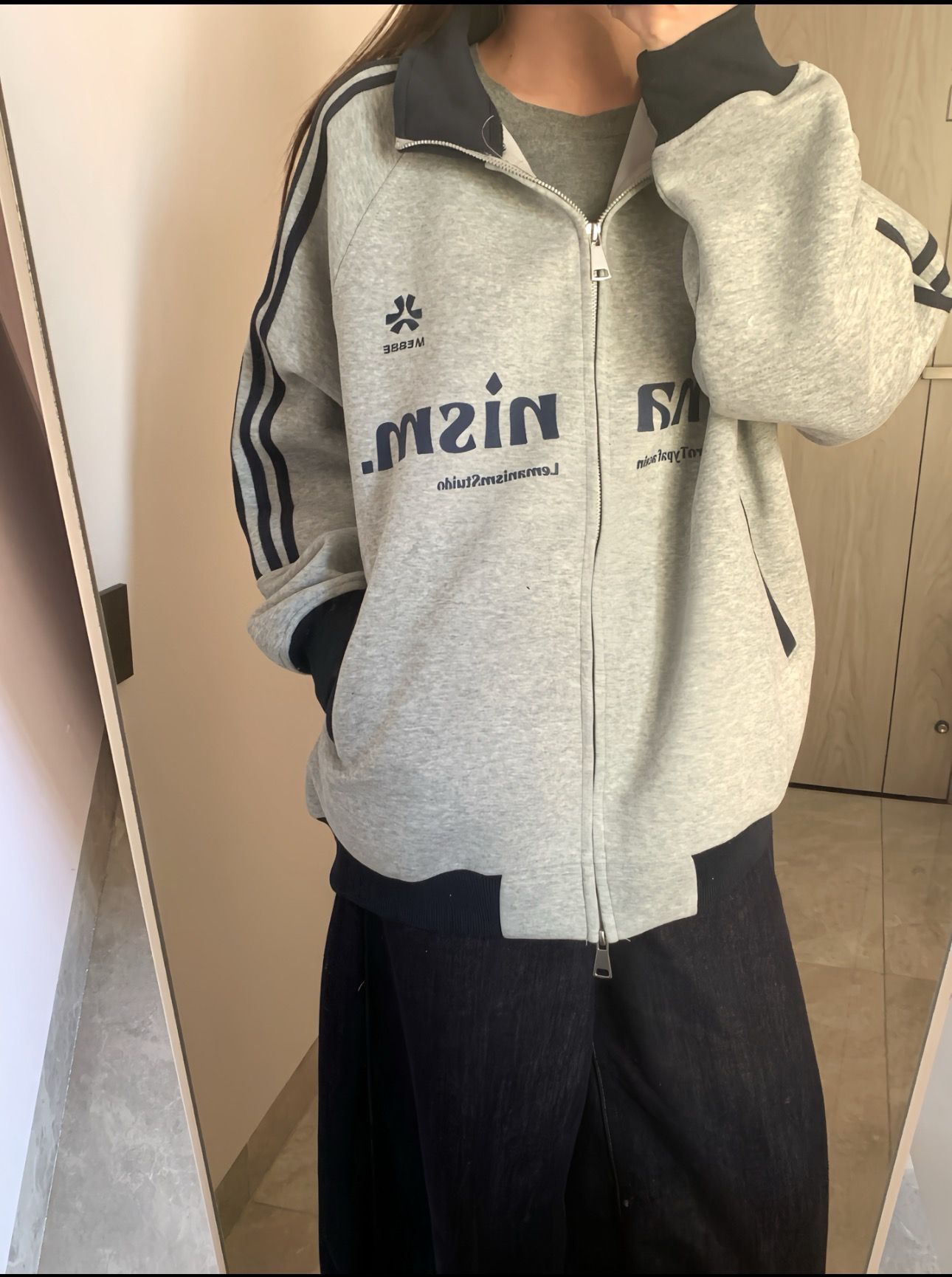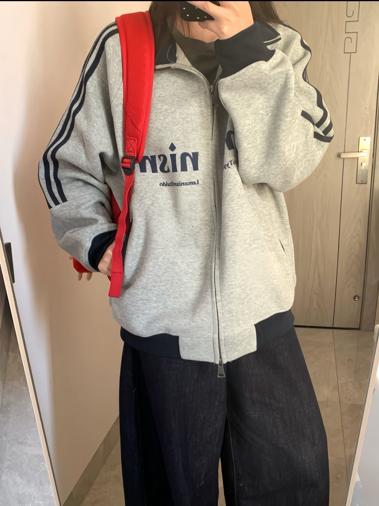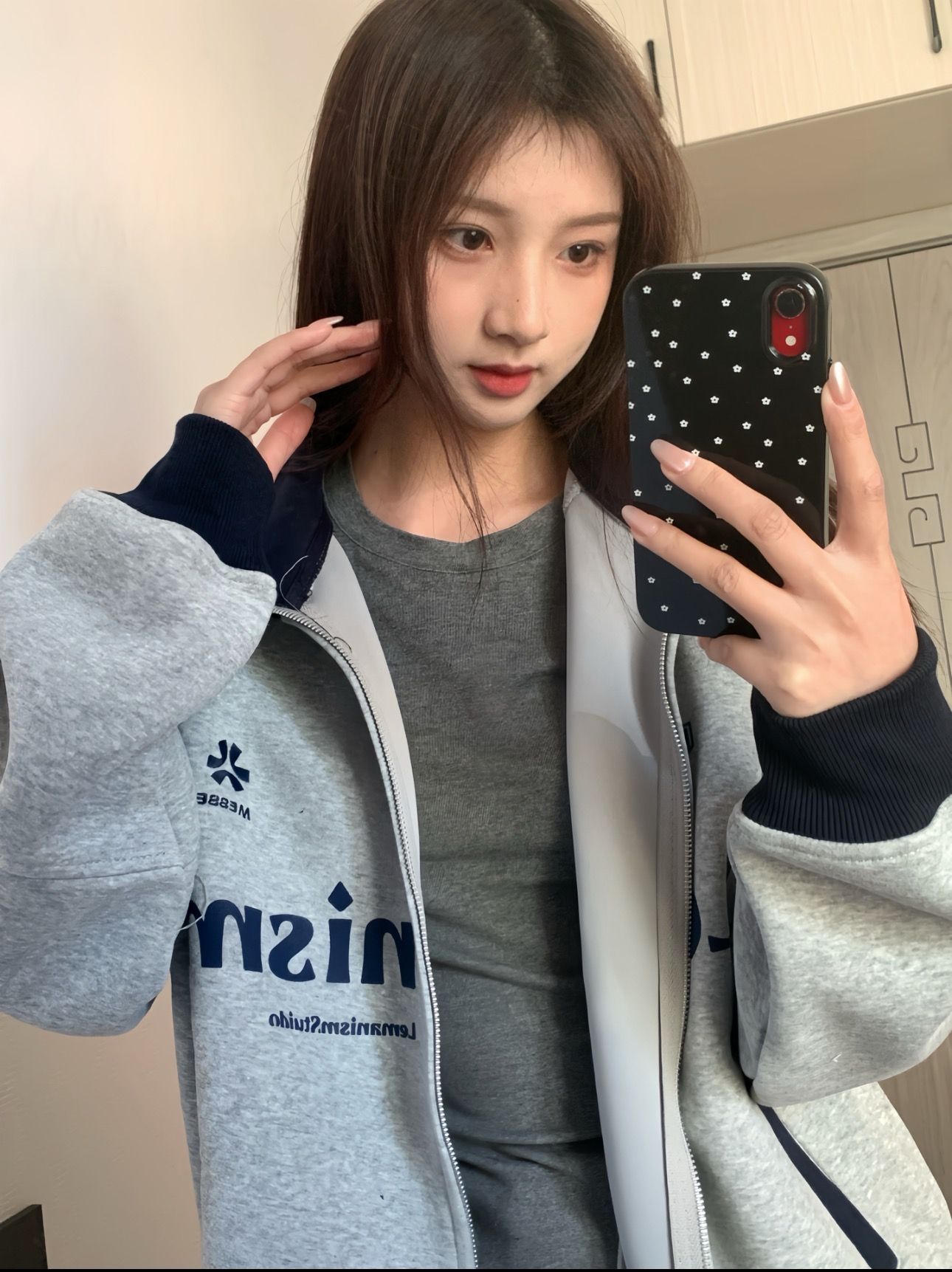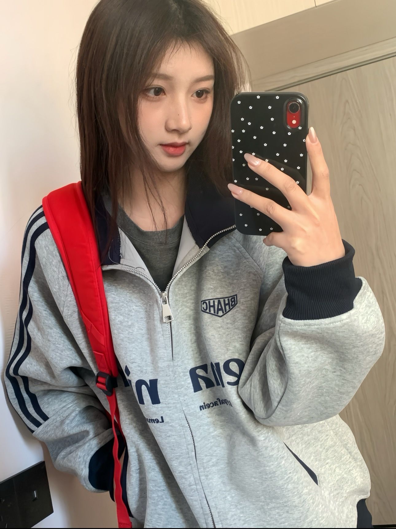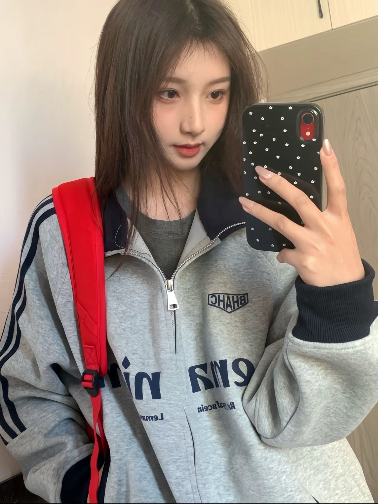 华棉复合牛奶丝春秋薄款学院风拼色设计立领卫衣