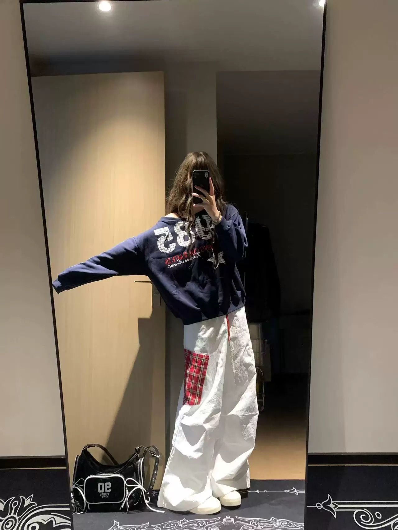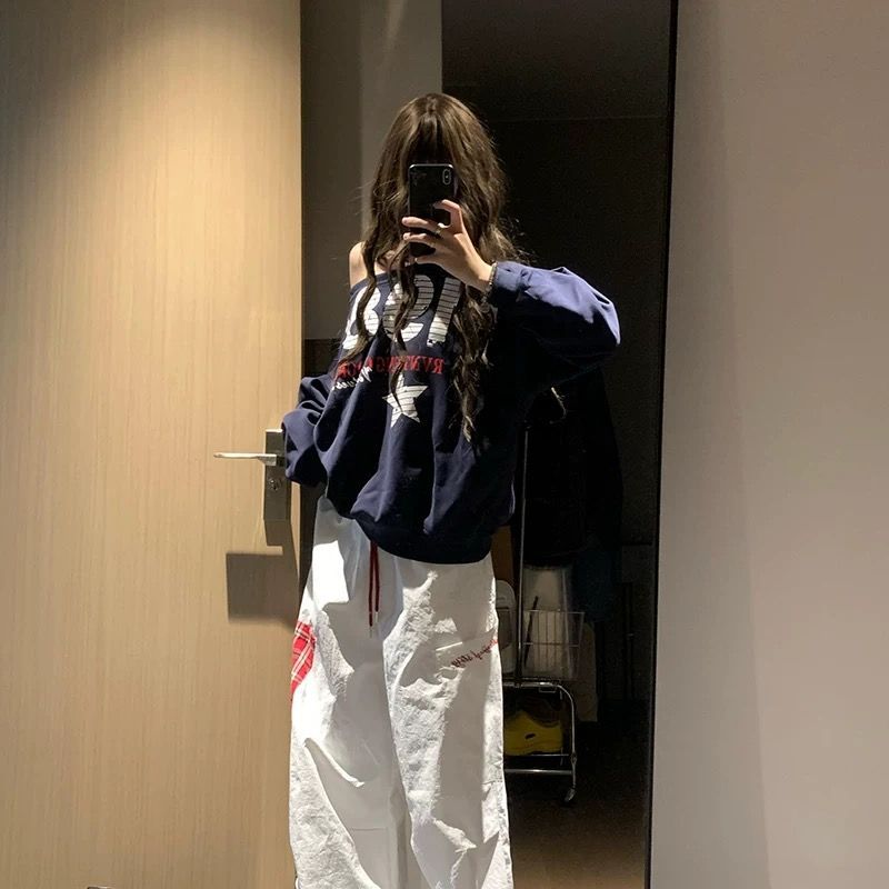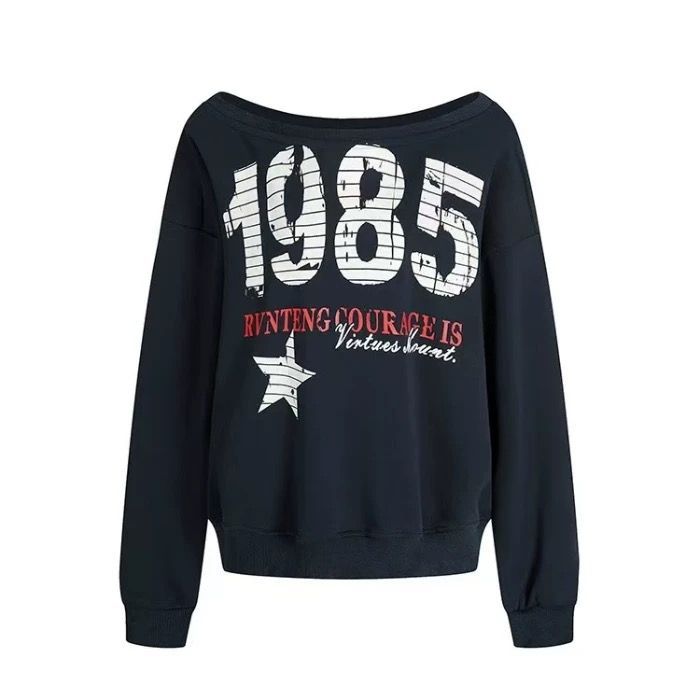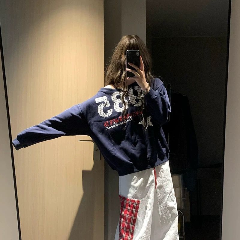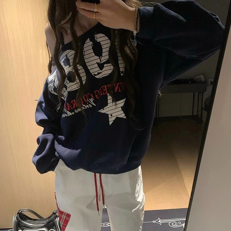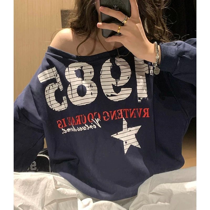 华棉复合牛奶丝春秋薄款印花慵懒风斜领卫衣
