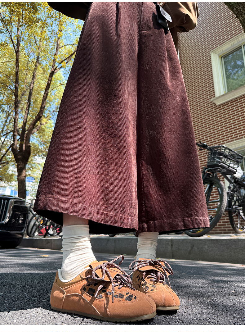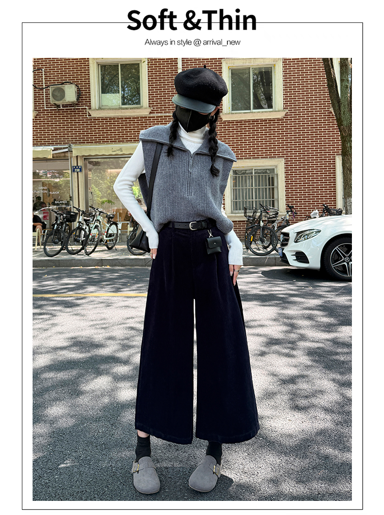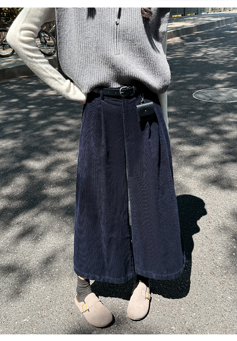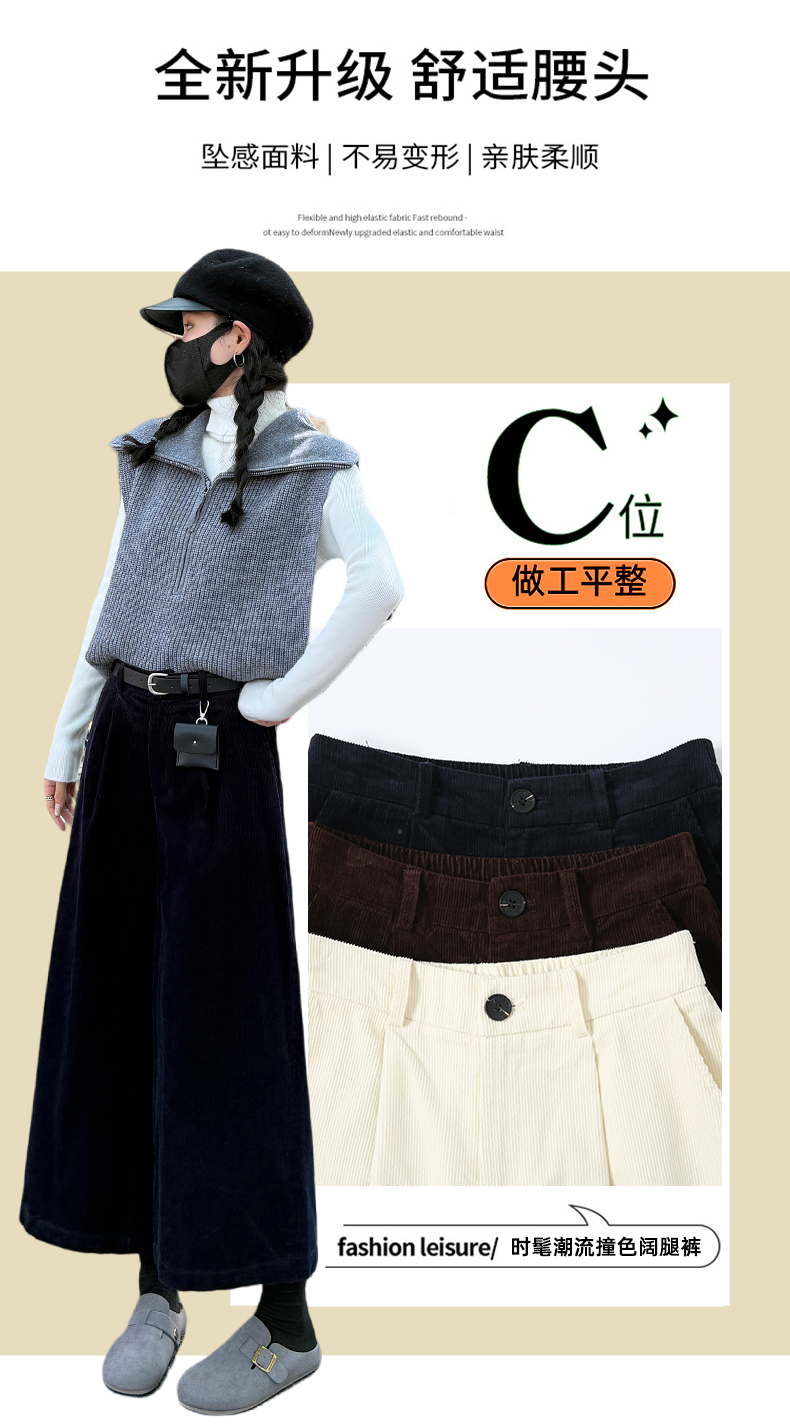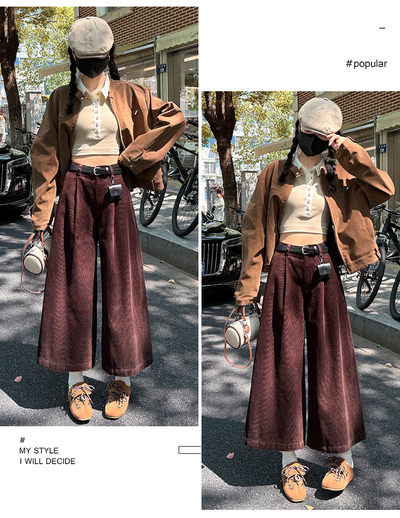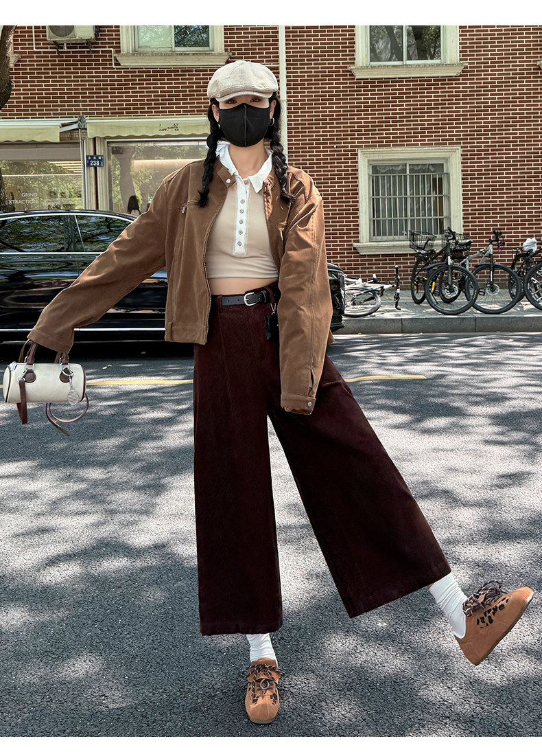 实拍复古灯芯绒阔腿八分裤2025秋季纯色百搭半松紧腰头显瘦休闲裤
