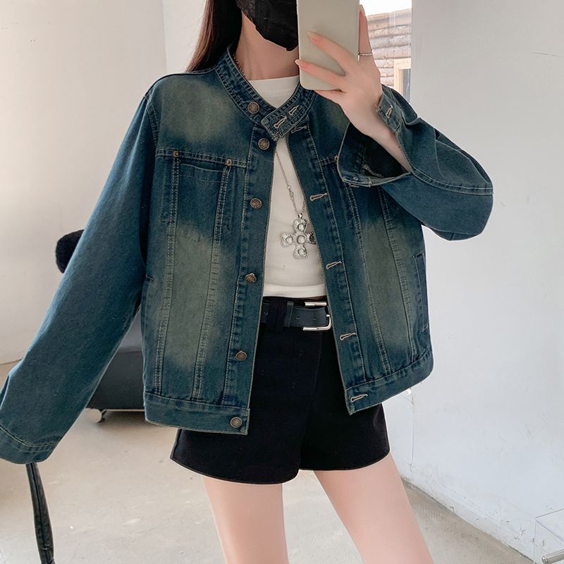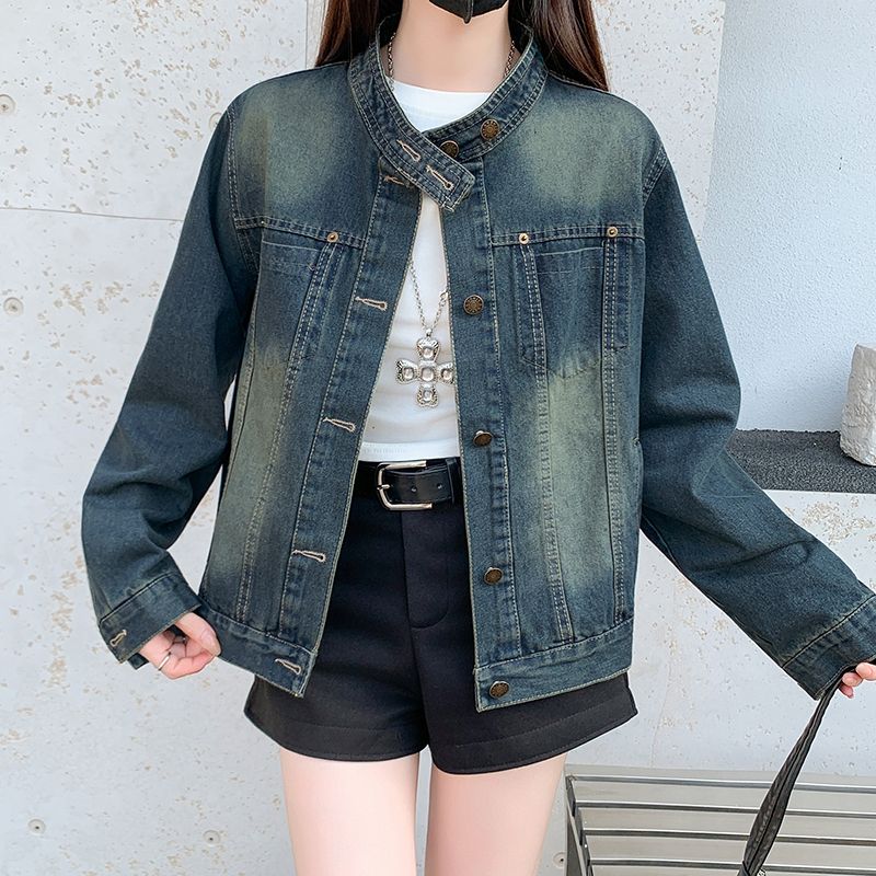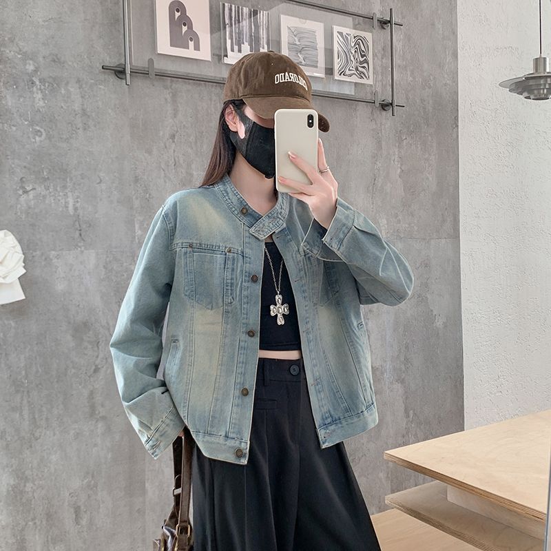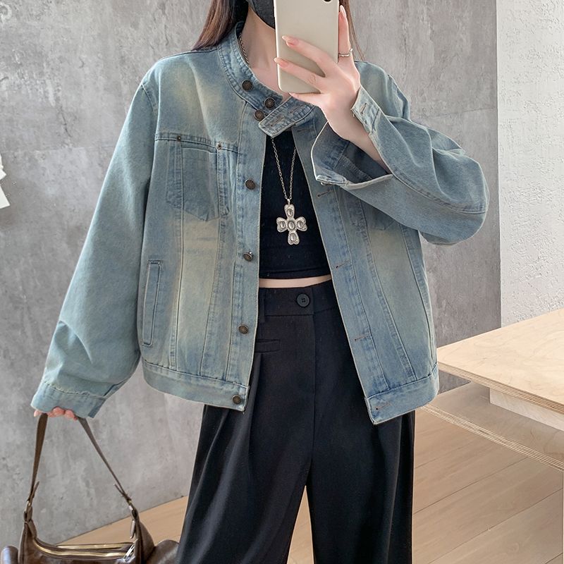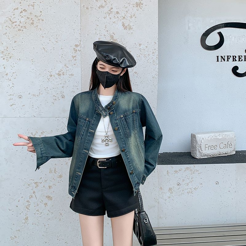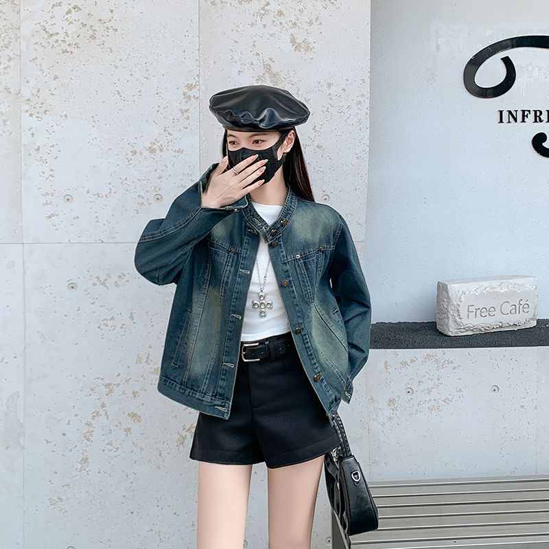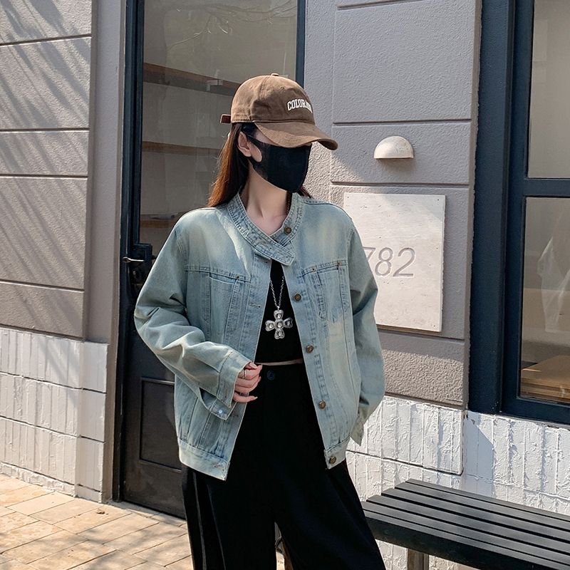 实拍实价~复古宽松牛仔外套女新款设计感立领牛仔短款夹克上衣潮