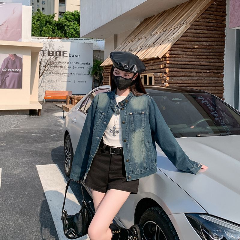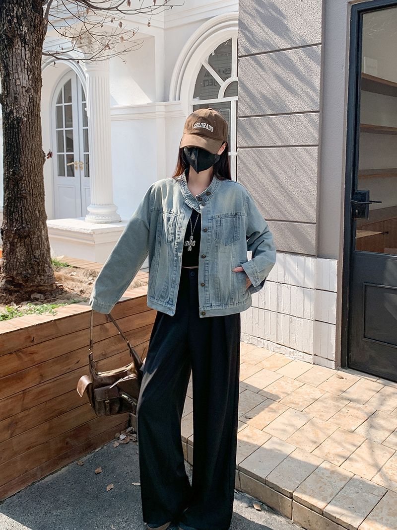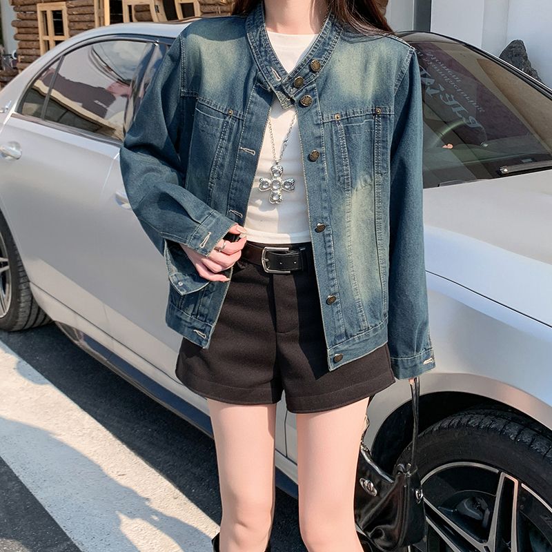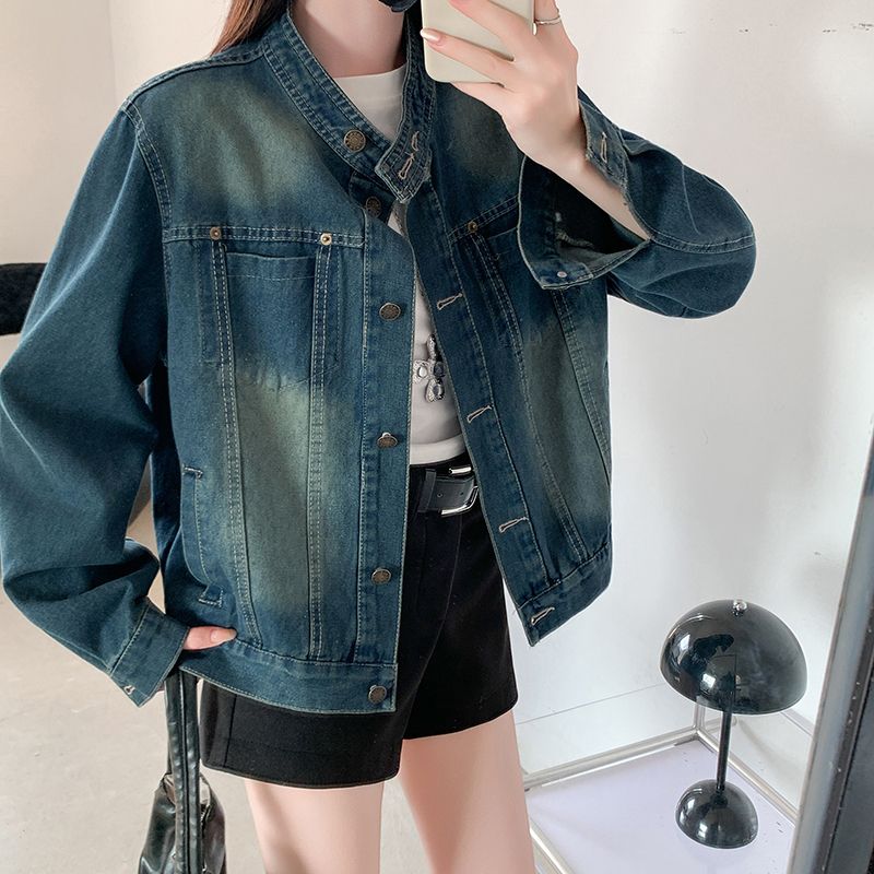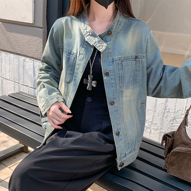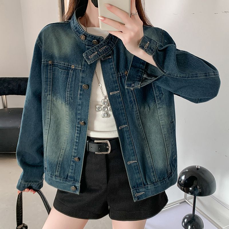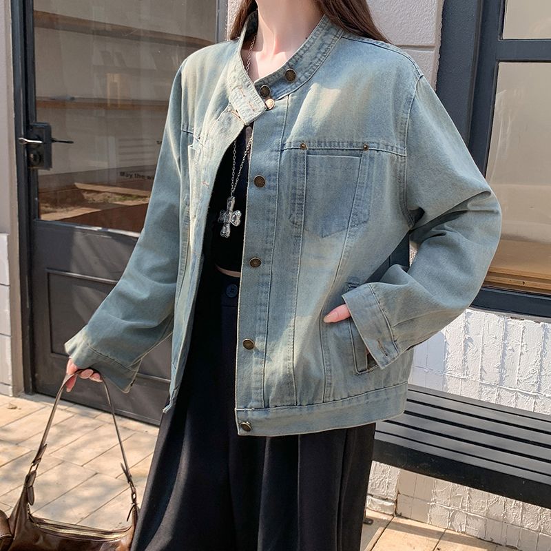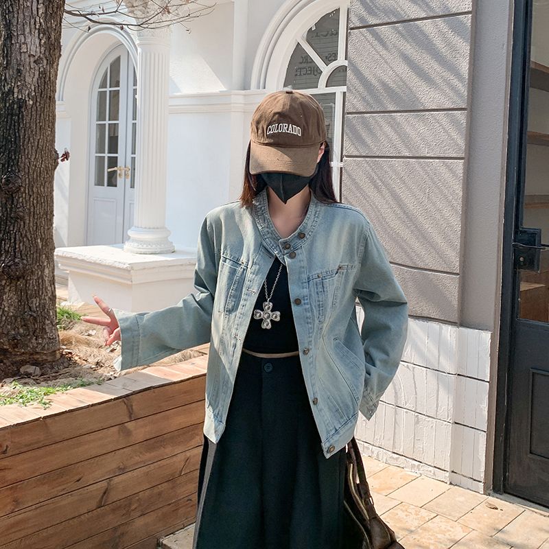 实拍实价~复古宽松牛仔外套女新款设计感立领牛仔短款夹克上衣潮