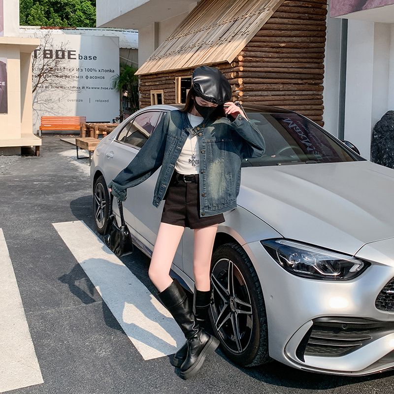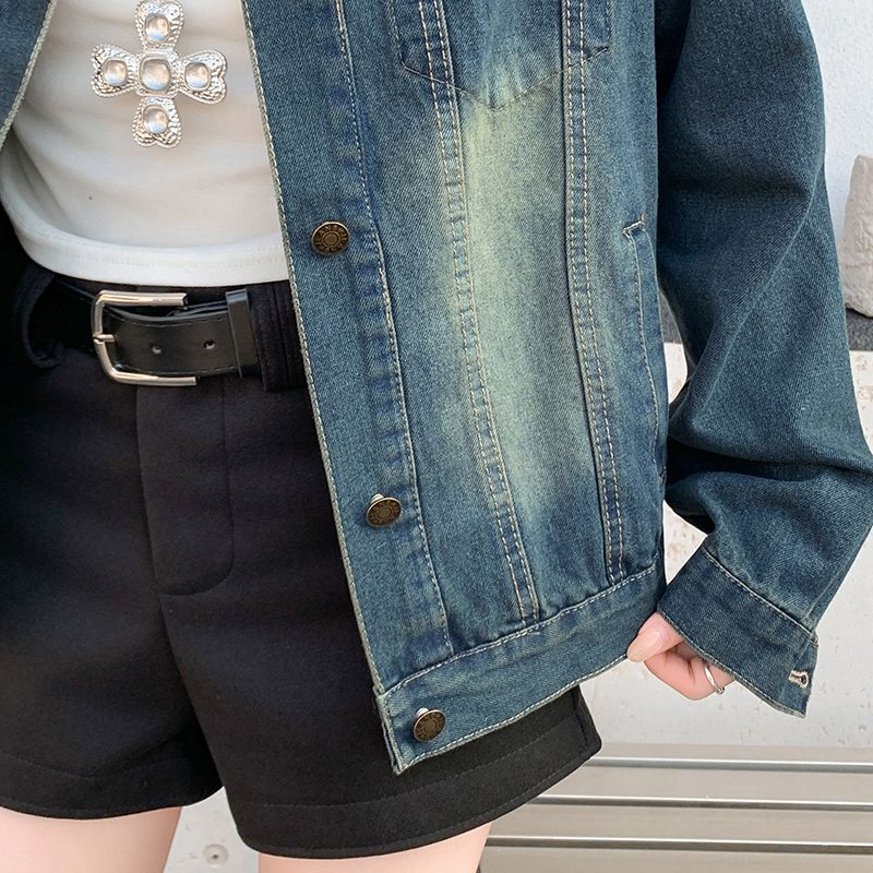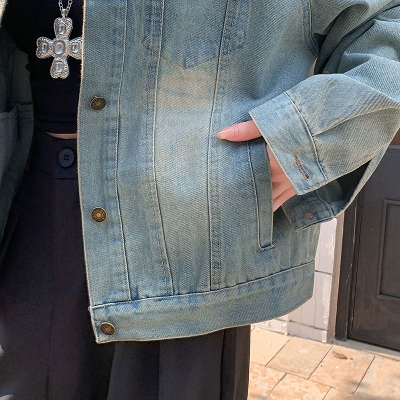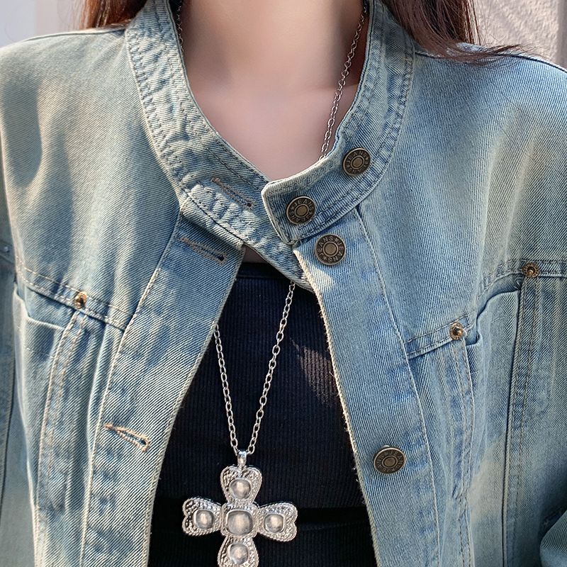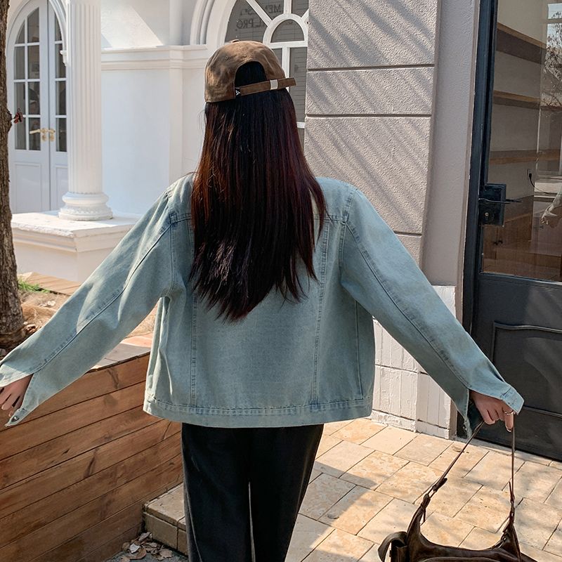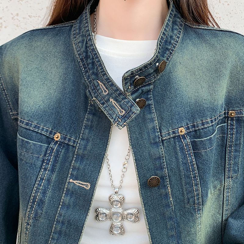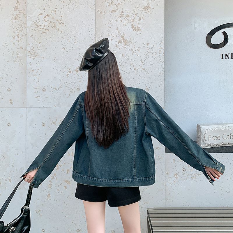 实拍实价~复古宽松牛仔外套女新款设计感立领牛仔短款夹克上衣潮