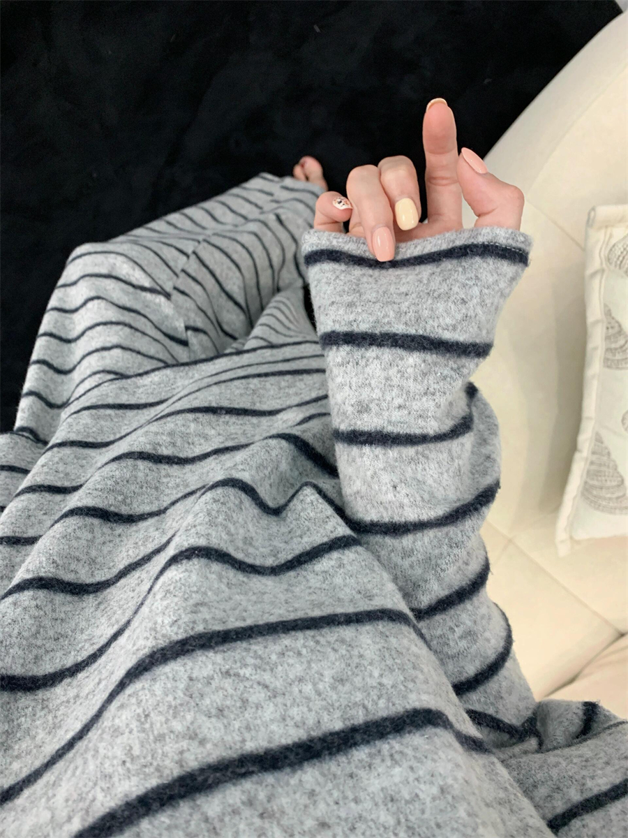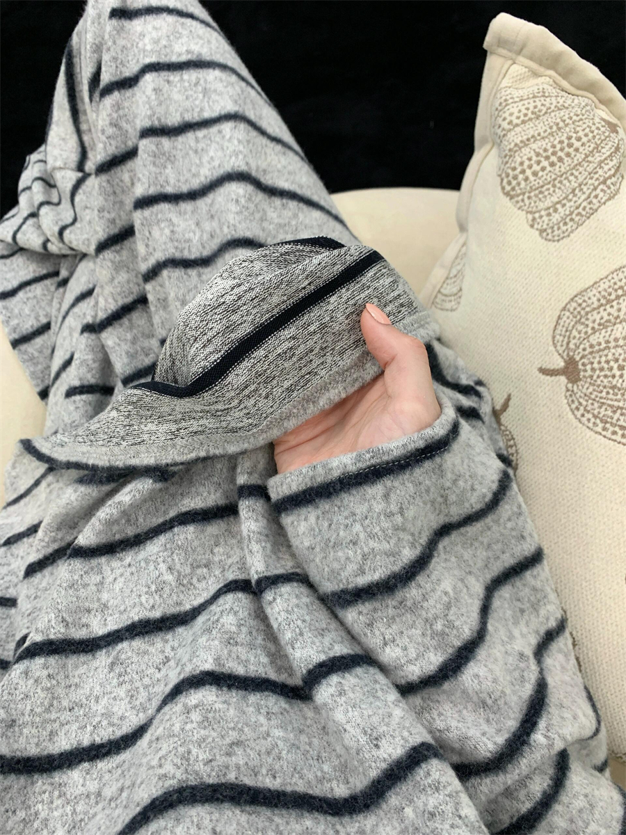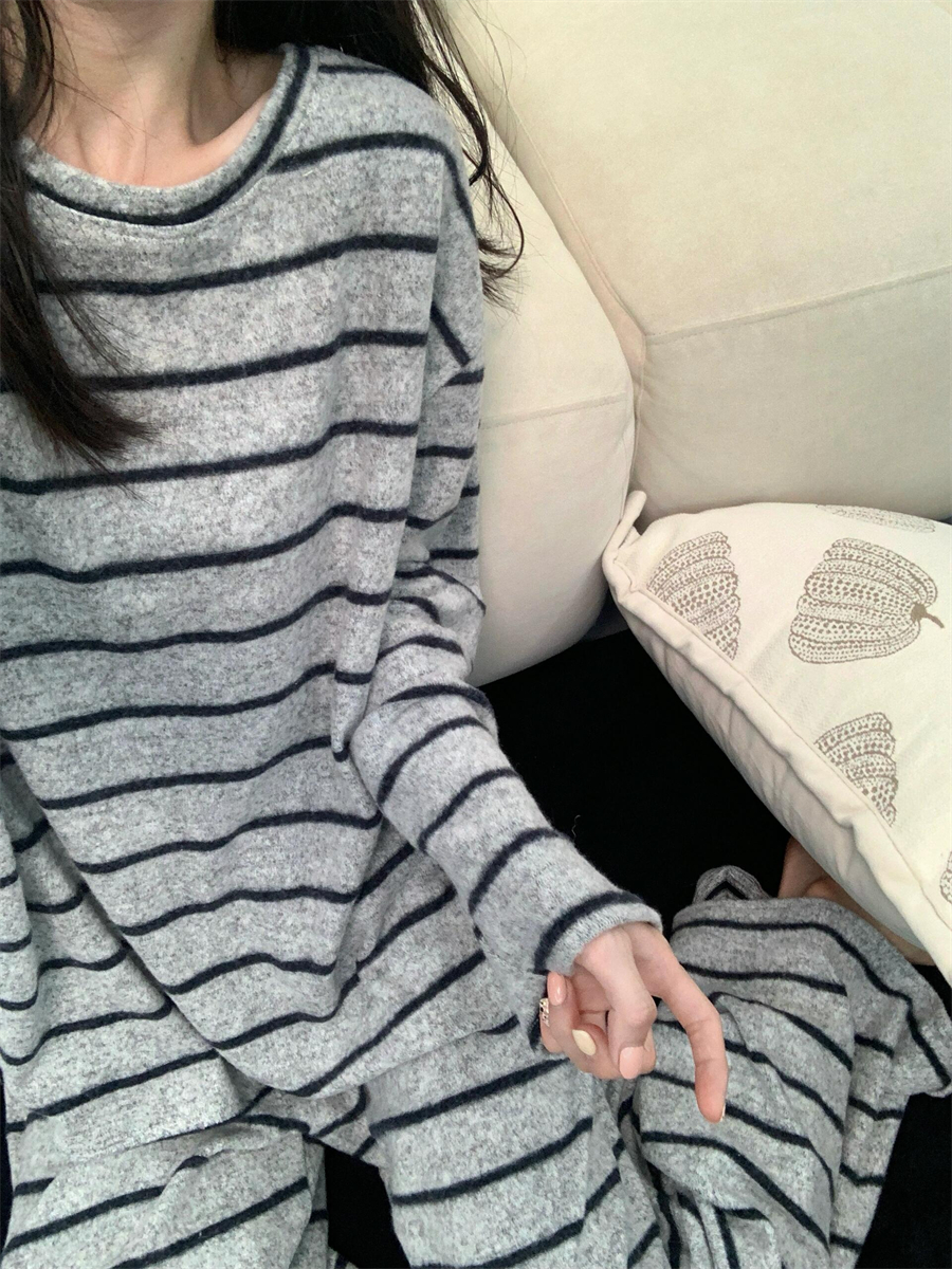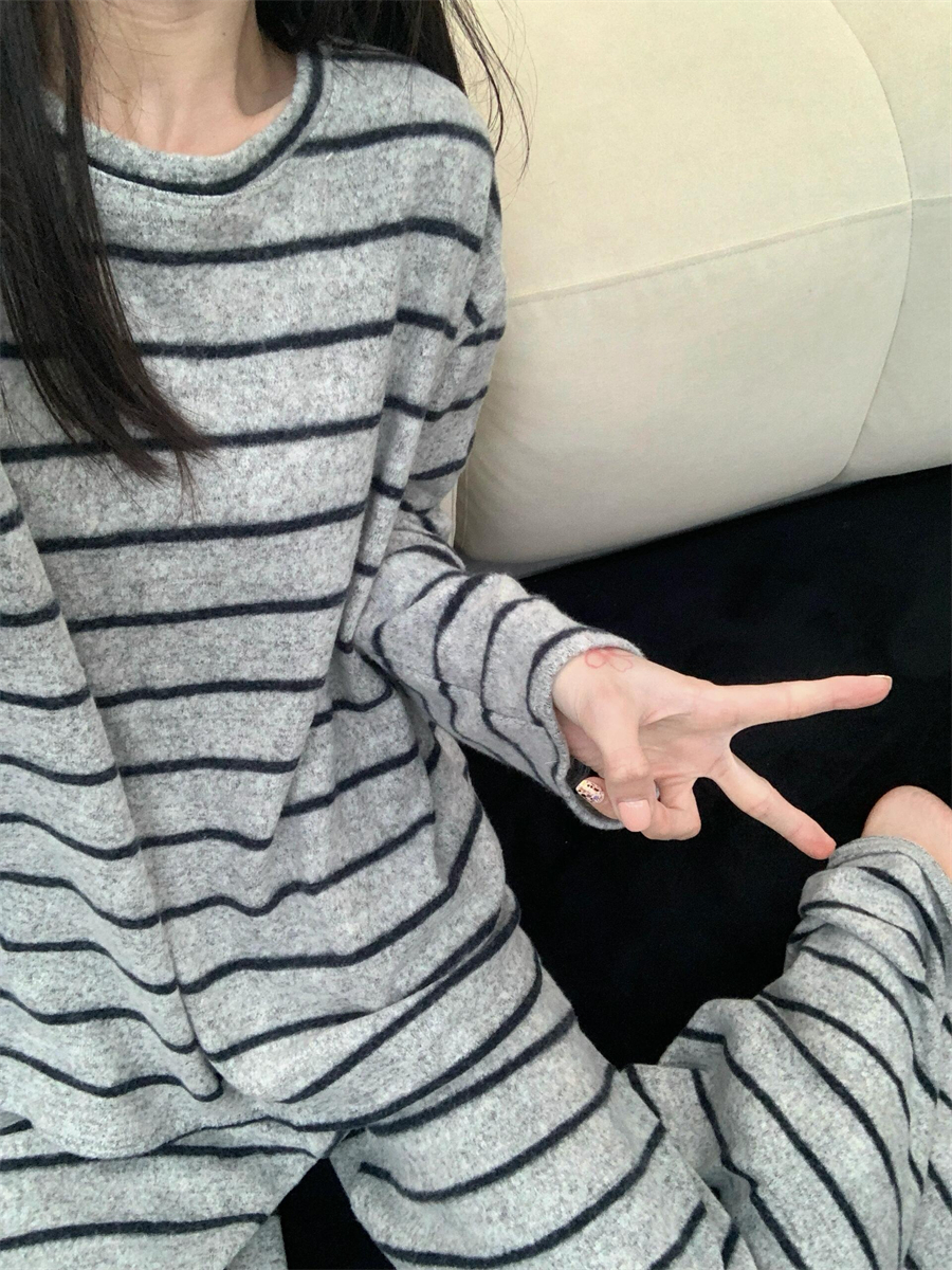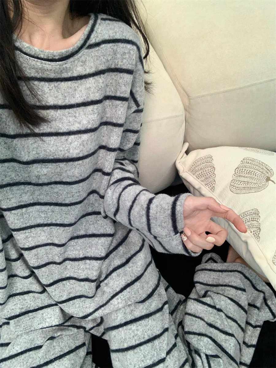 韩系简约条纹德绒睡衣女秋冬季保暖长袖长裤可外穿家居服套装官方