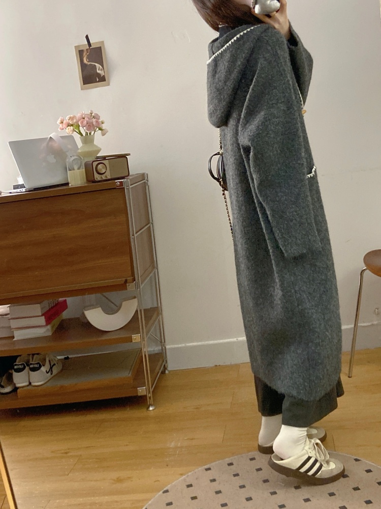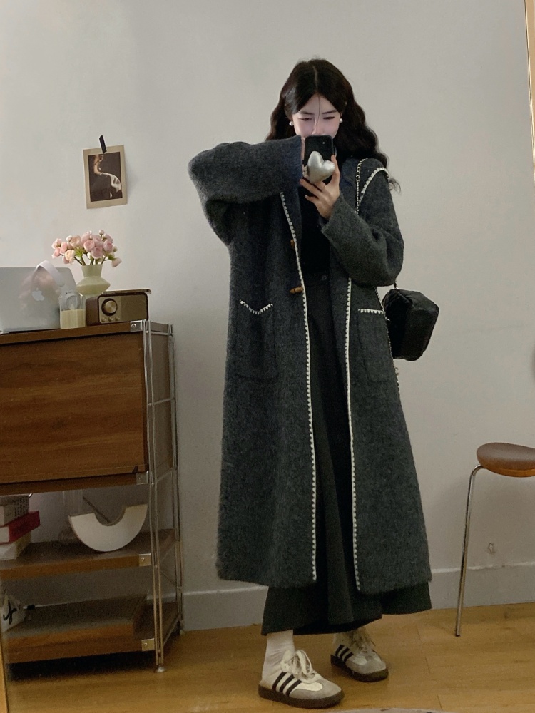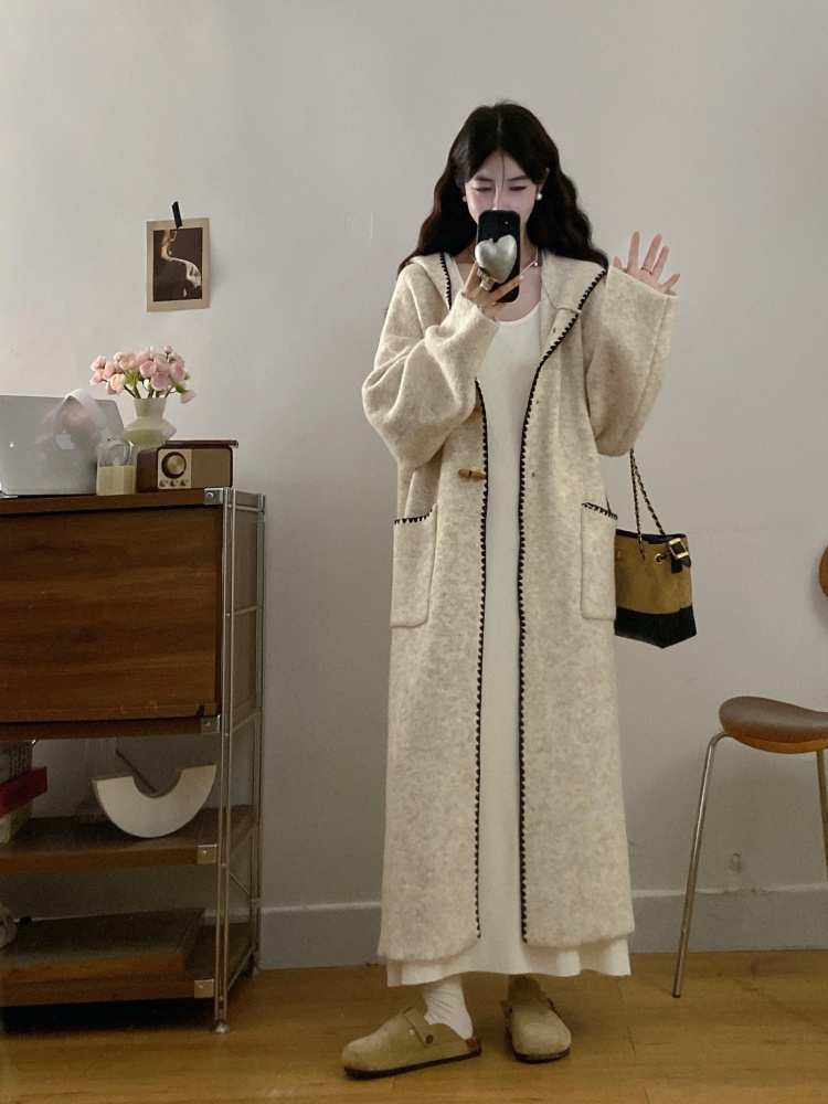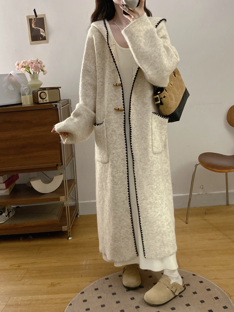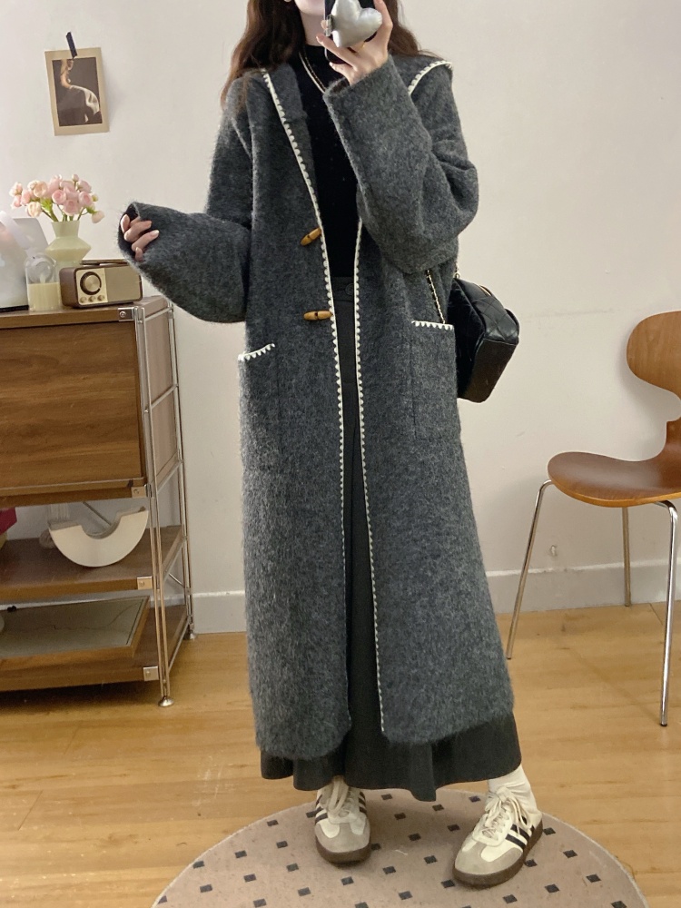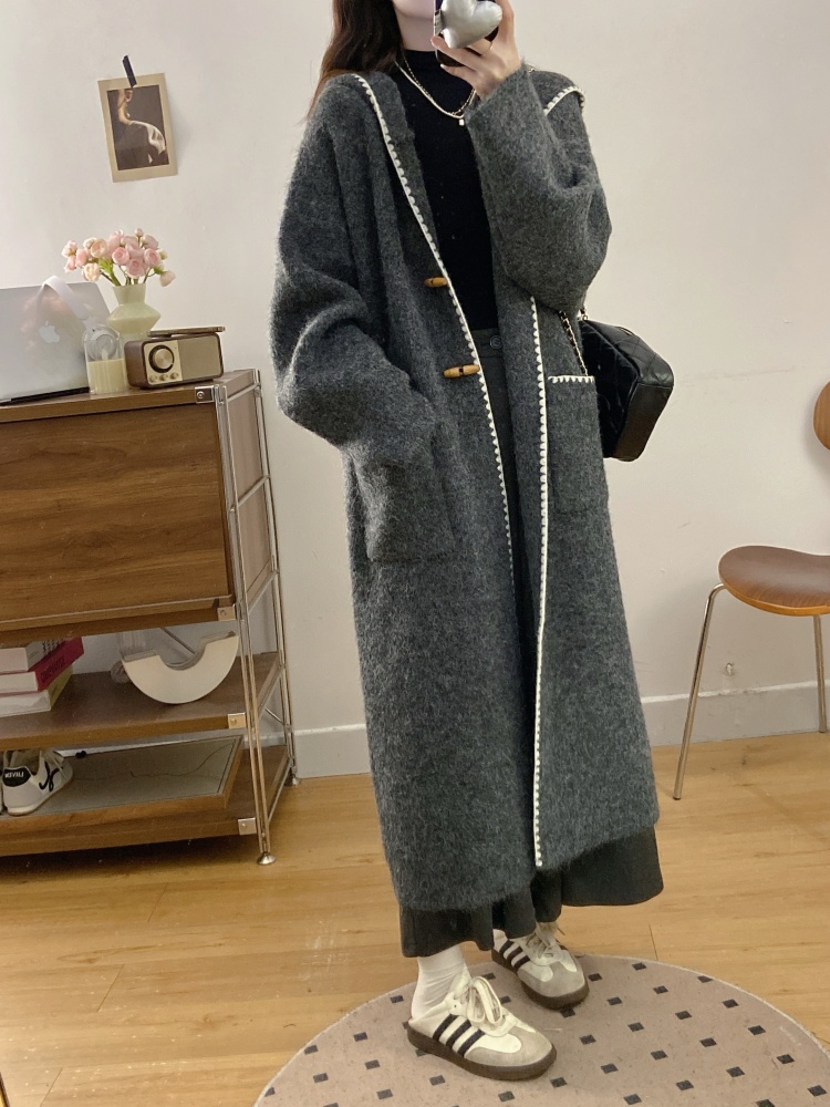实拍大码韩系高级感牛角扣猫牙花边慵懒风连帽针织毛衣大衣长外套