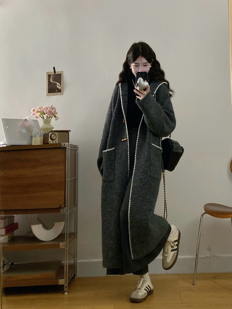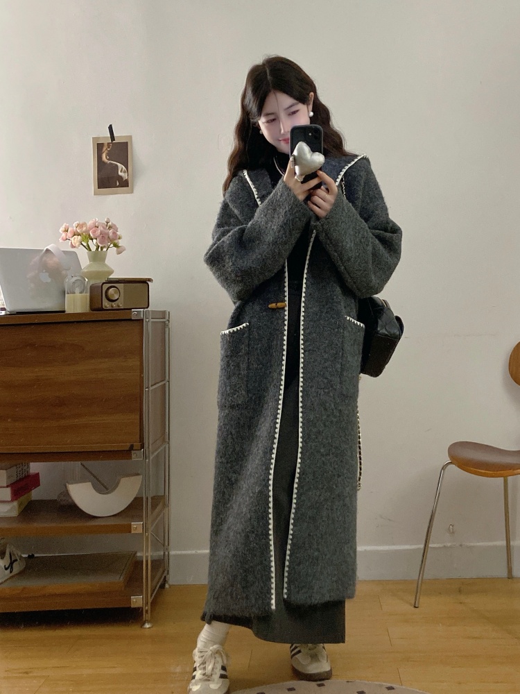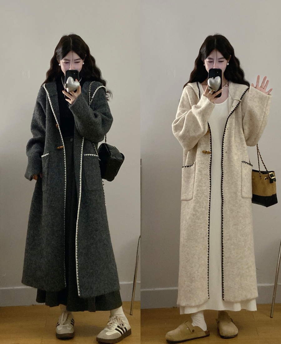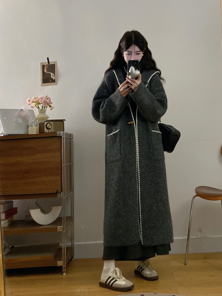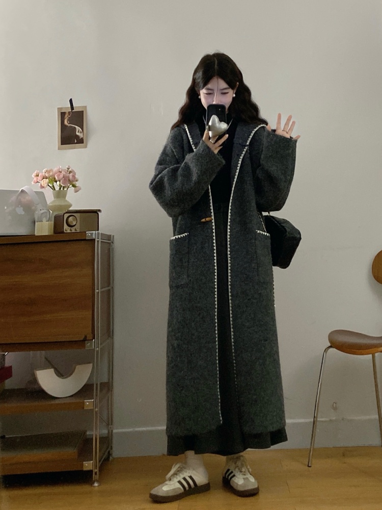 实拍大码韩系高级感牛角扣猫牙花边慵懒风连帽针织毛衣大衣长外套