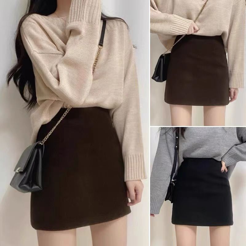 安全裤+拉链毛呢半身裙秋冬季新款高腰显瘦包臀裙短