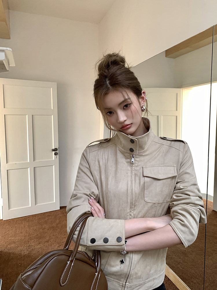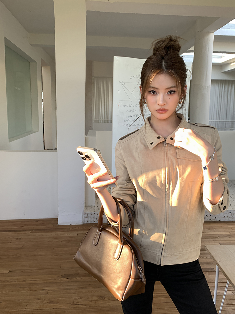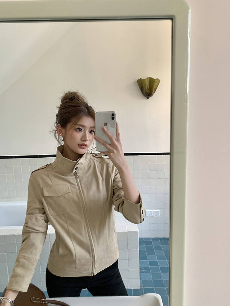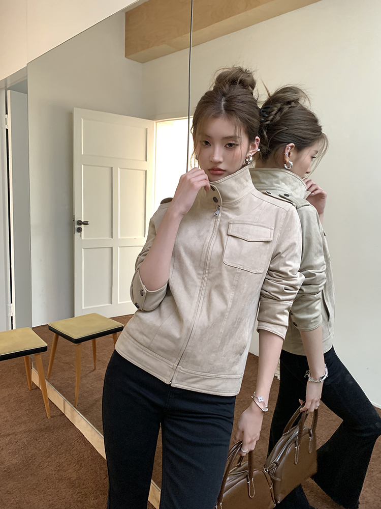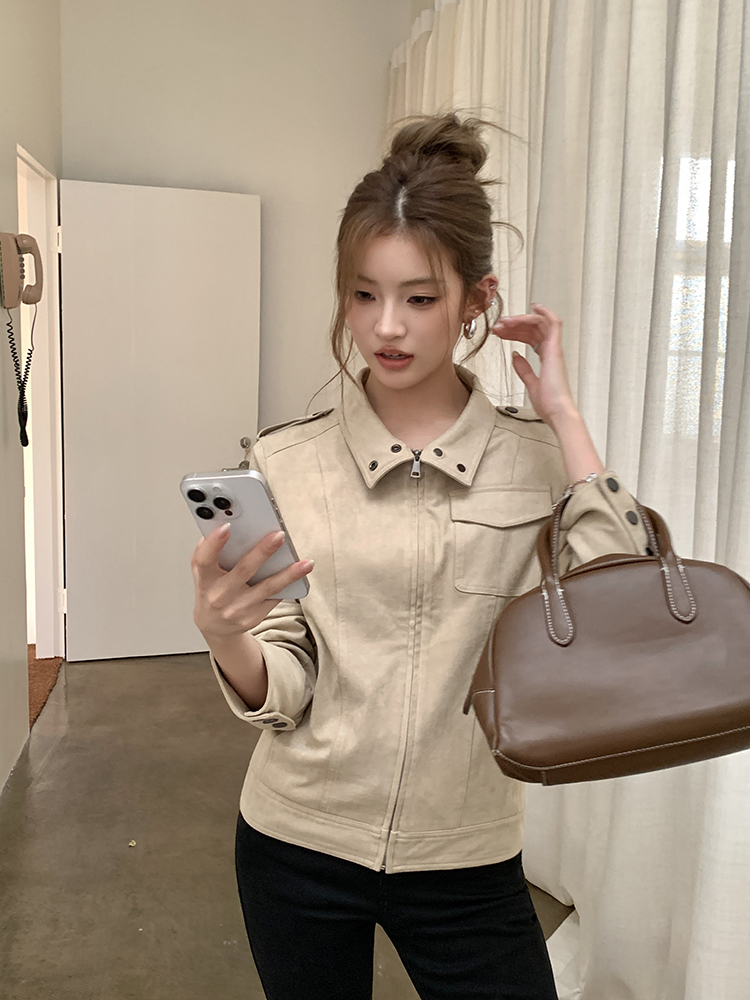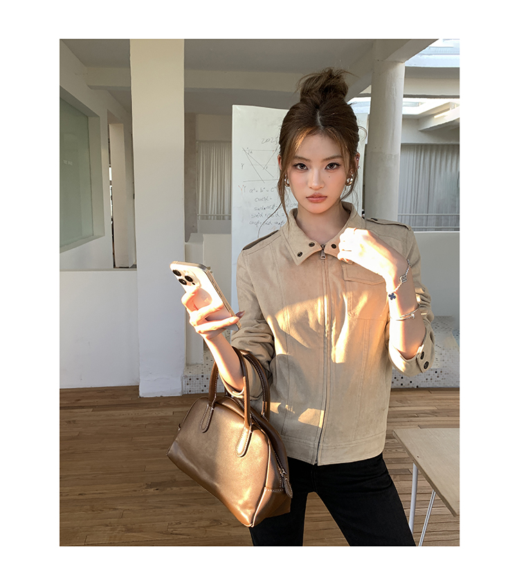 实拍2025秋冬新款美式复古牛皮绒短款夹克外套女休闲百搭长袖上衣