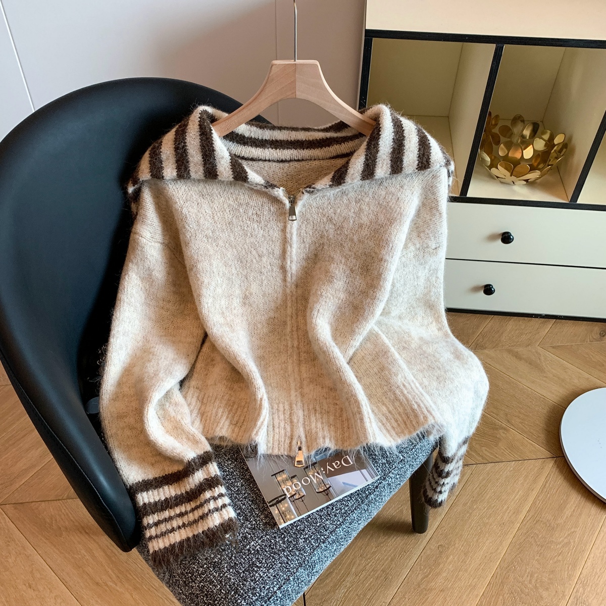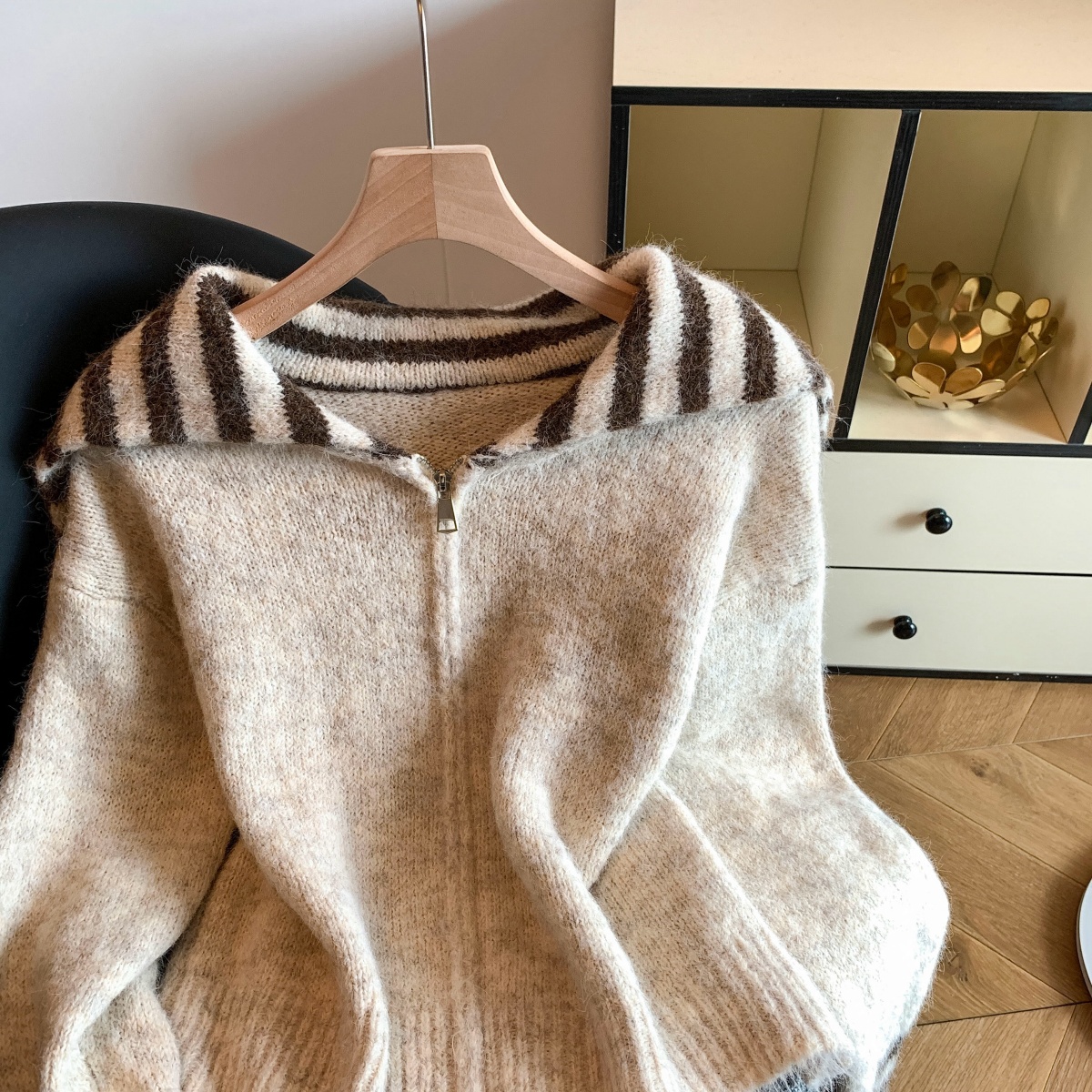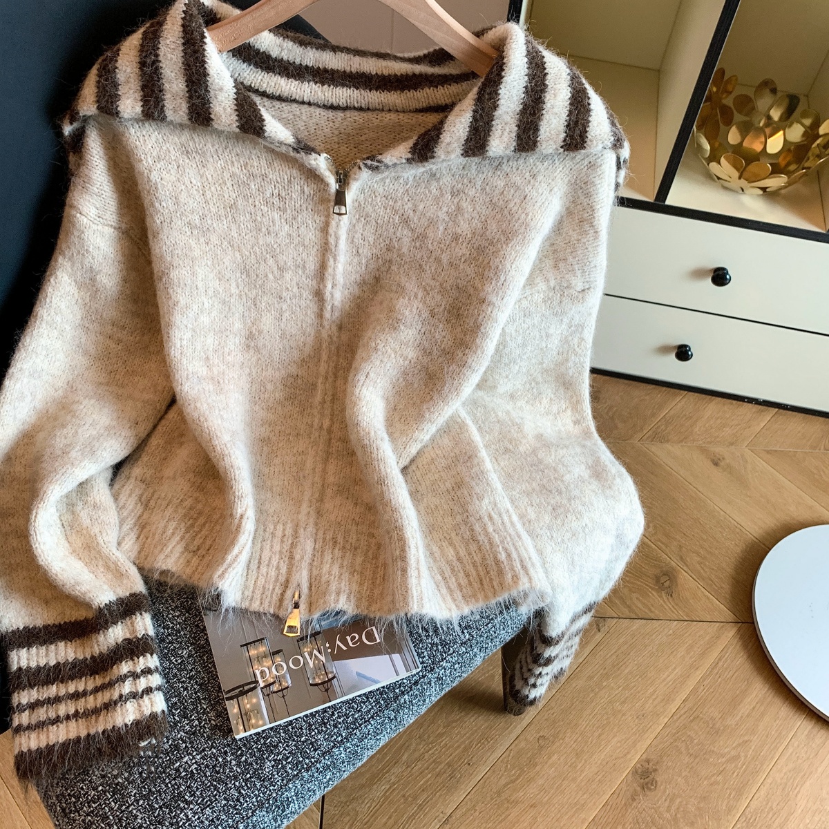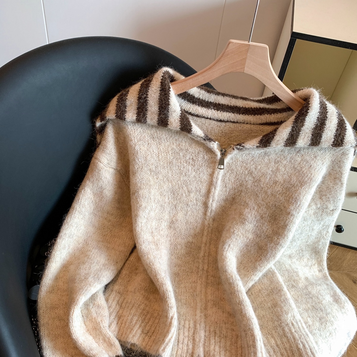 实拍海军领条纹拉链针织开衫毛衣外套女秋冬季学院风开衫宽松上衣