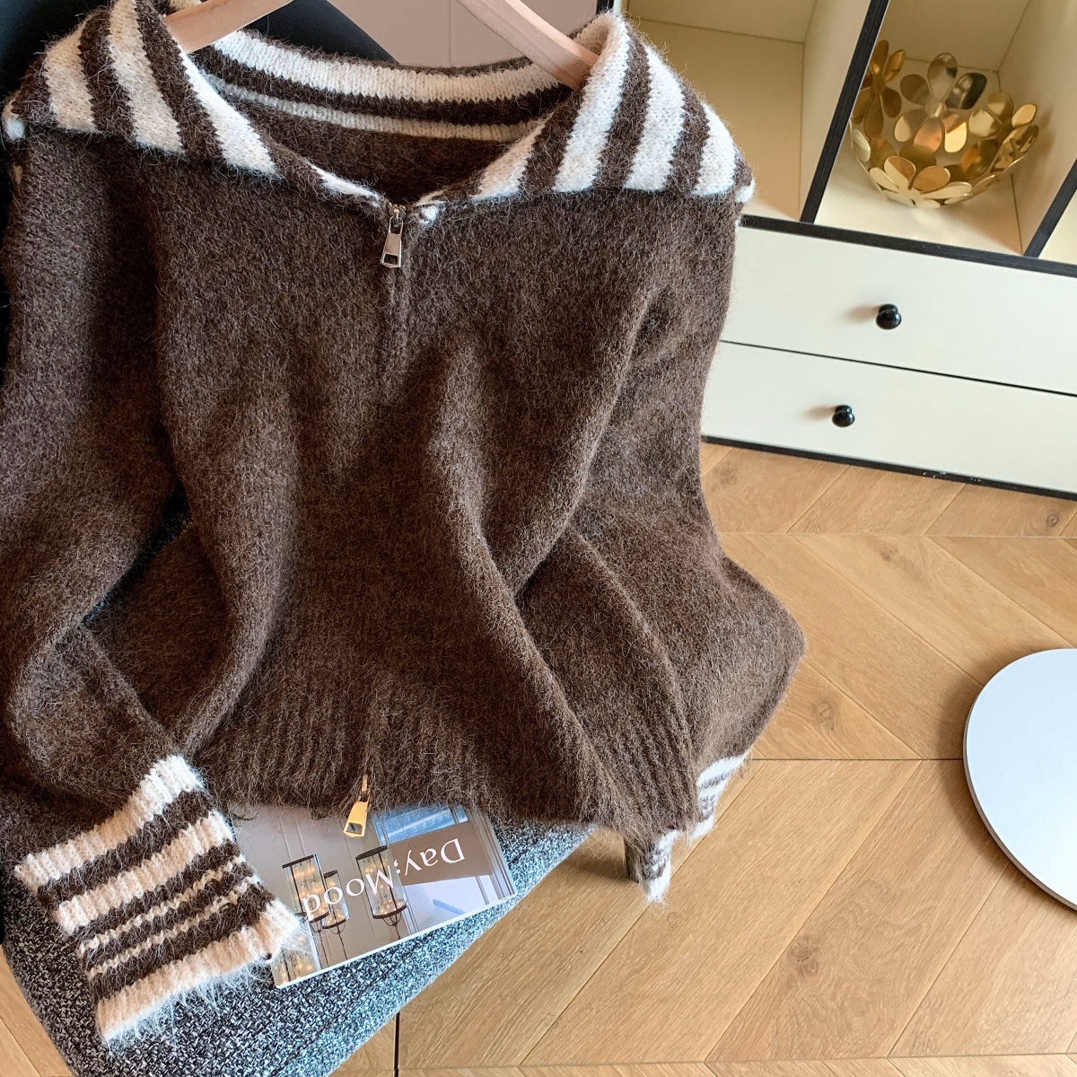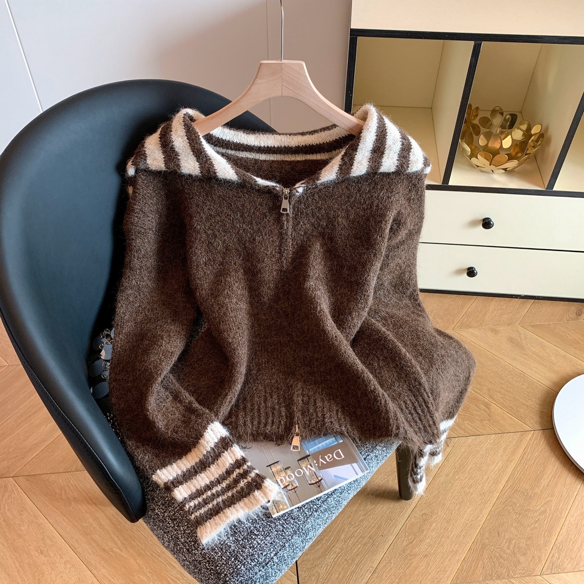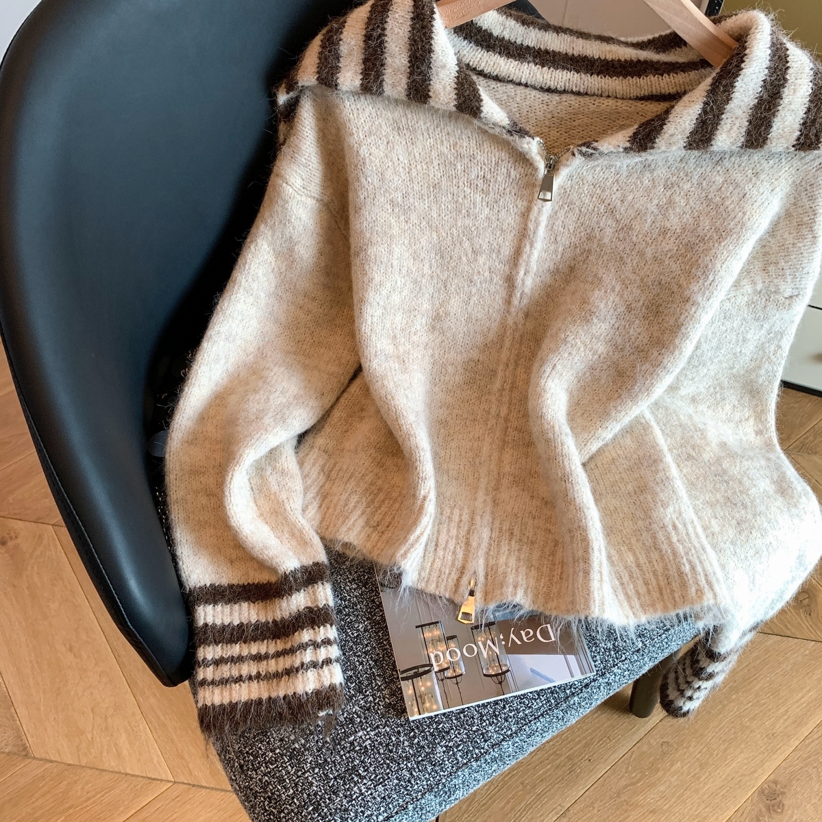 实拍海军领条纹拉链针织开衫毛衣外套女秋冬季学院风开衫宽松上衣