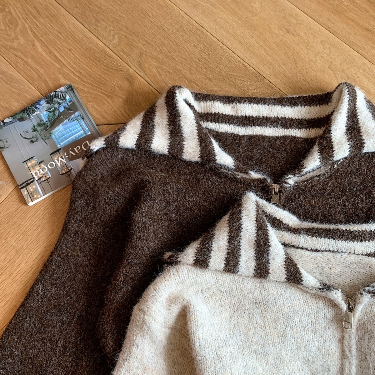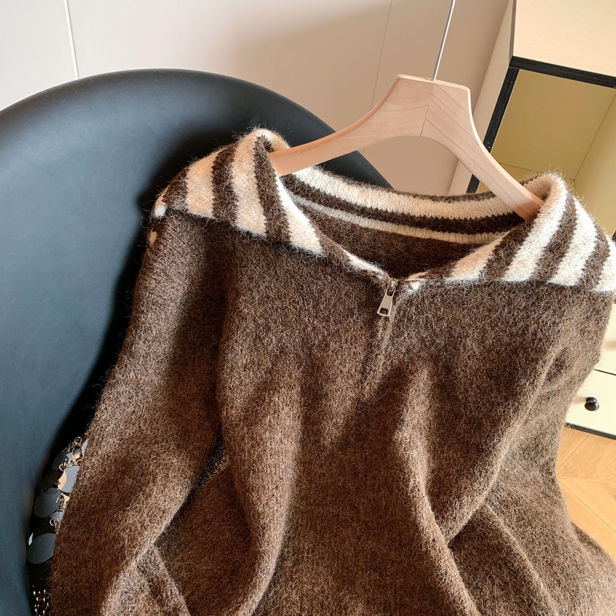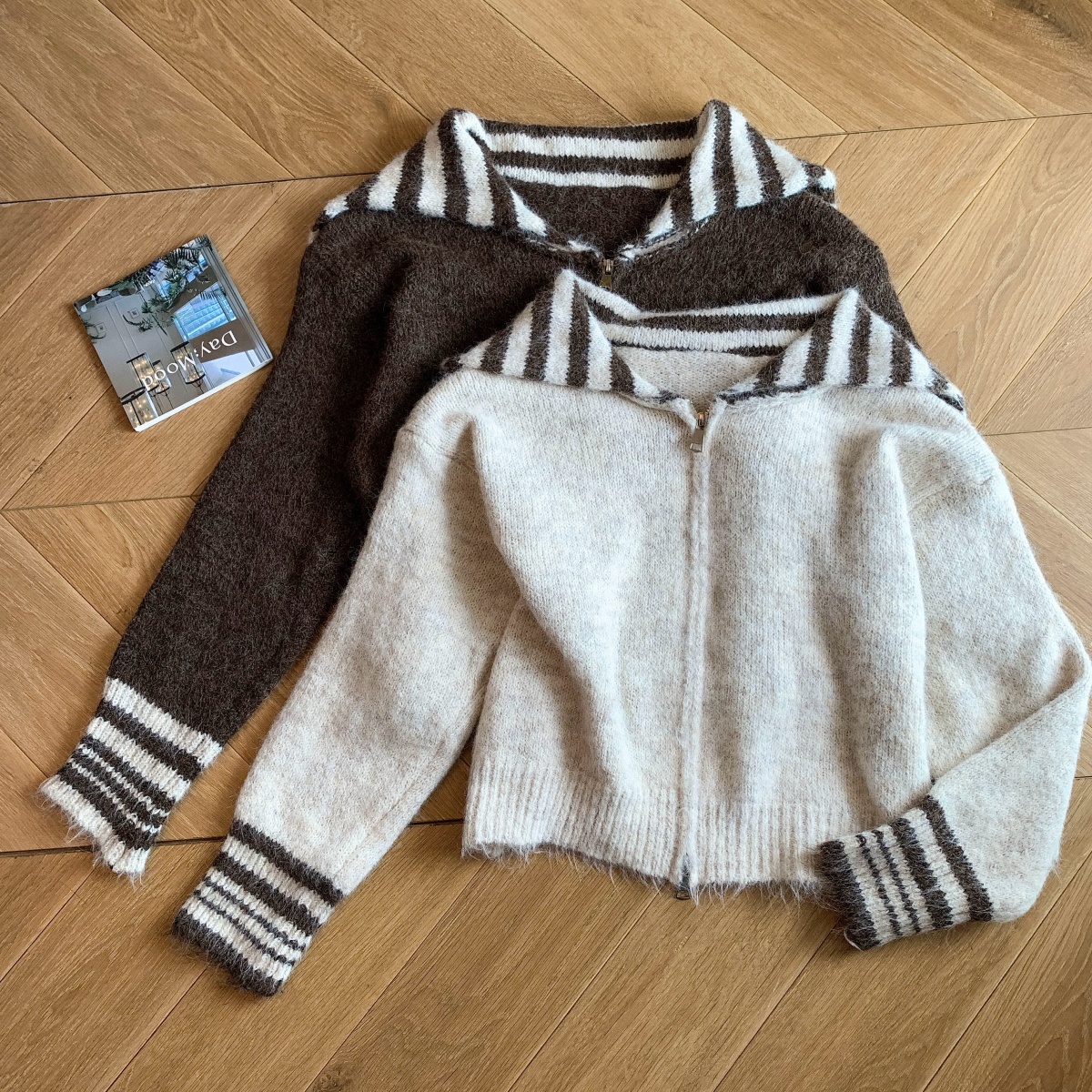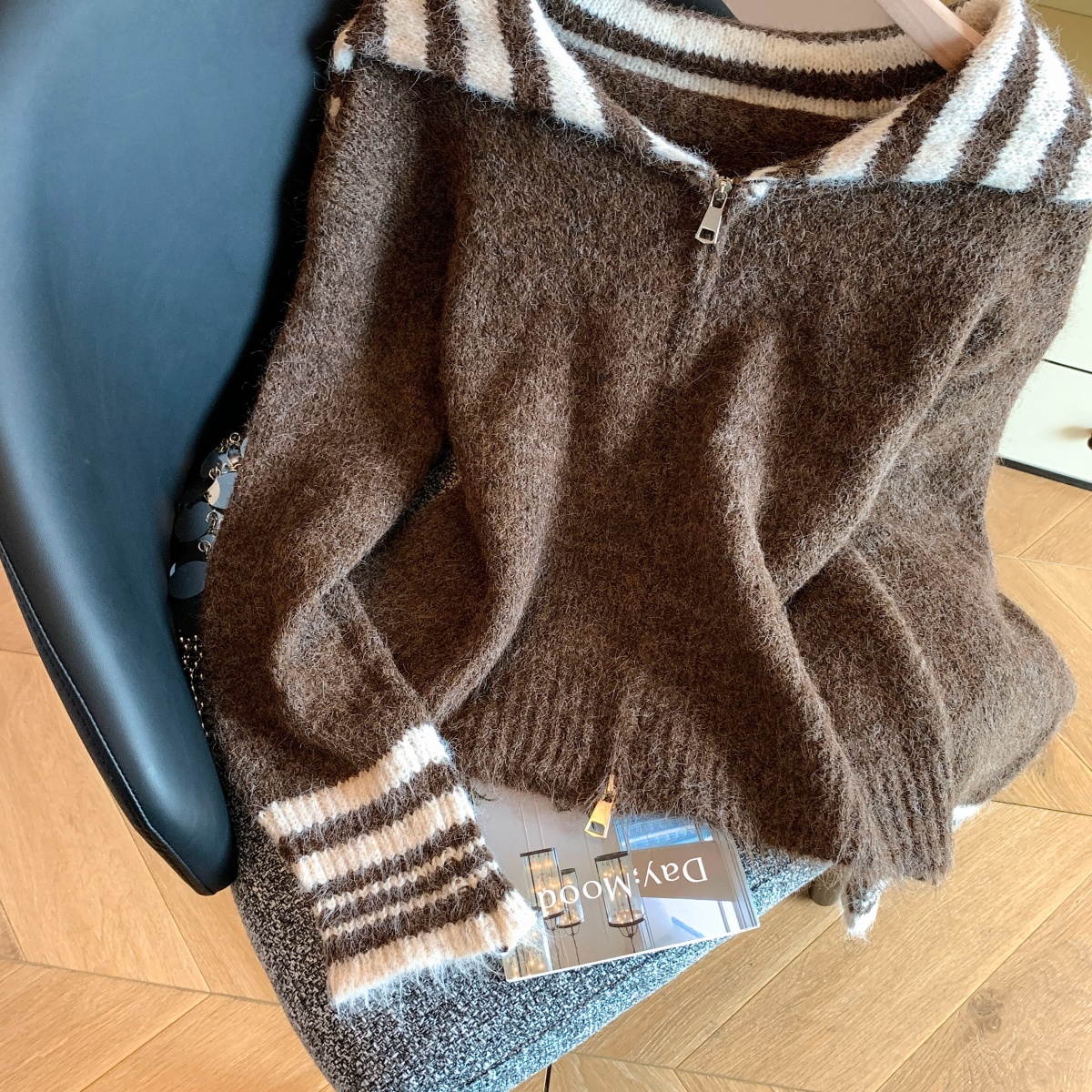 实拍海军领条纹拉链针织开衫毛衣外套女秋冬季学院风开衫宽松上衣