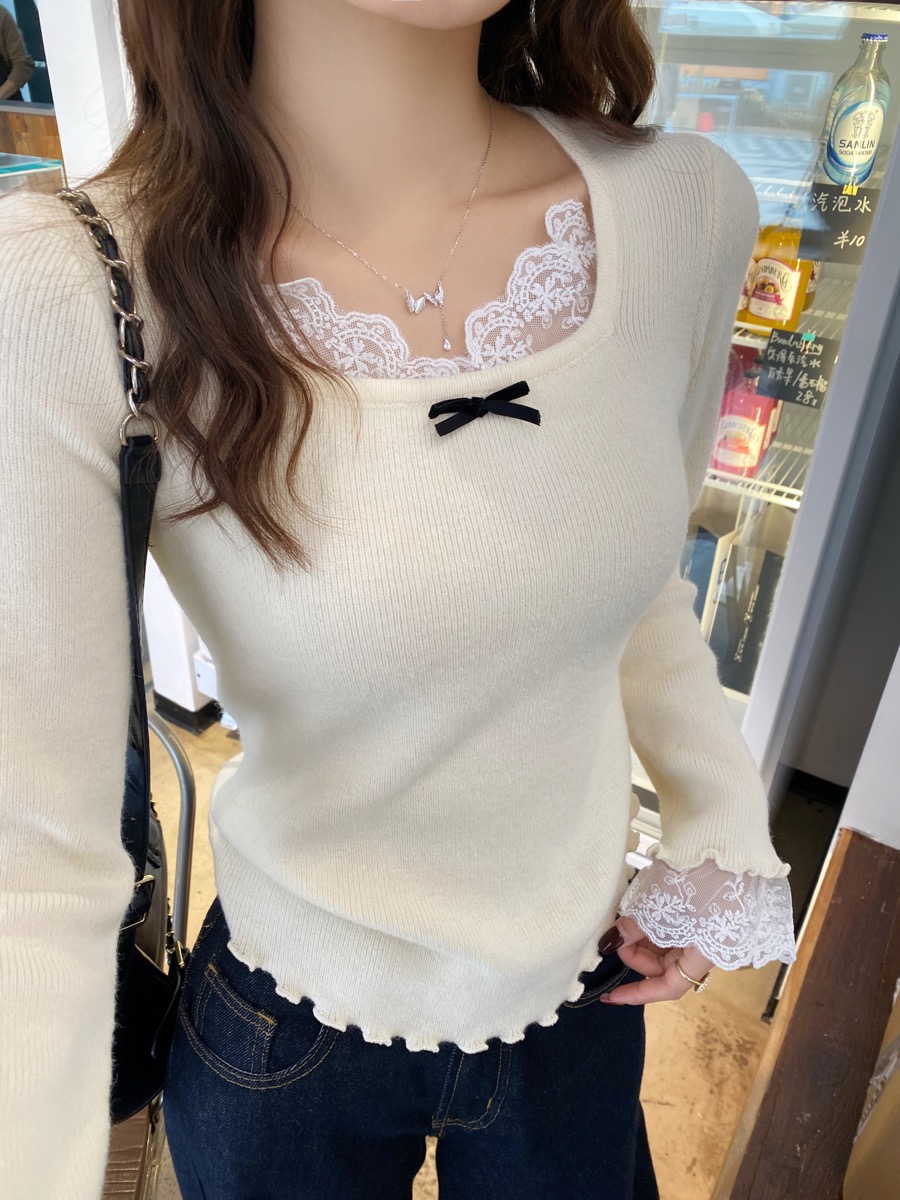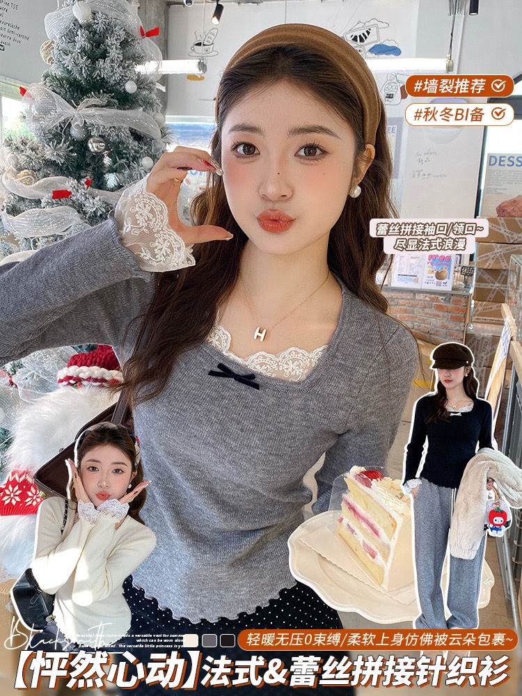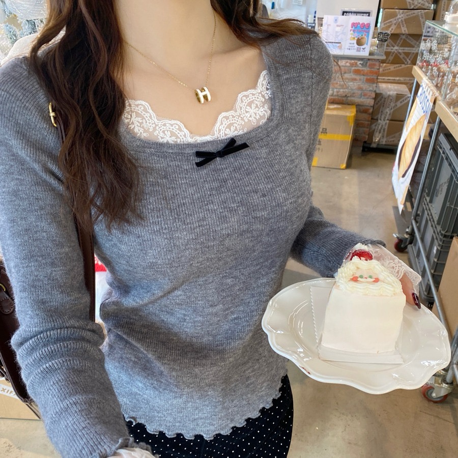 灰色蕾丝方领针织打底衫女2025秋冬新款设计感毛衣内搭修身上衣