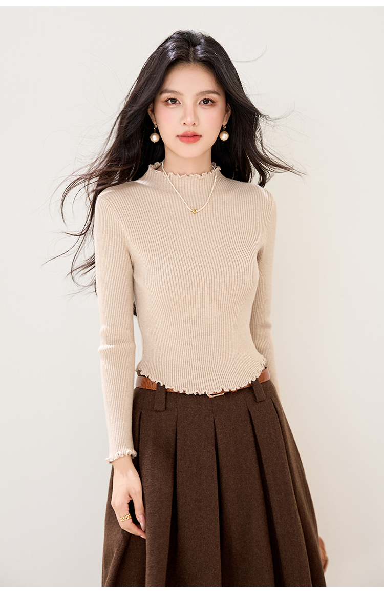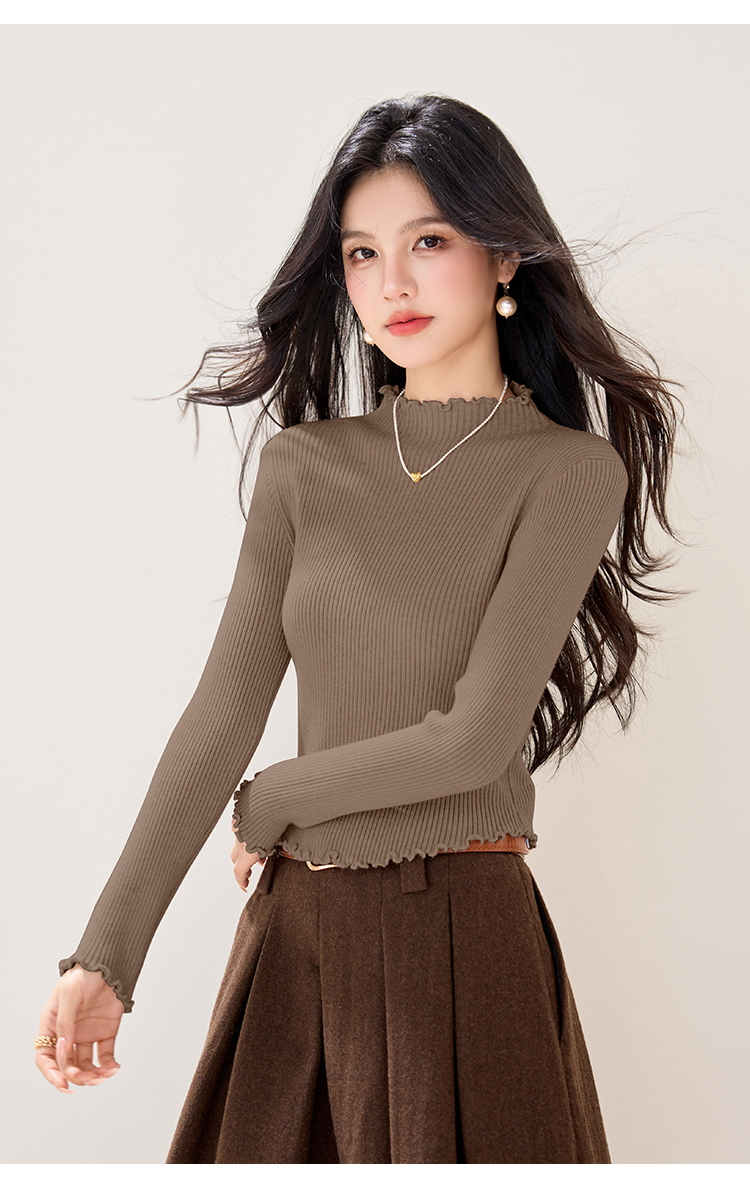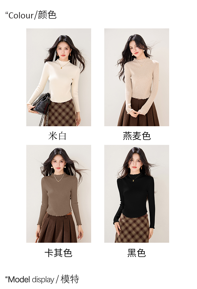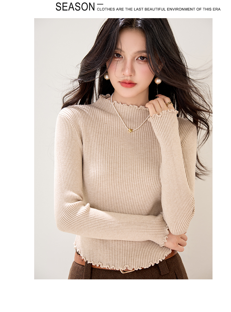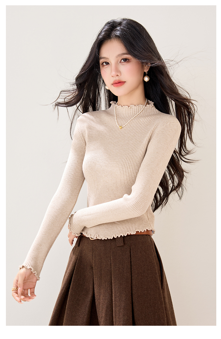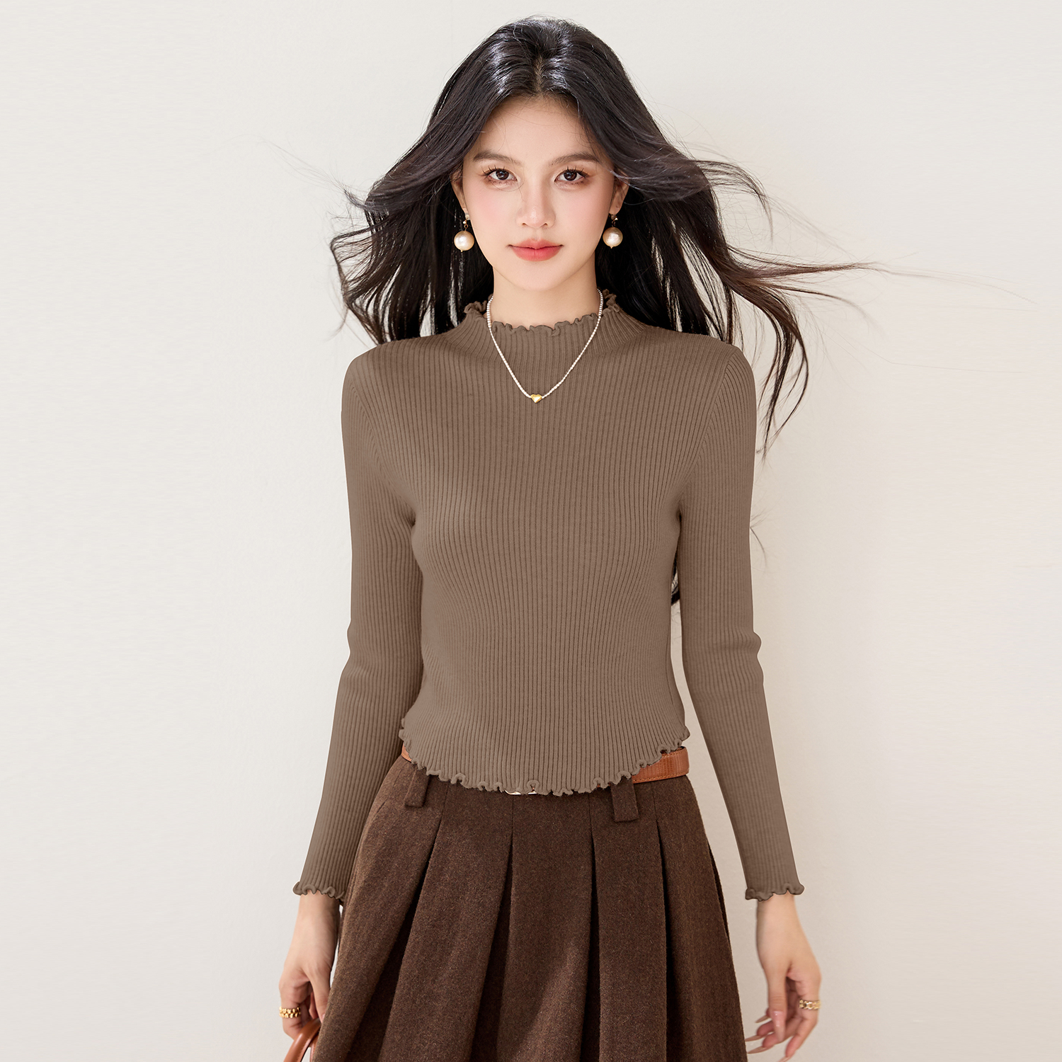 实拍秋冬新款打底衫女长袖套头木耳边半高领修身短款韩版针织毛衣