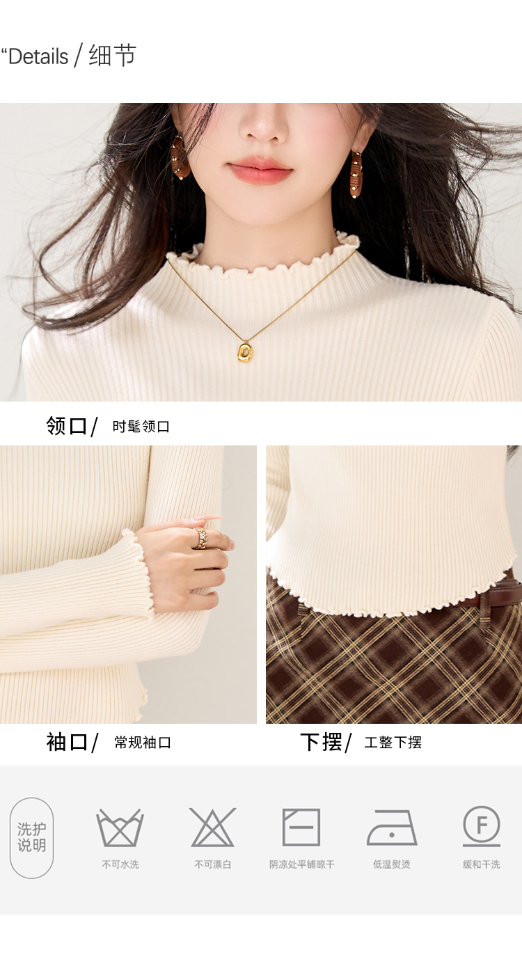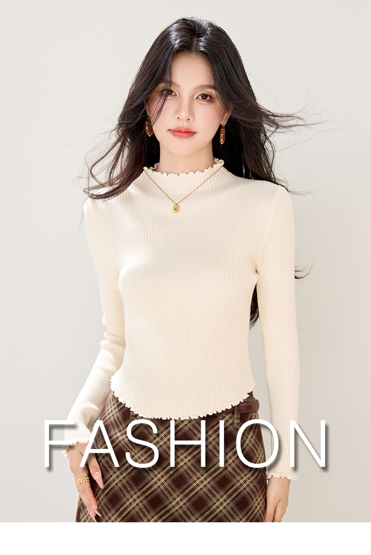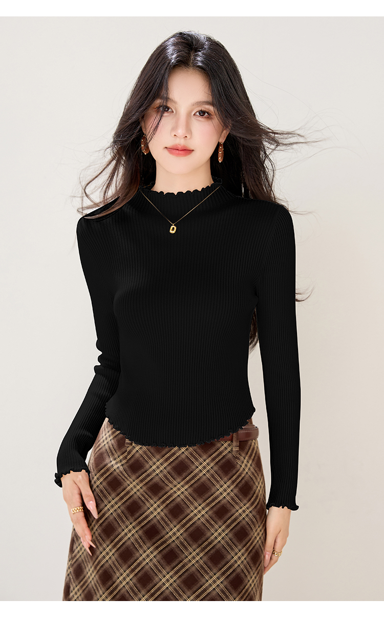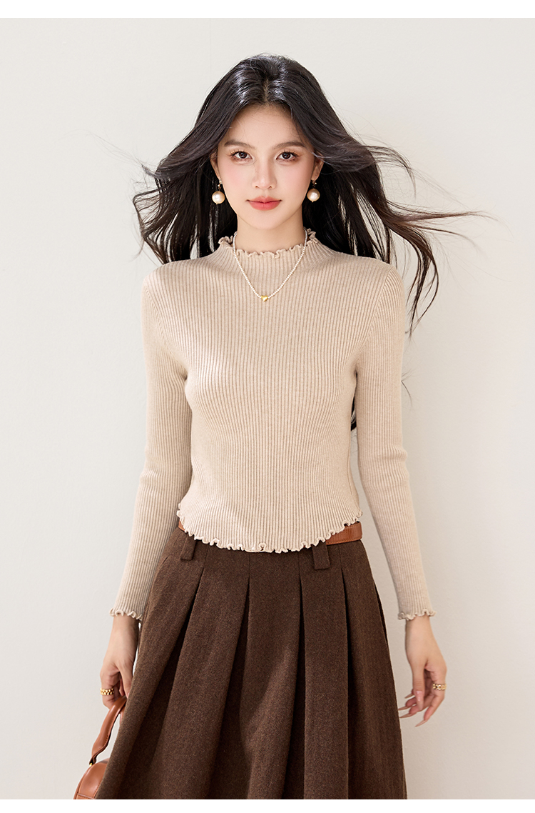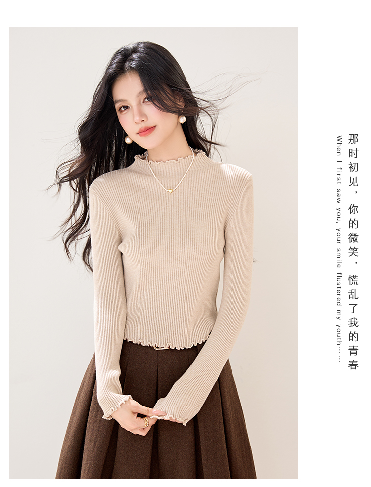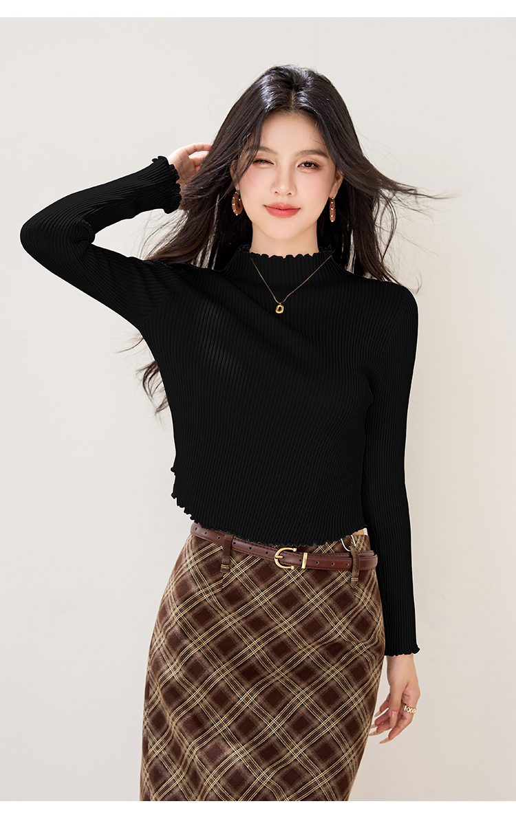 实拍秋冬新款打底衫女长袖套头木耳边半高领修身短款韩版针织毛衣