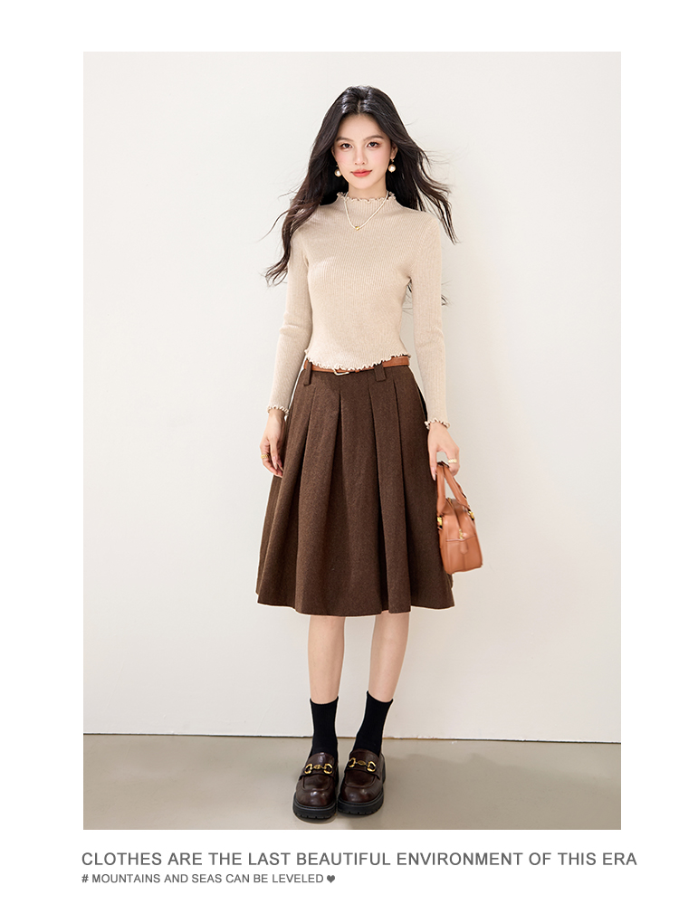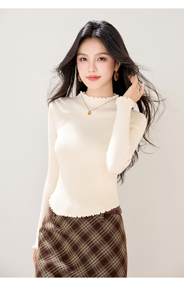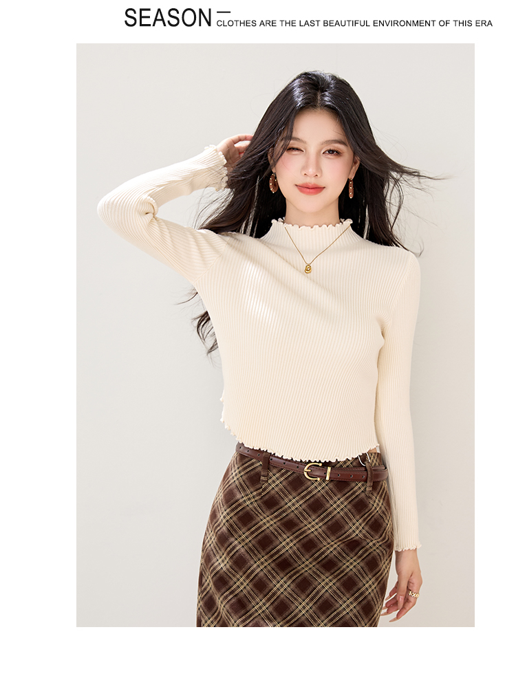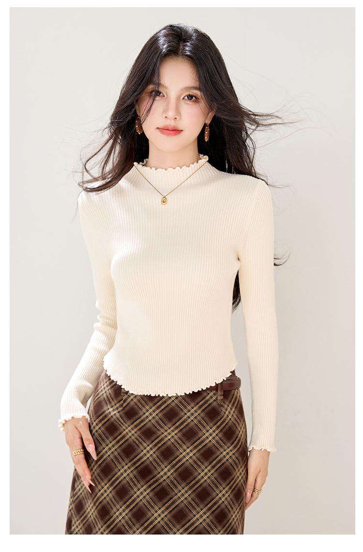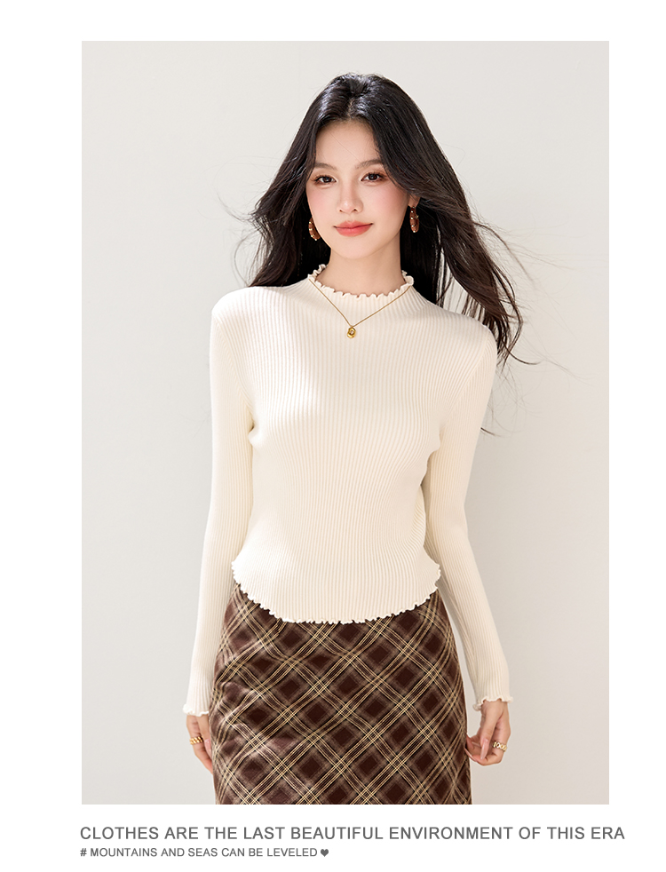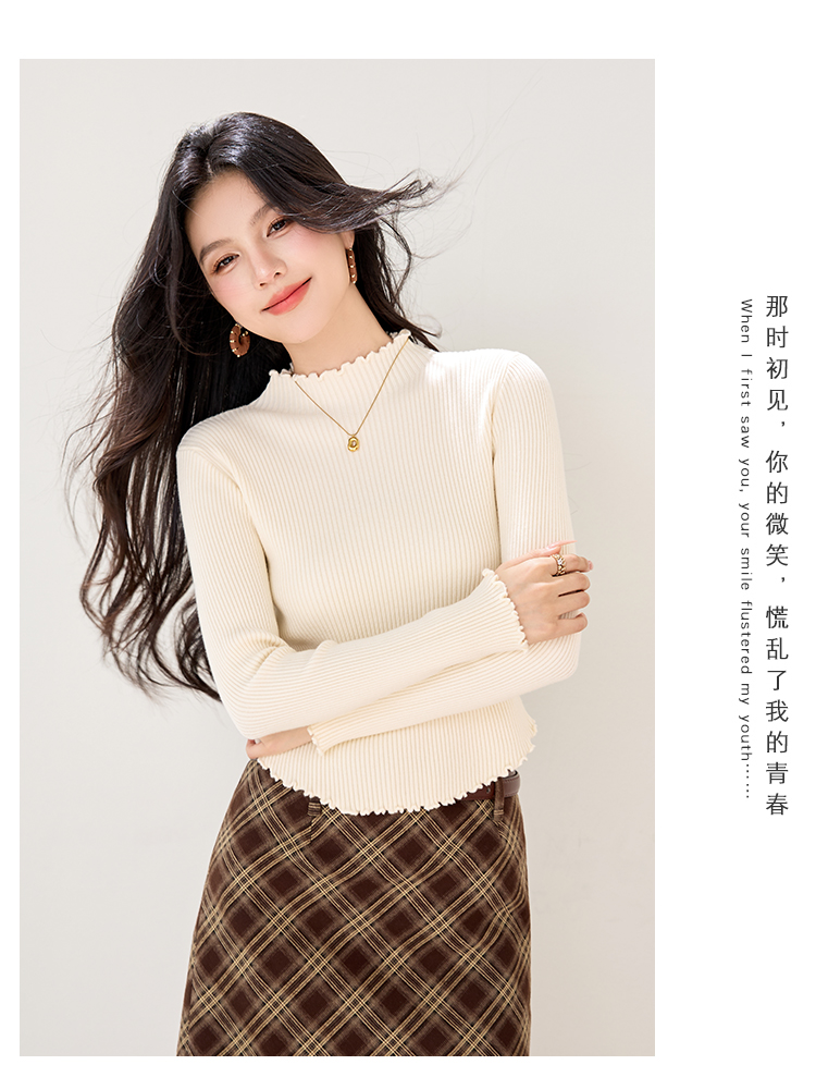 实拍秋冬新款打底衫女长袖套头木耳边半高领修身短款韩版针织毛衣
