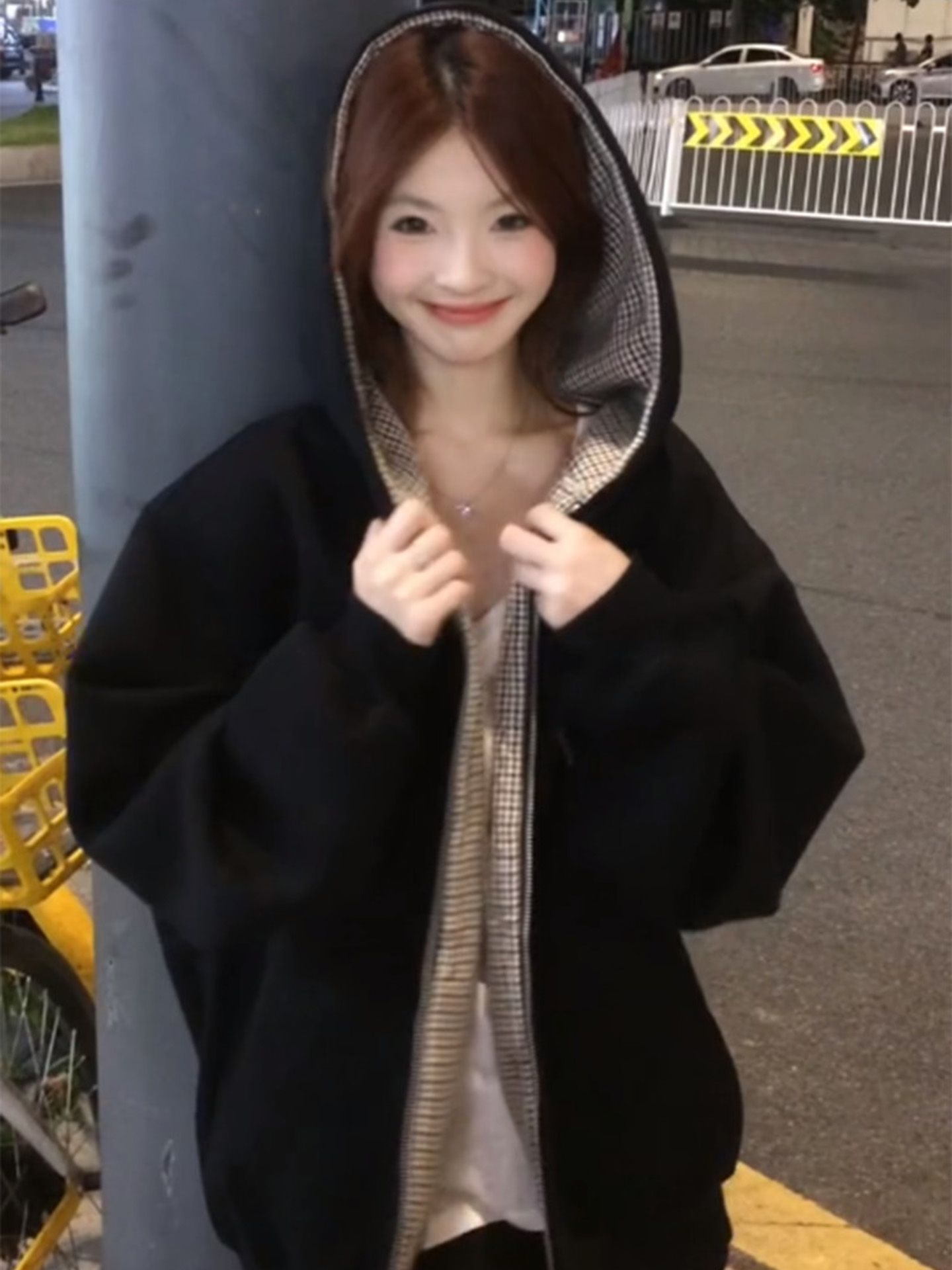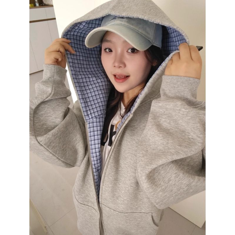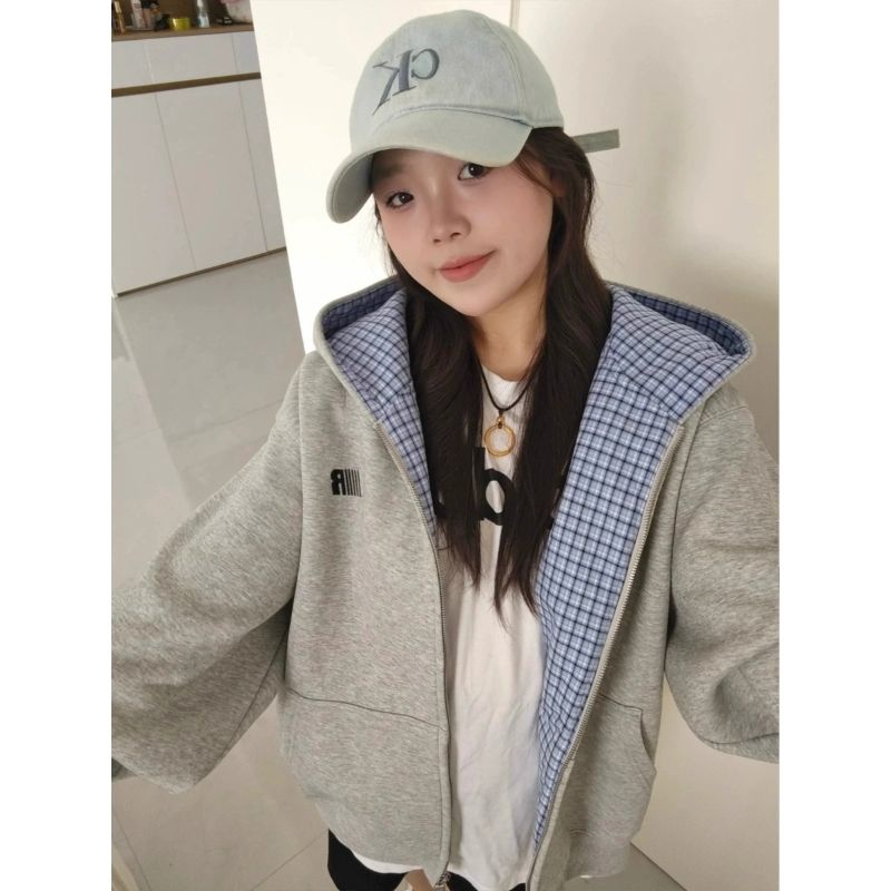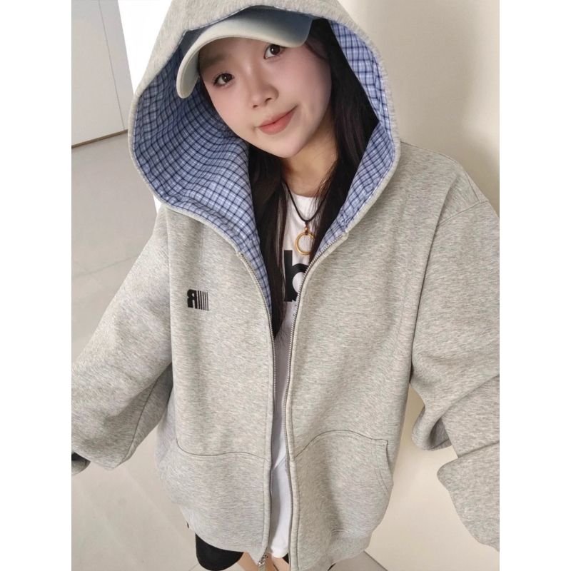 刺绣+纯棉华棉复合牛奶丝特大码300斤格纹连帽卫衣女