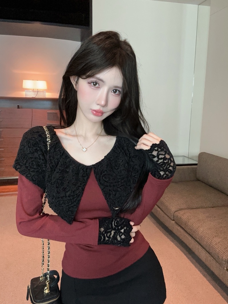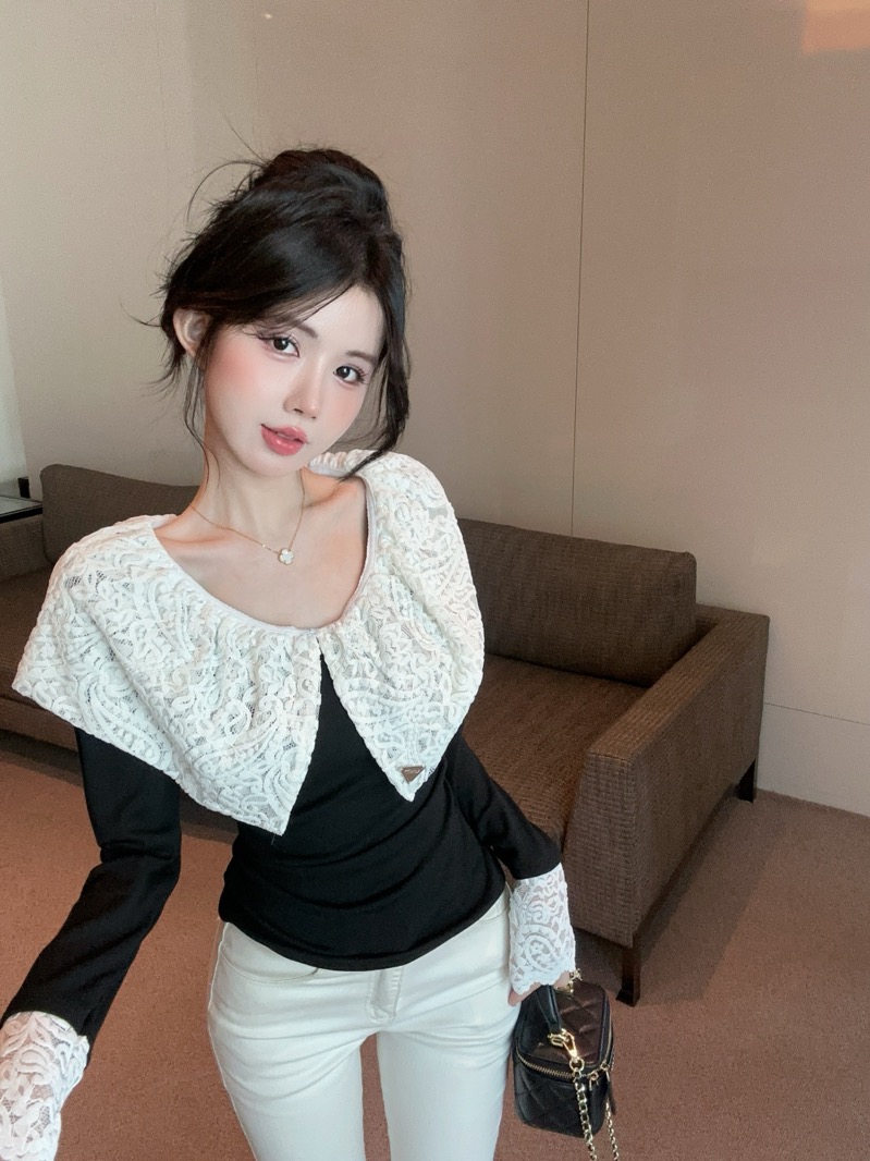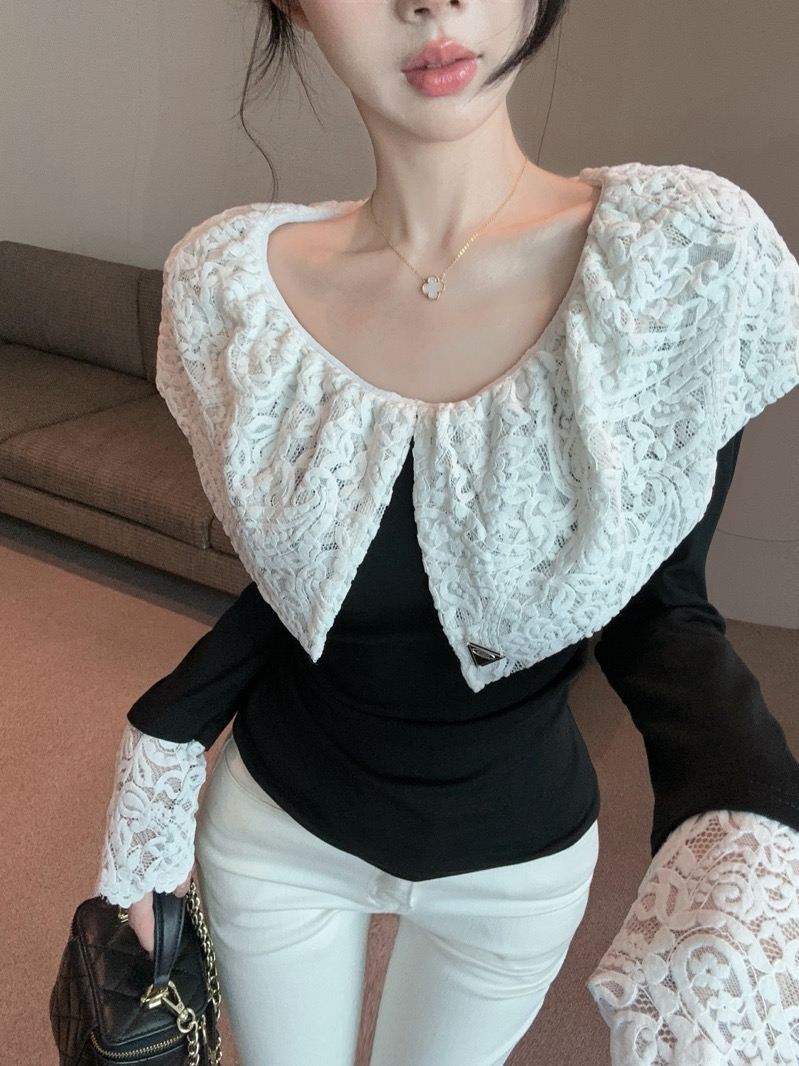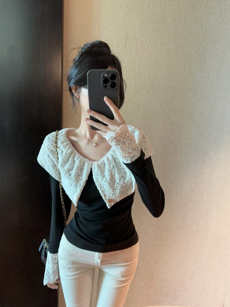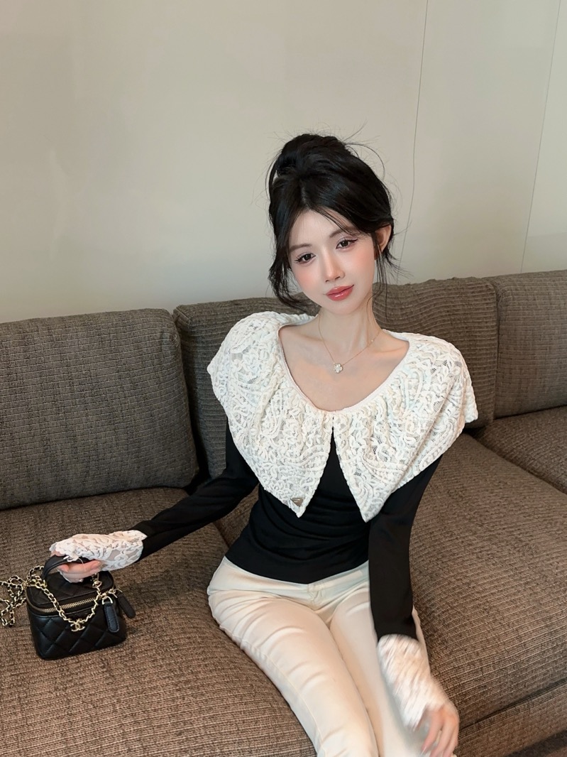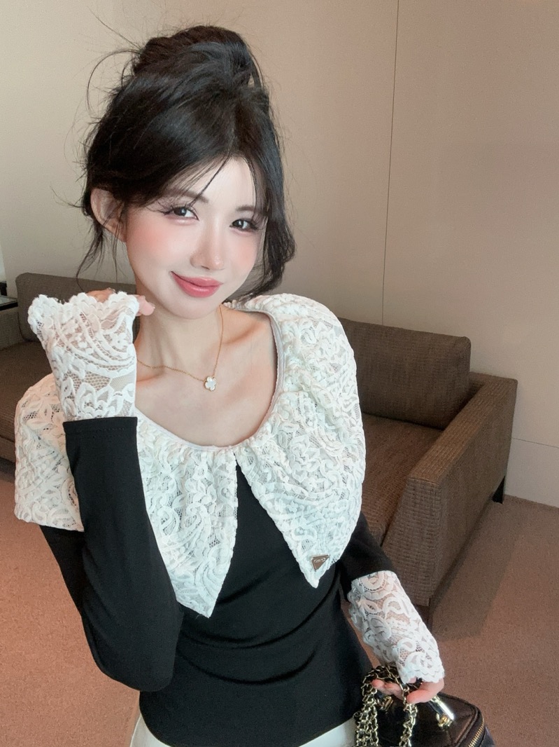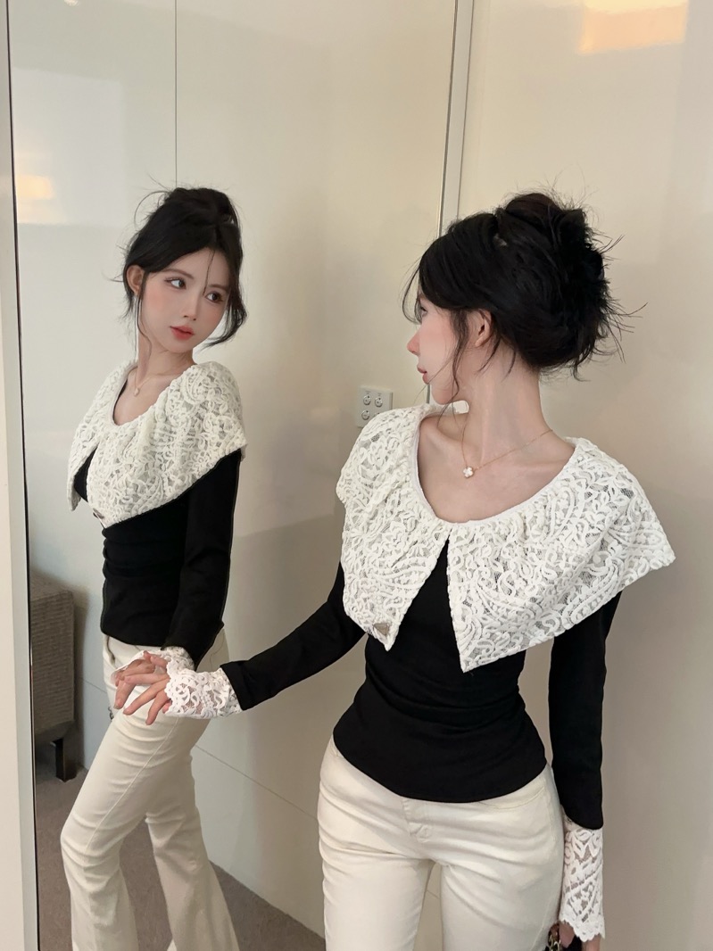 实拍 设计感小众荷叶边领假两件撞色蕾丝拼接长袖T恤女打底衫上衣