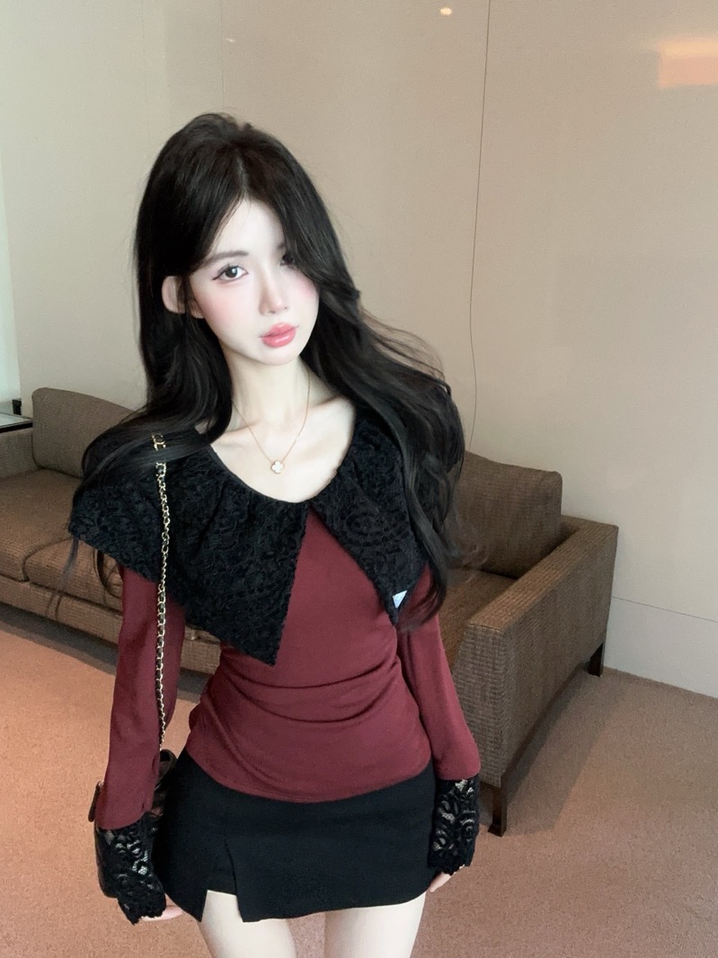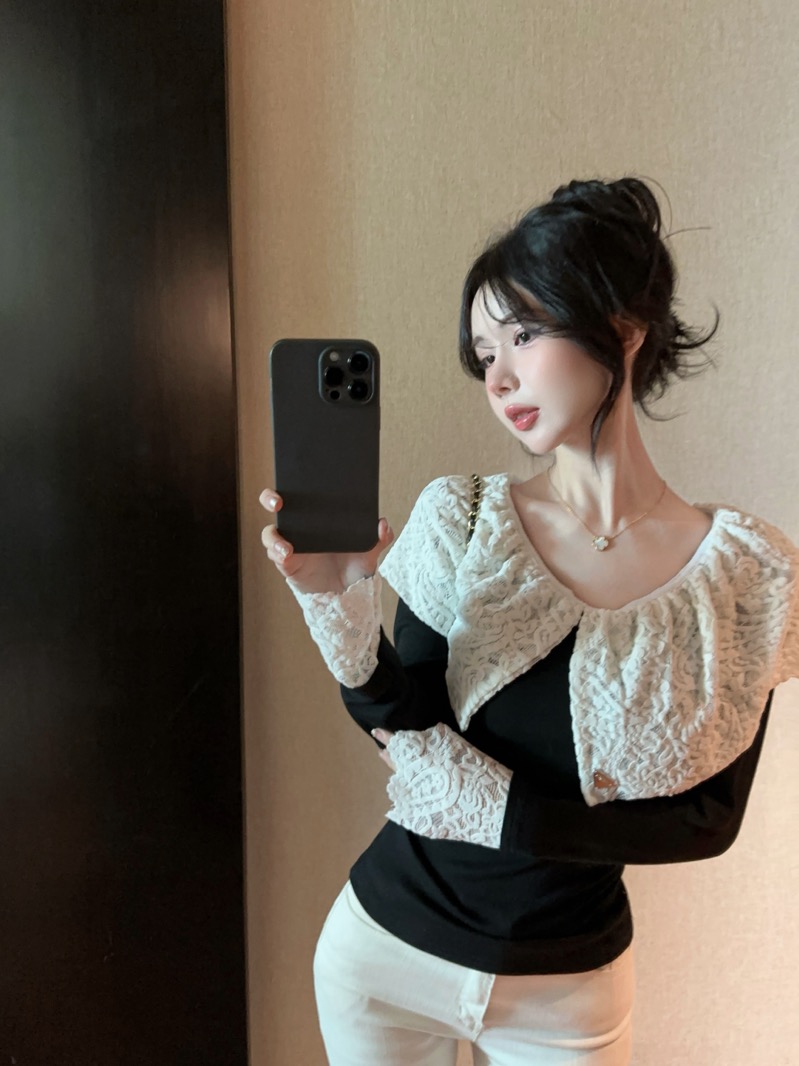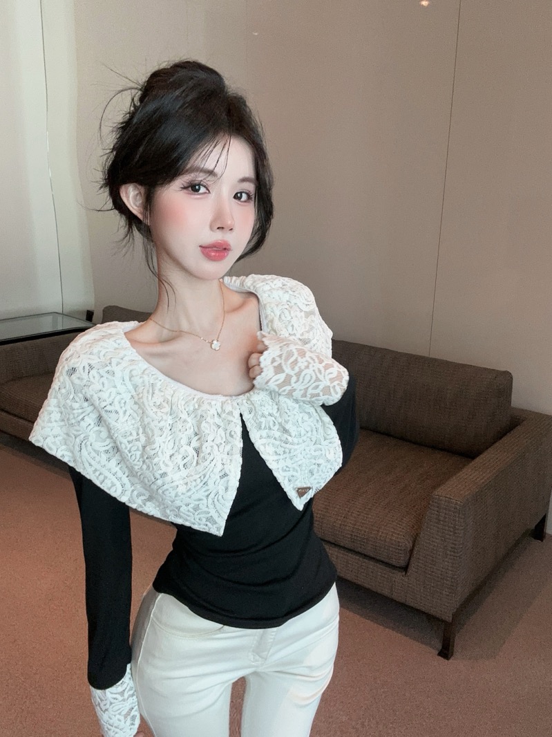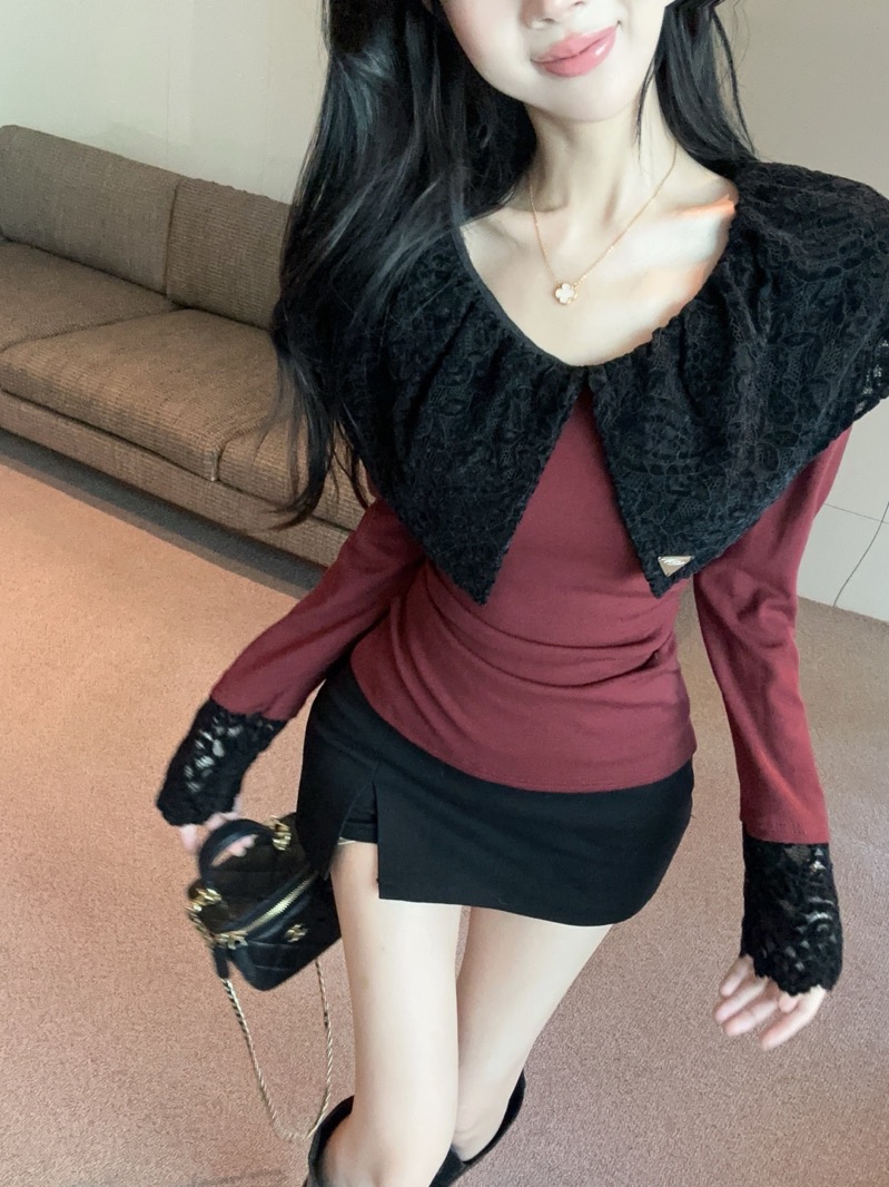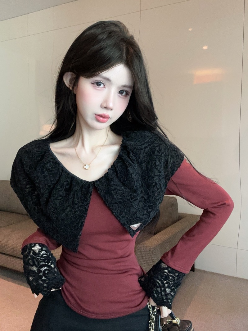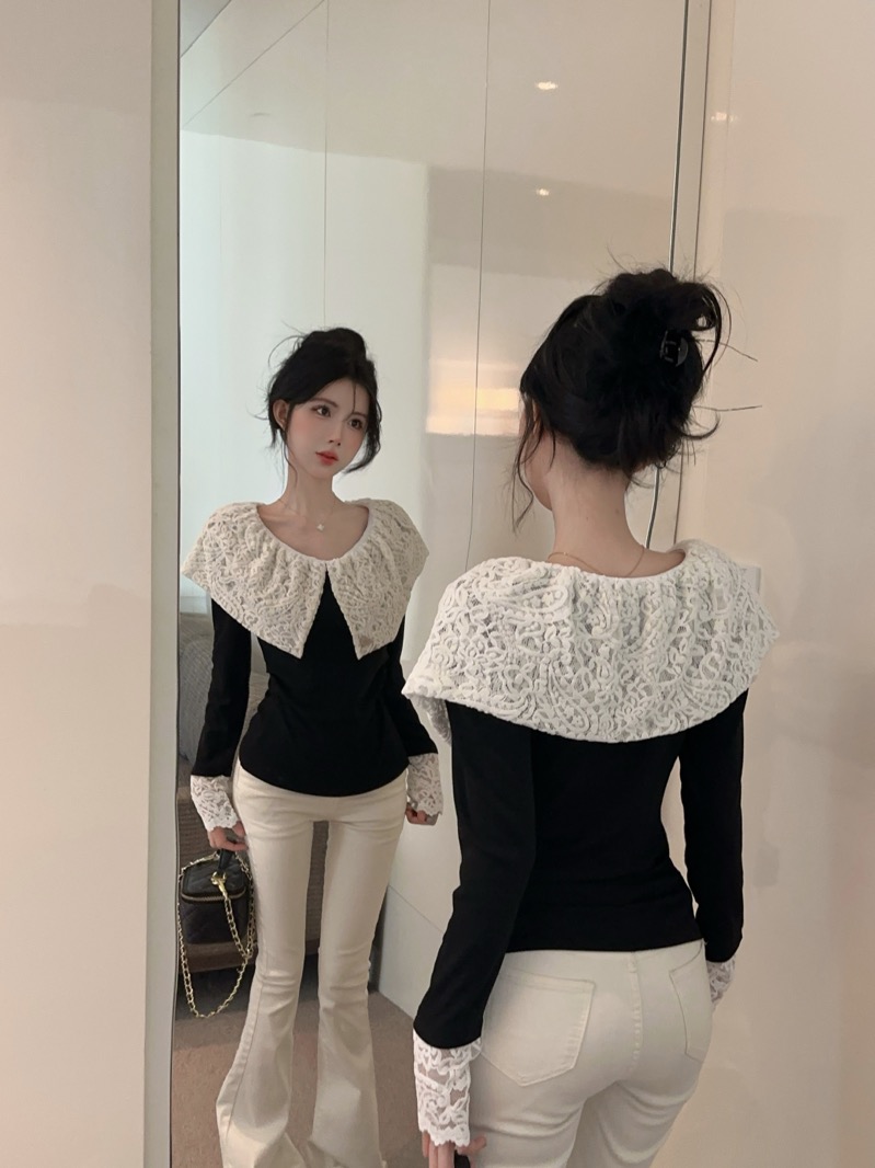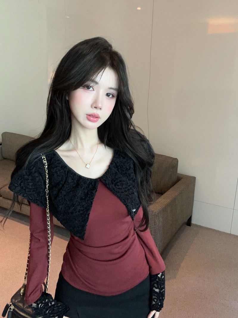 实拍 设计感小众荷叶边领假两件撞色蕾丝拼接长袖T恤女打底衫上衣