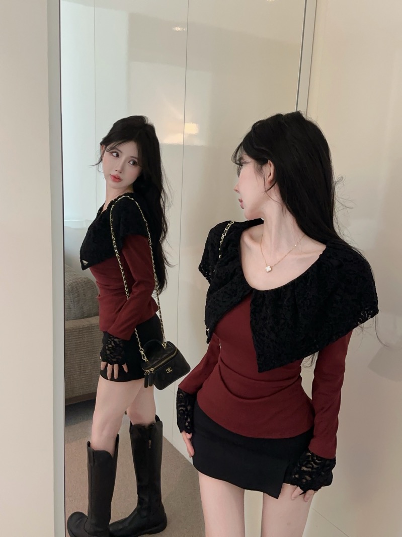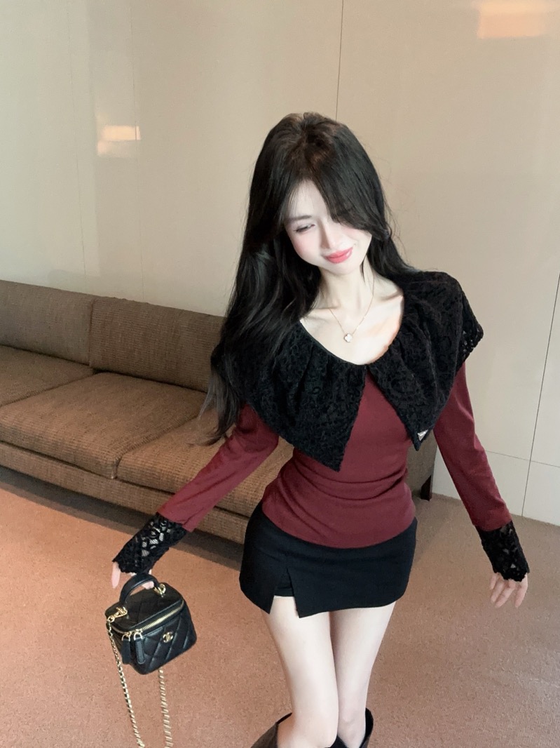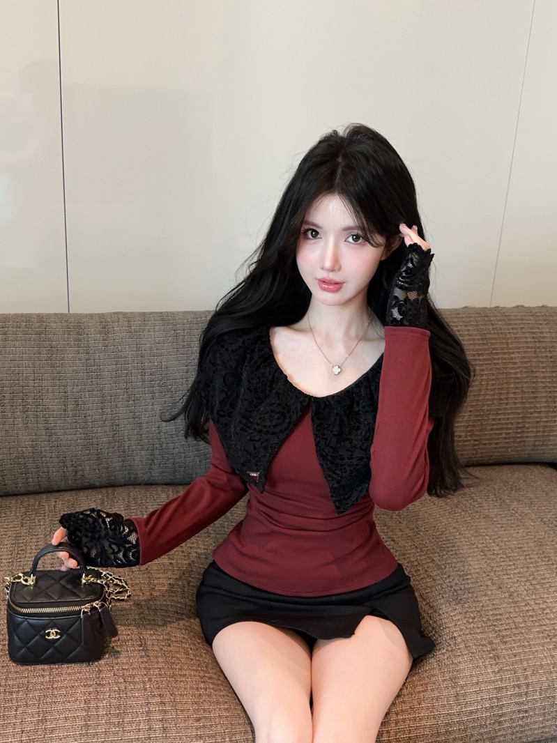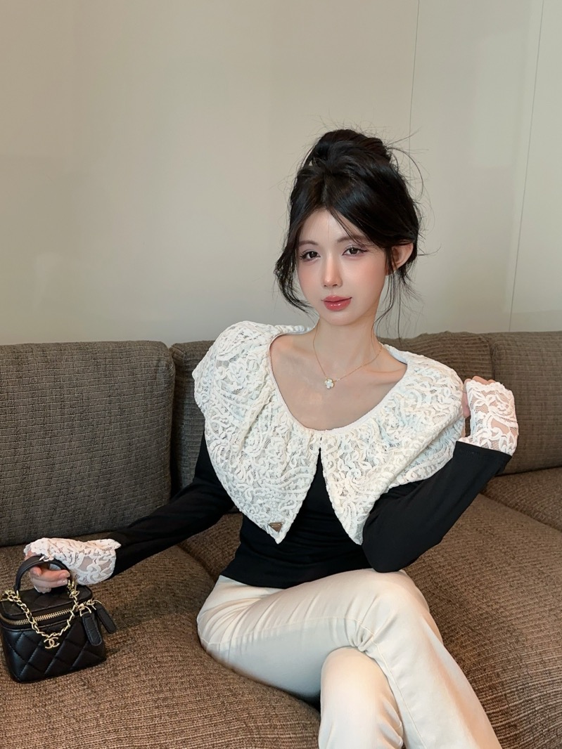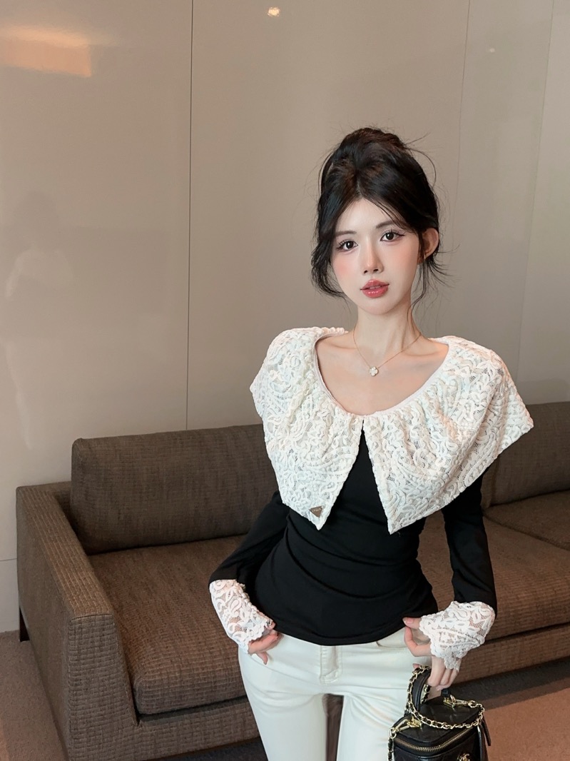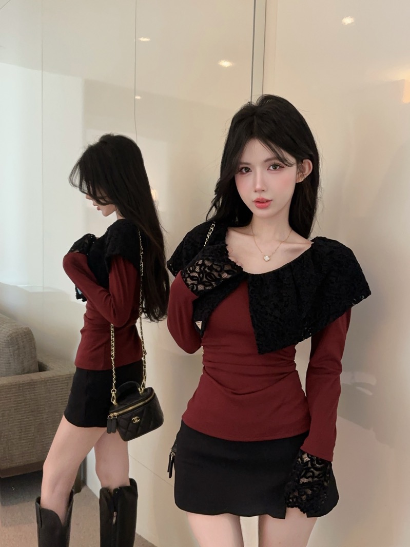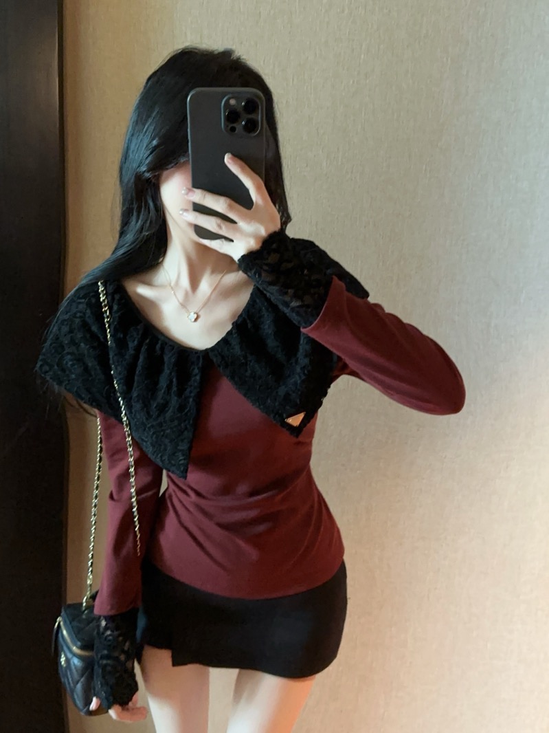 实拍 设计感小众荷叶边领假两件撞色蕾丝拼接长袖T恤女打底衫上衣