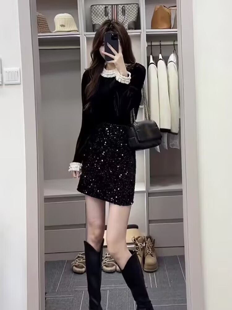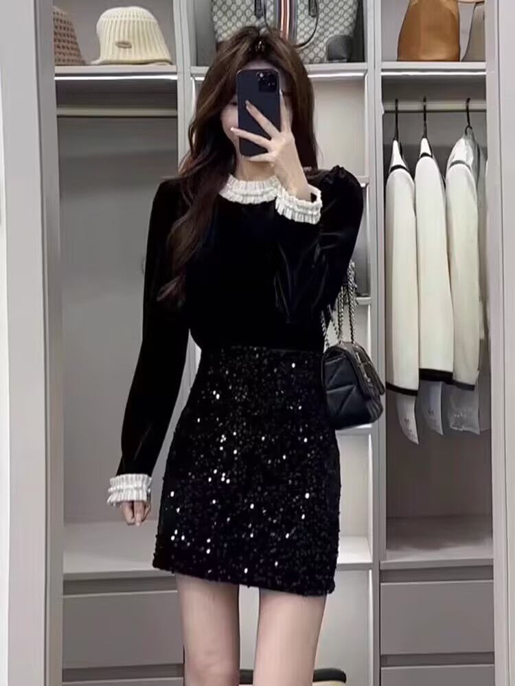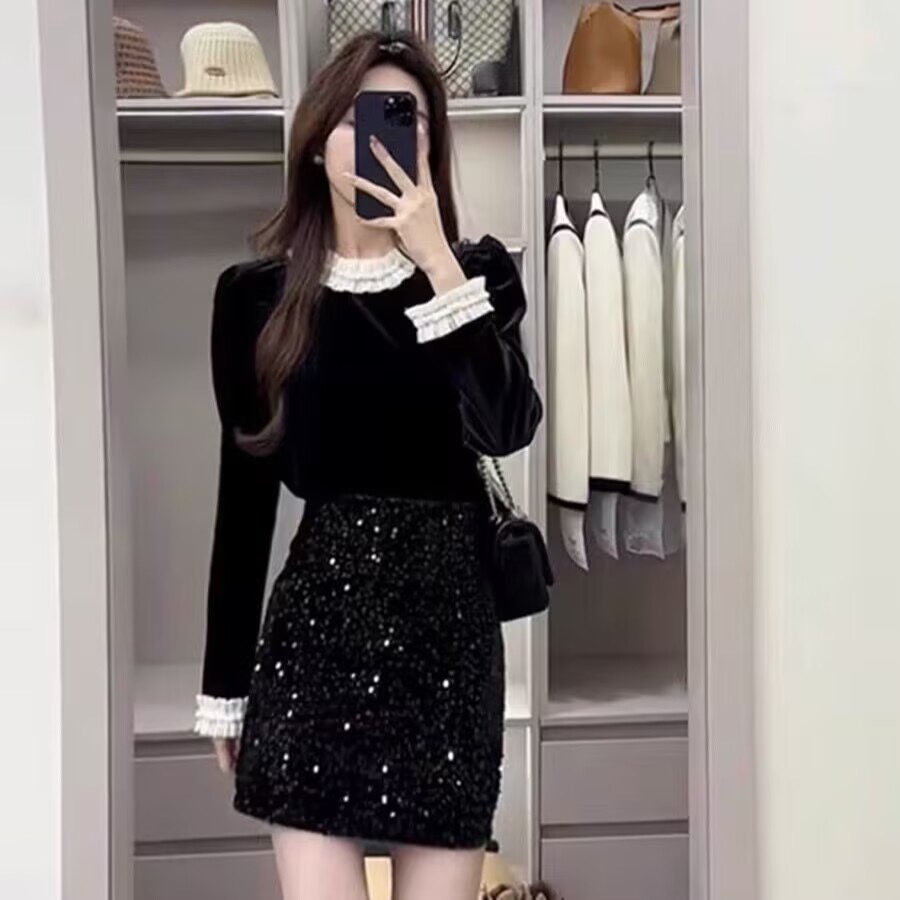 今年流行漂亮套装裙女春季丝绒上衣半身裙两件套小香风搭配一整套