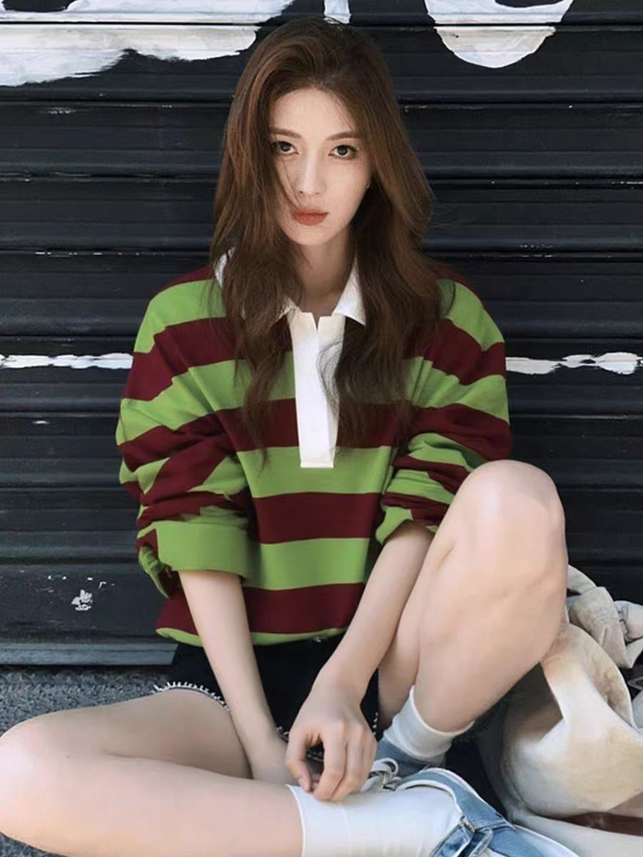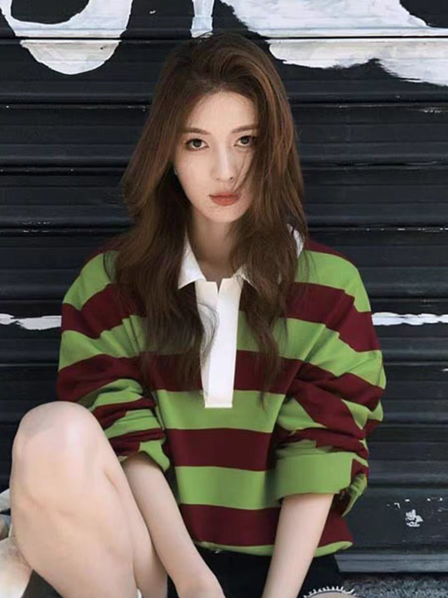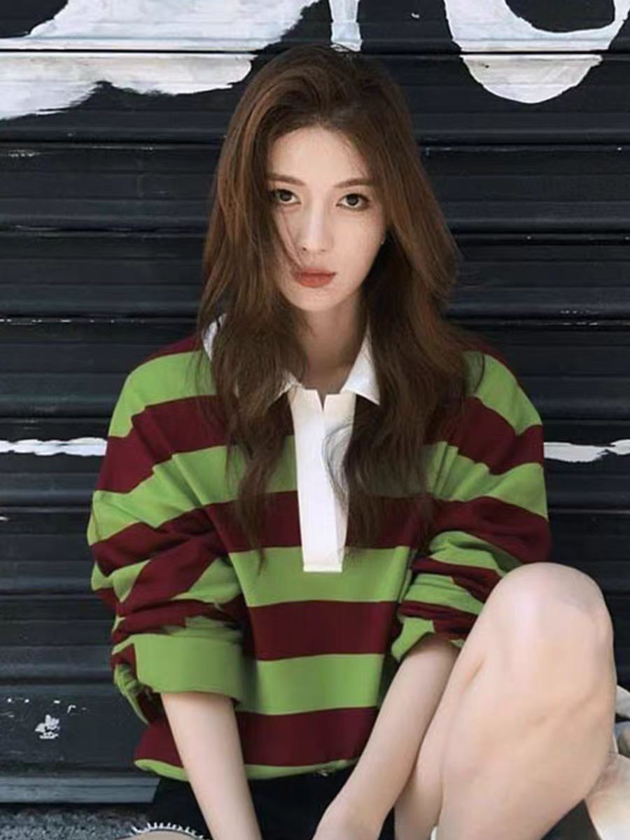 秋季巨好看高级设计感上衣韩系慵懒松弛感多巴胺绿色条纹长袖T恤