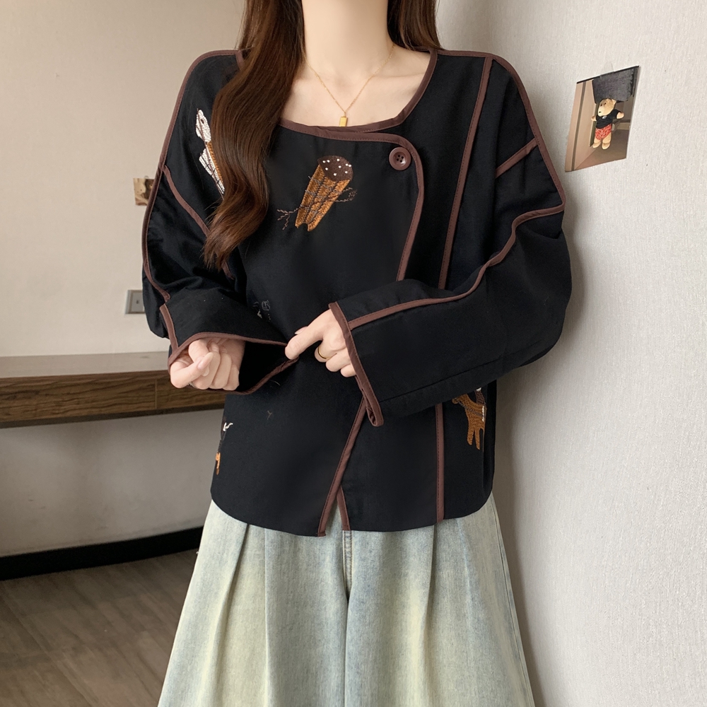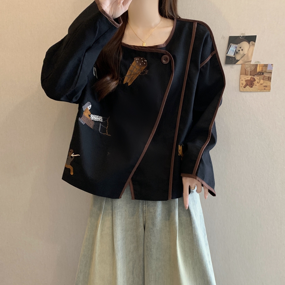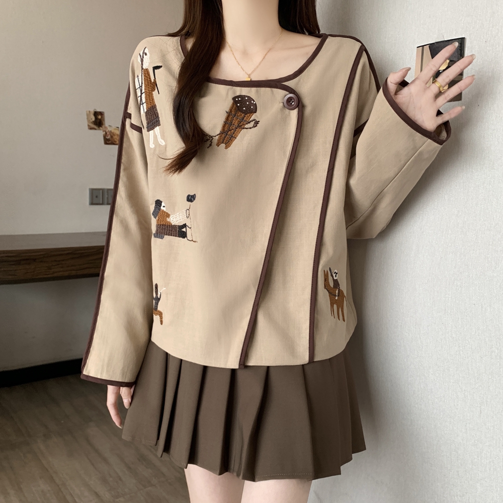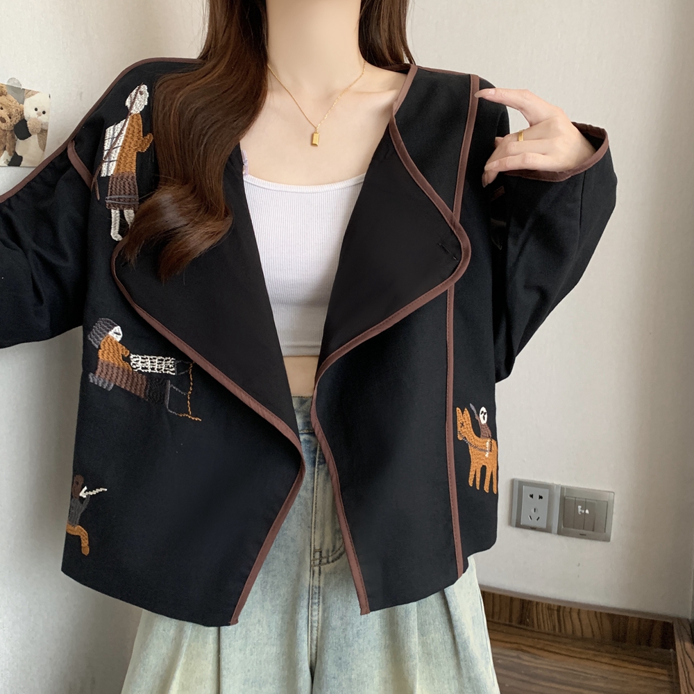 实拍秋装新款高端亚麻重工刺绣圆领短款外套宽松休闲夹克上衣