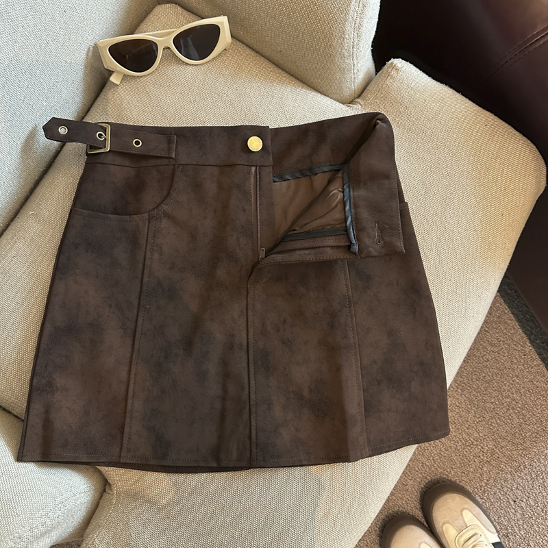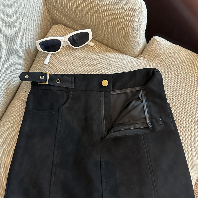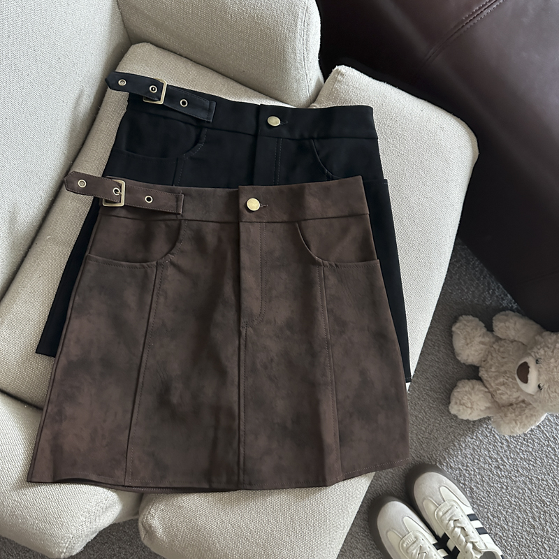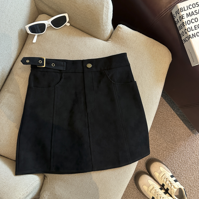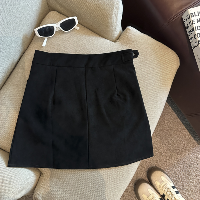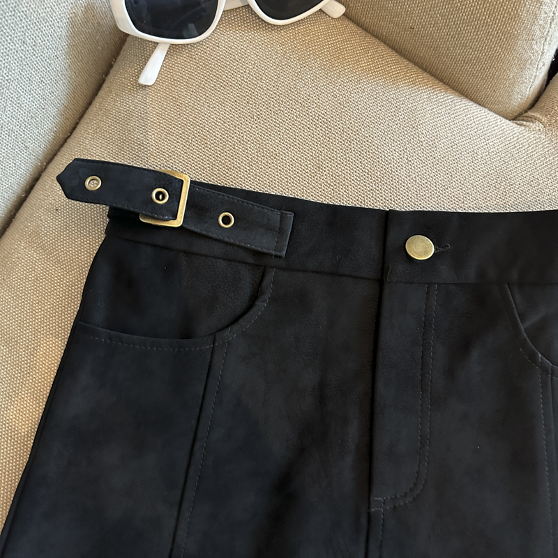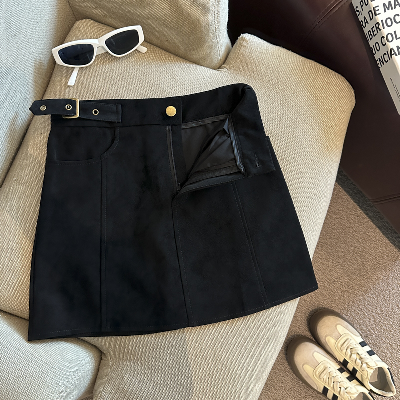 实拍 秋冬新款皮绒材质高腰半身裙设计感带扣装饰短裙女