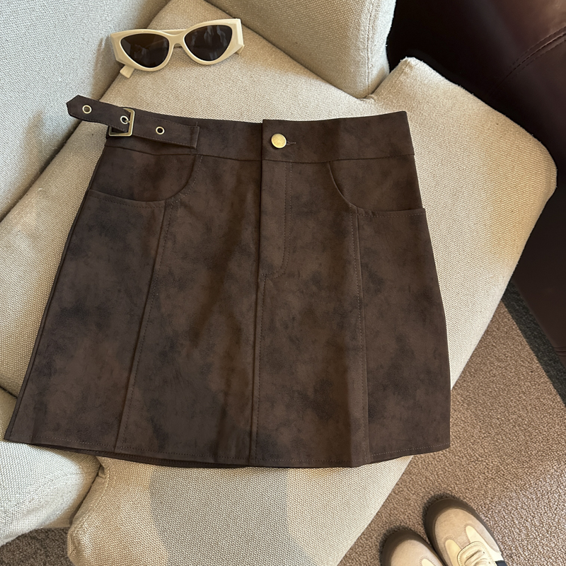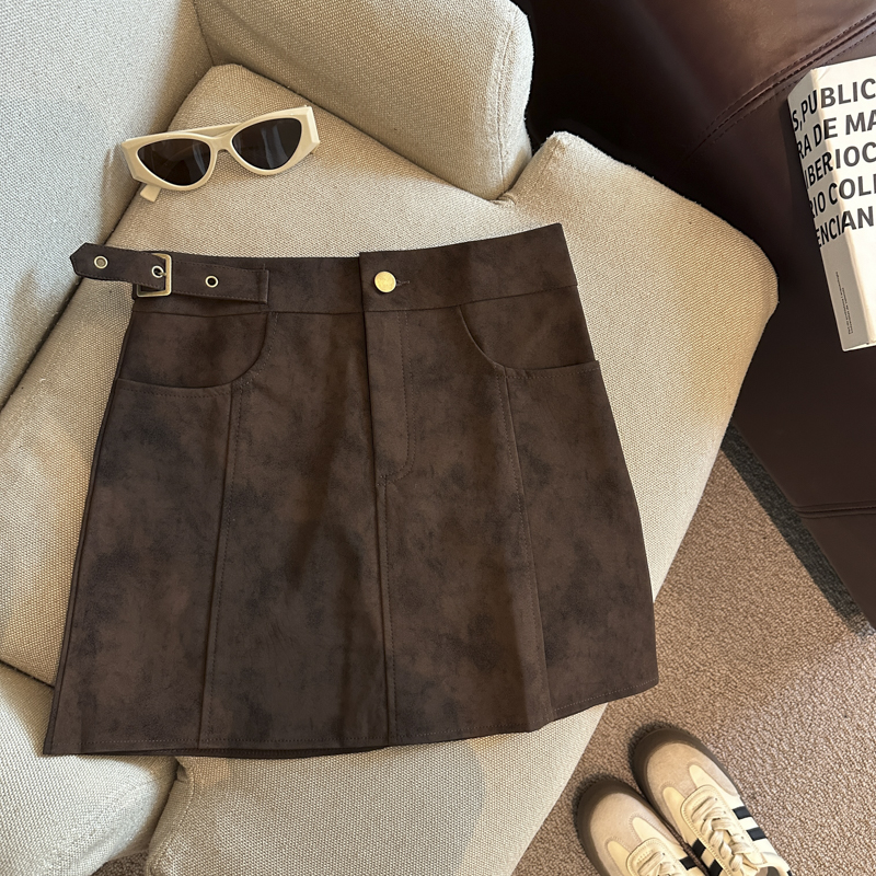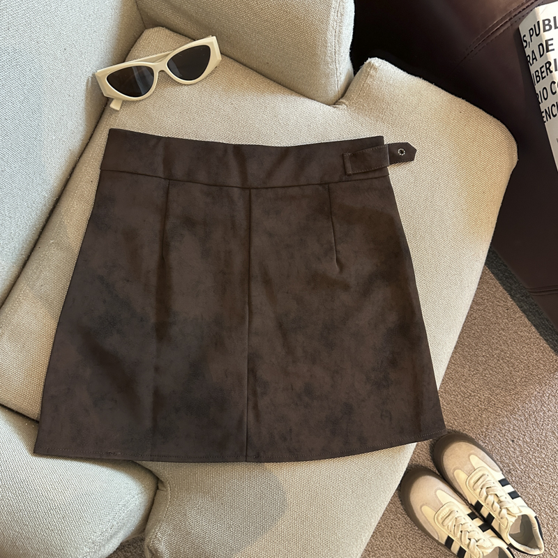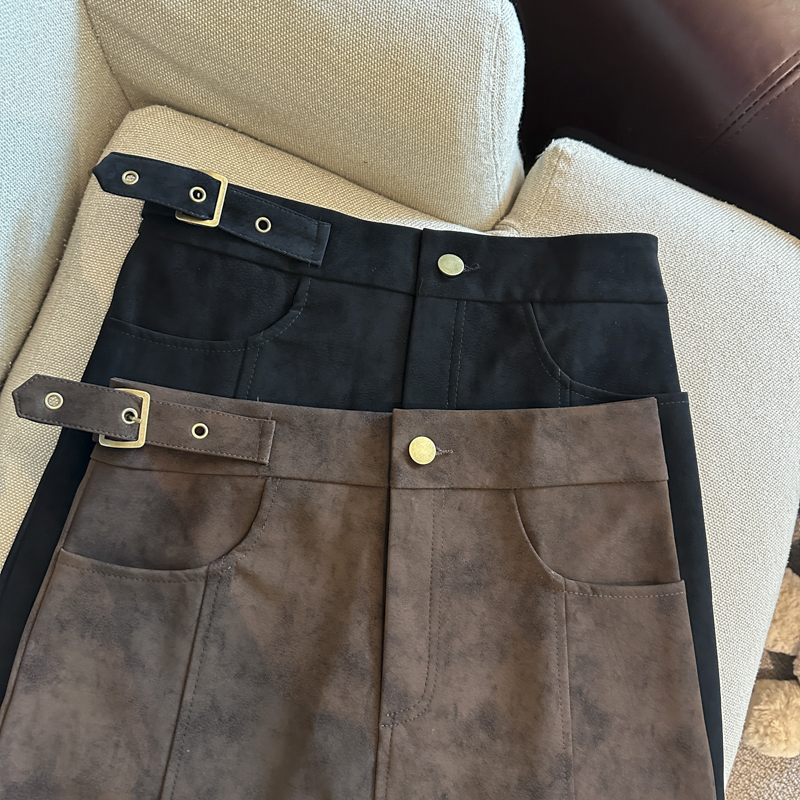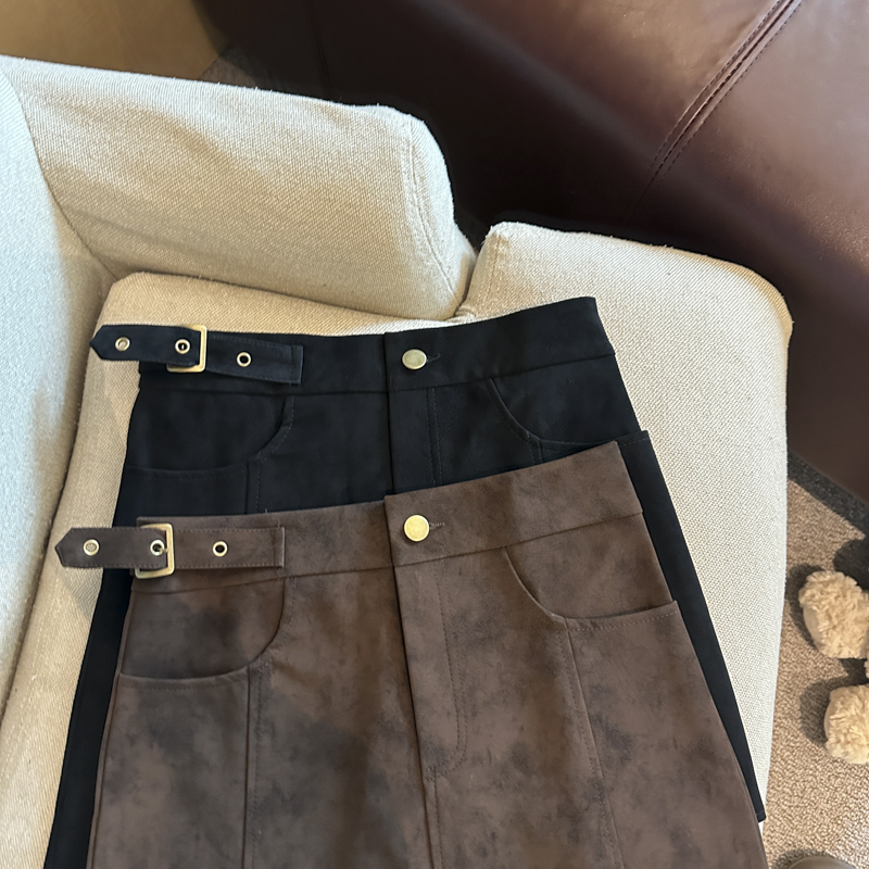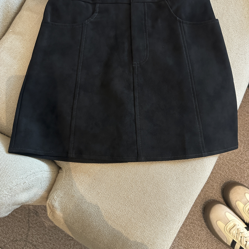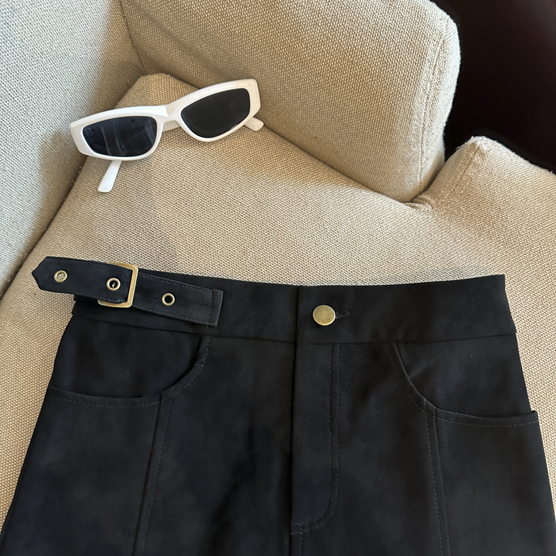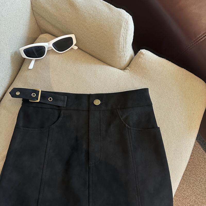 实拍 秋冬新款皮绒材质高腰半身裙设计感带扣装饰短裙女