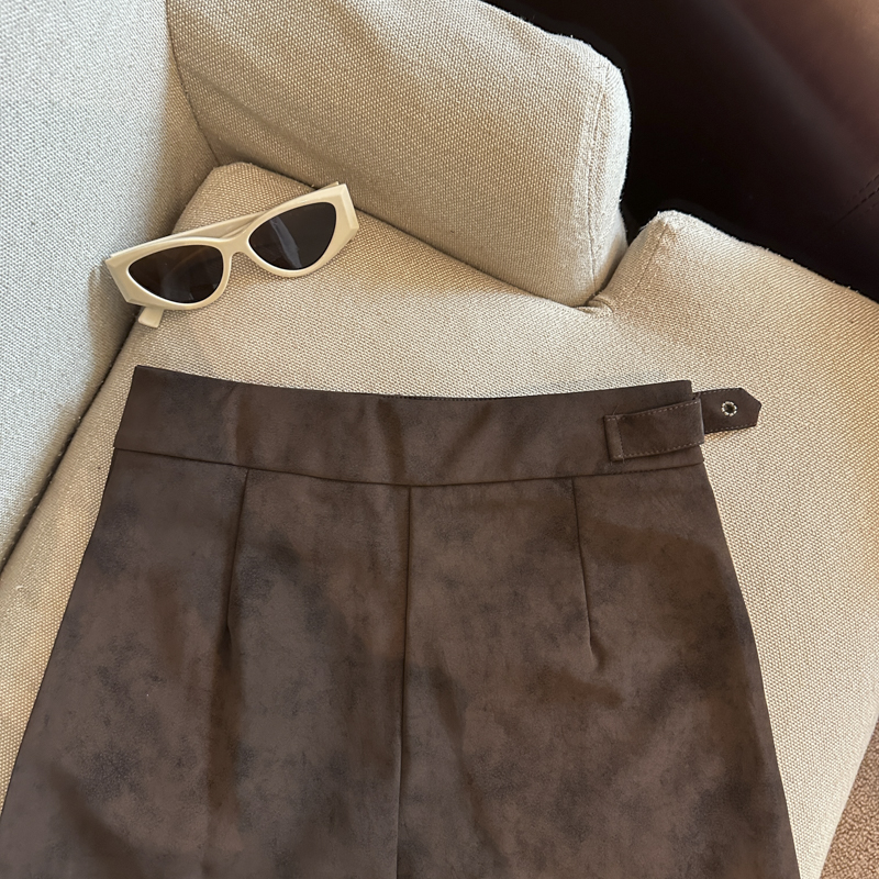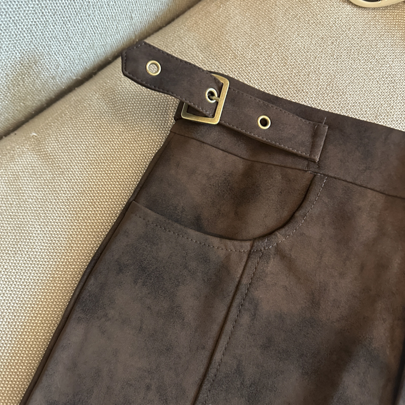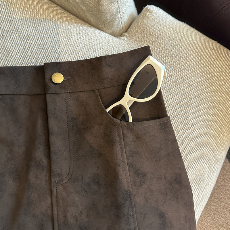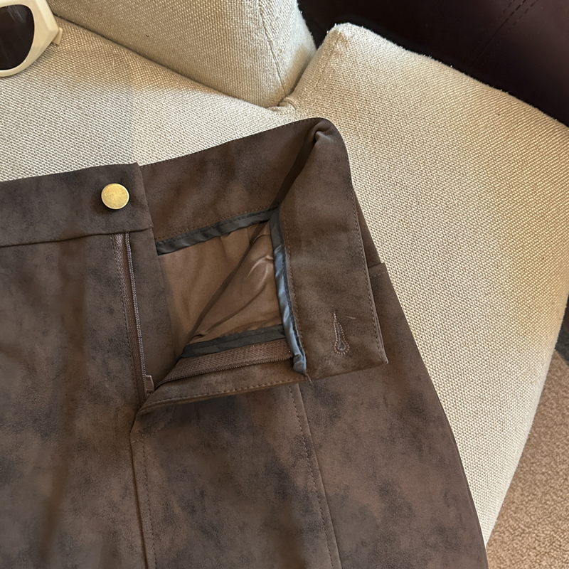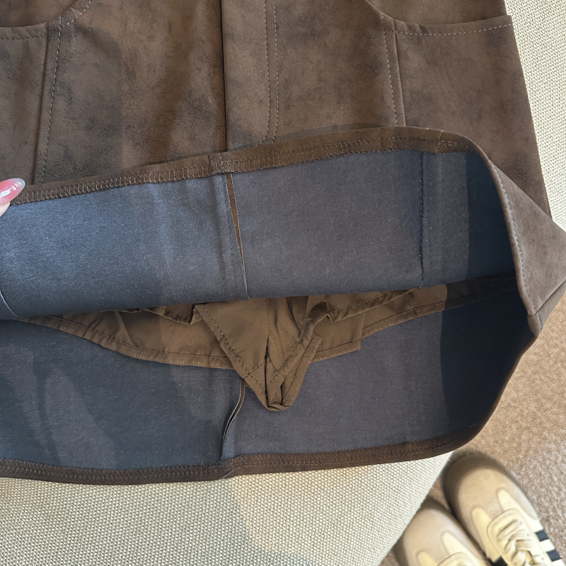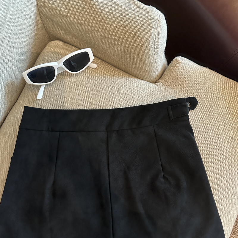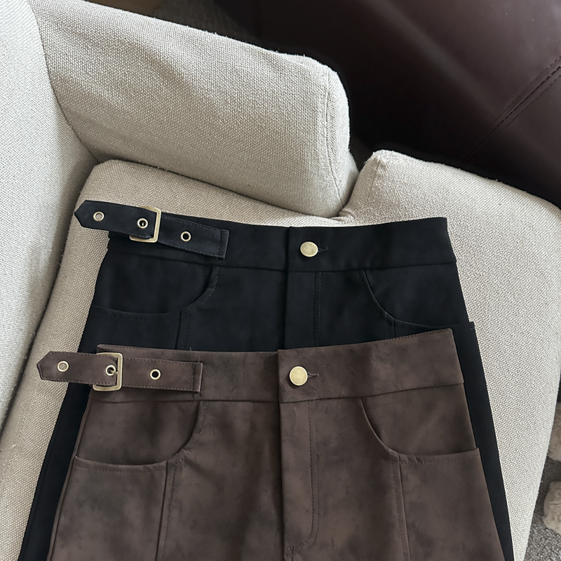 实拍 秋冬新款皮绒材质高腰半身裙设计感带扣装饰短裙女