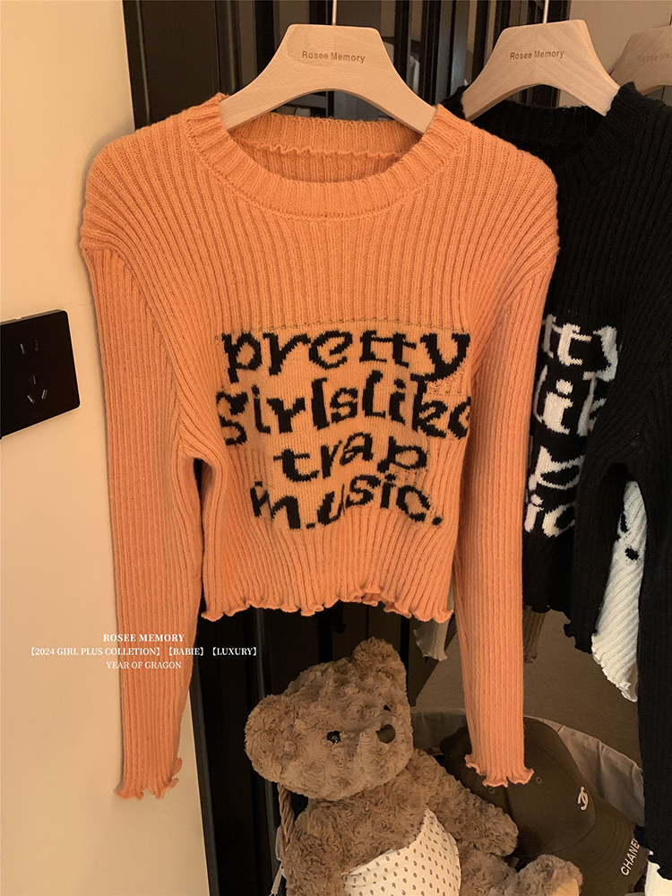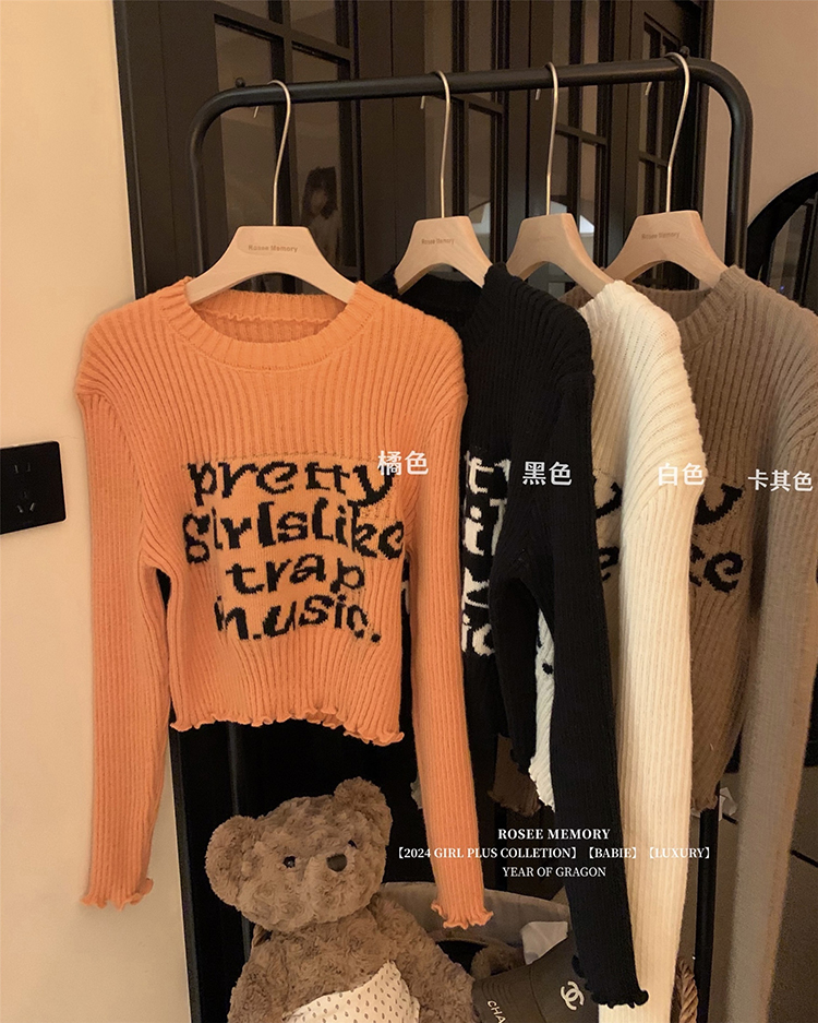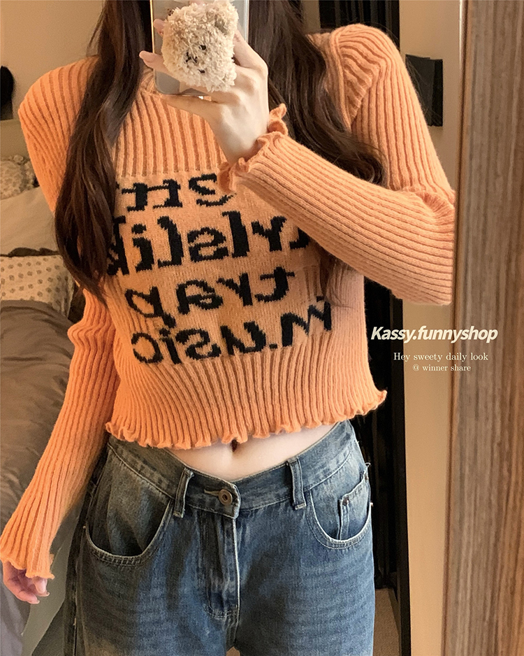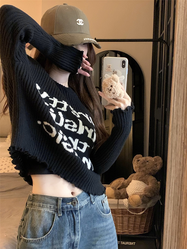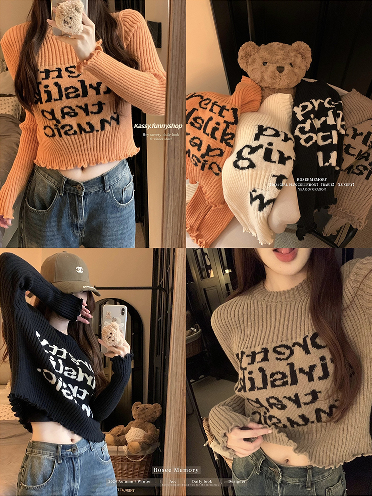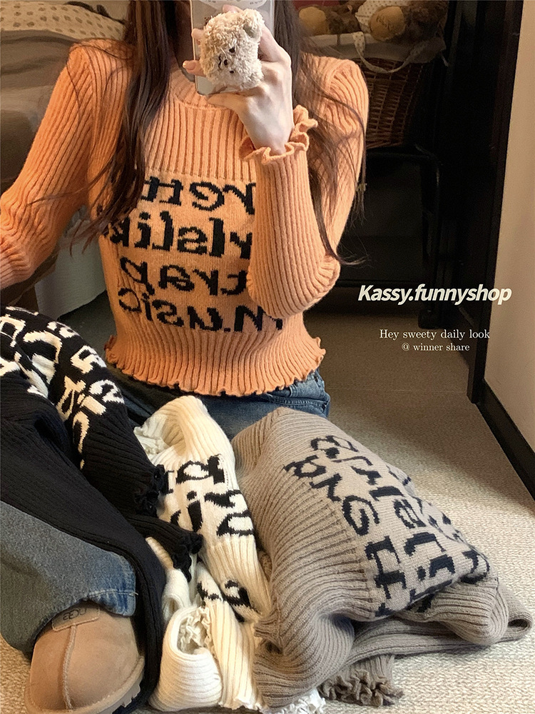 木耳边字母长袖针织衫女2025秋季新款设计感修身显瘦短款内搭毛衣