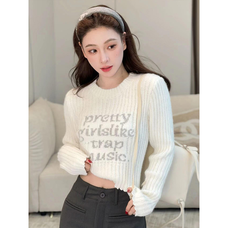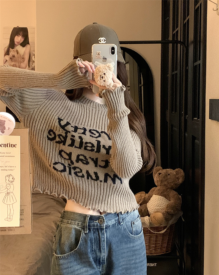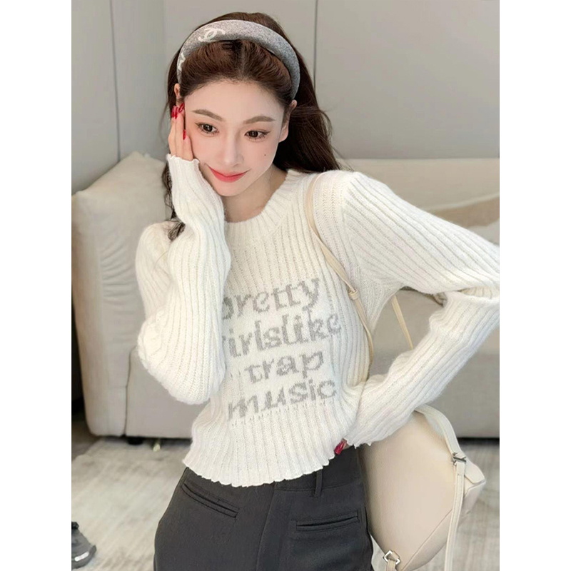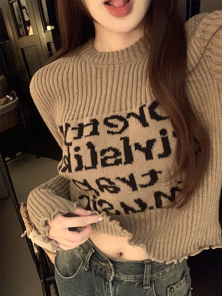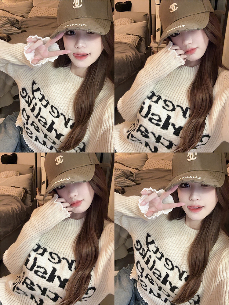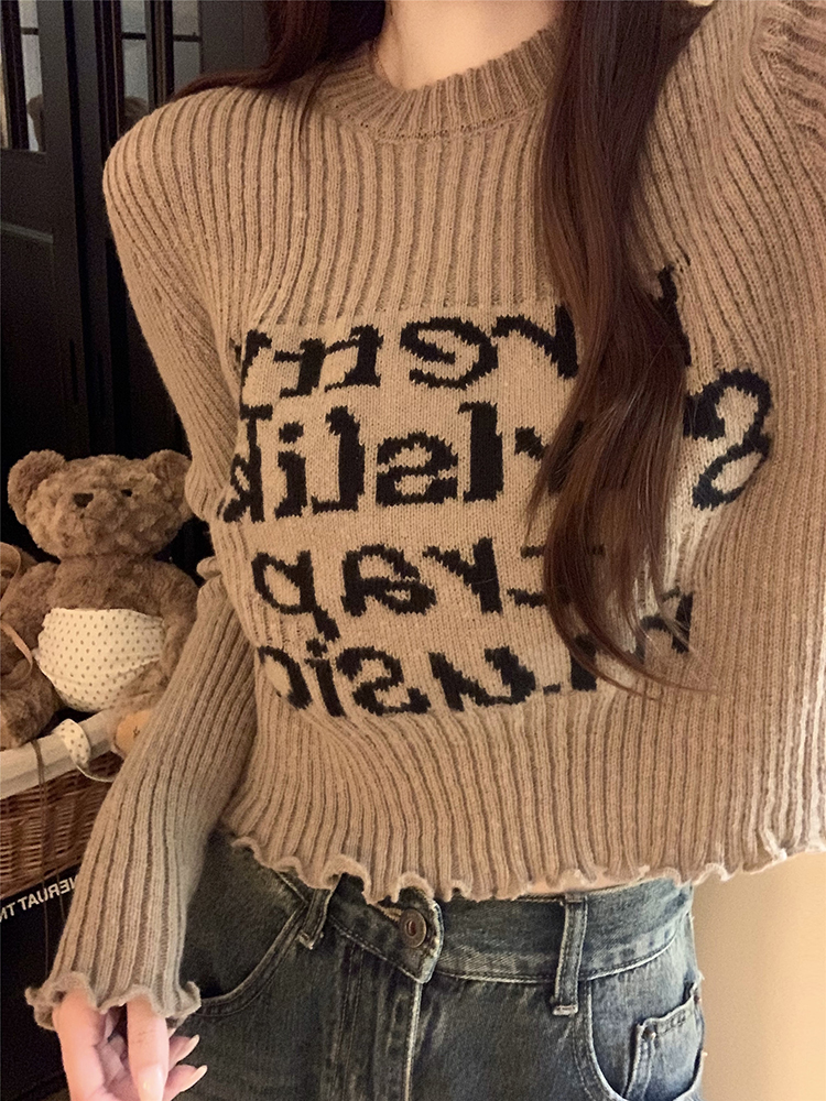 木耳边字母长袖针织衫女2025秋季新款设计感修身显瘦短款内搭毛衣