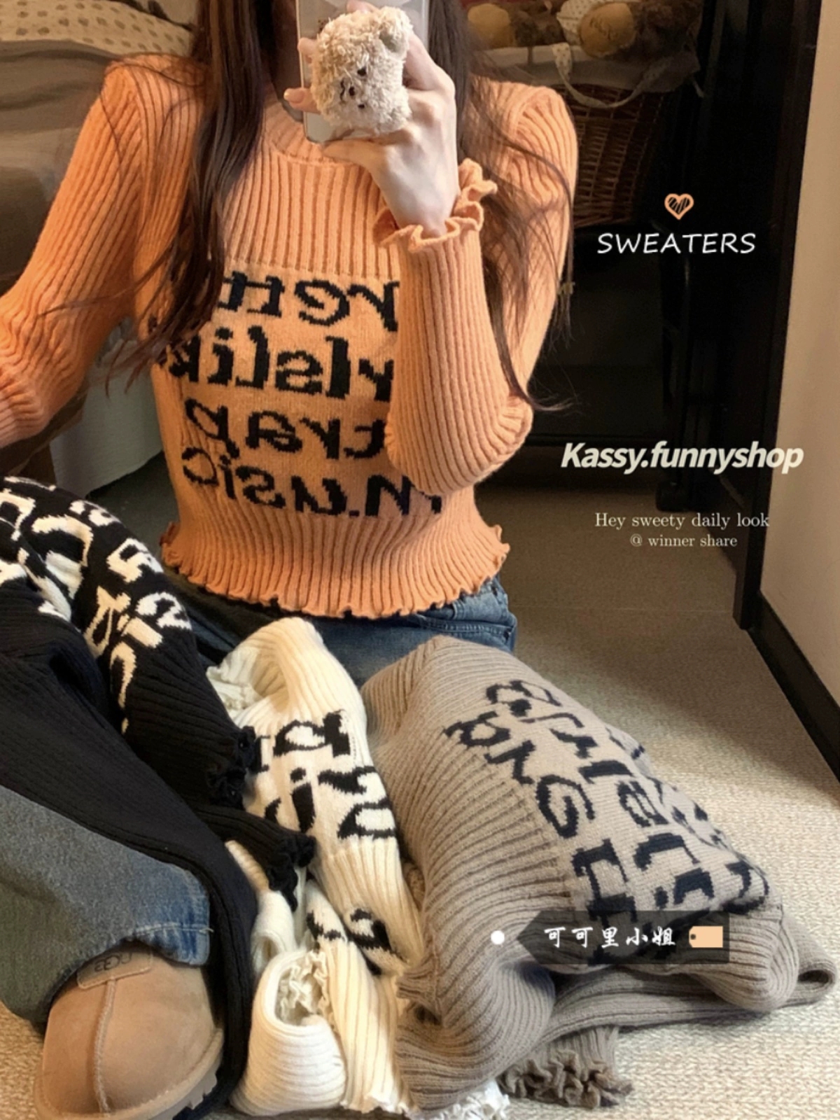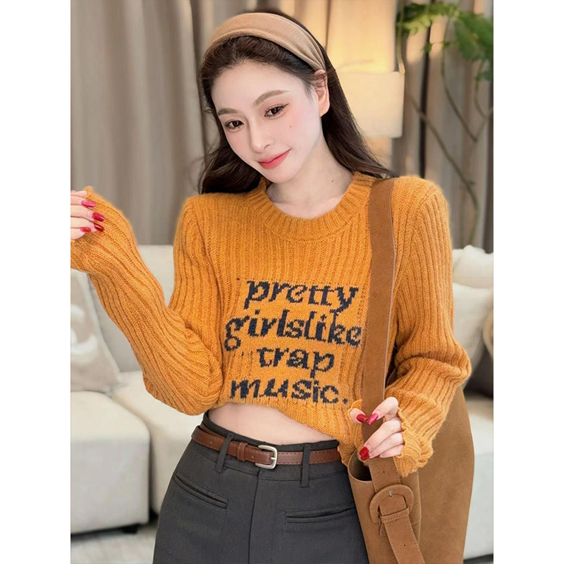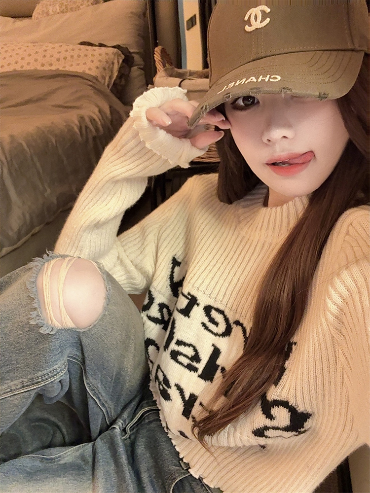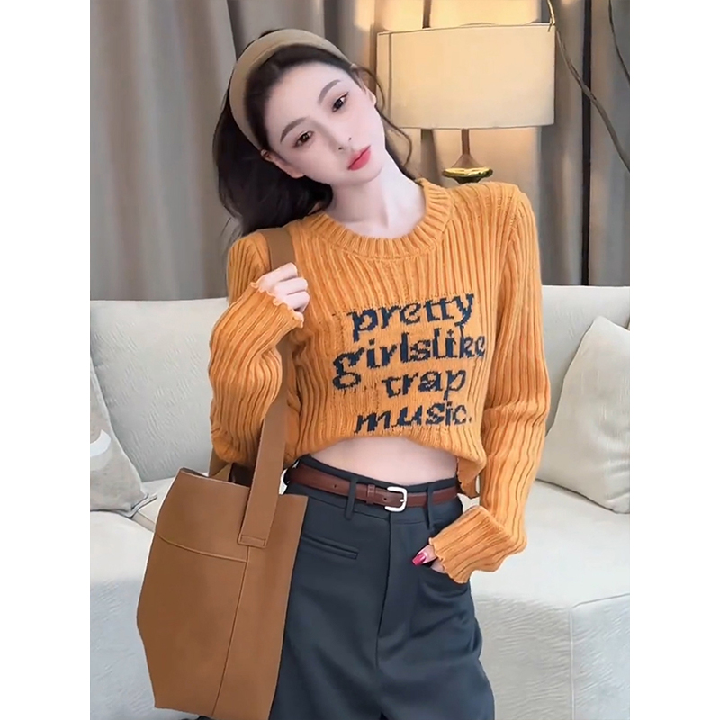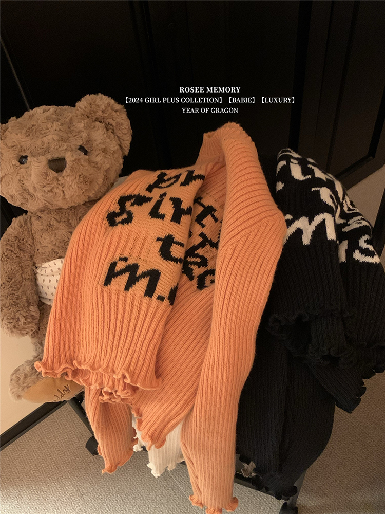 木耳边字母长袖针织衫女2025秋季新款设计感修身显瘦短款内搭毛衣
